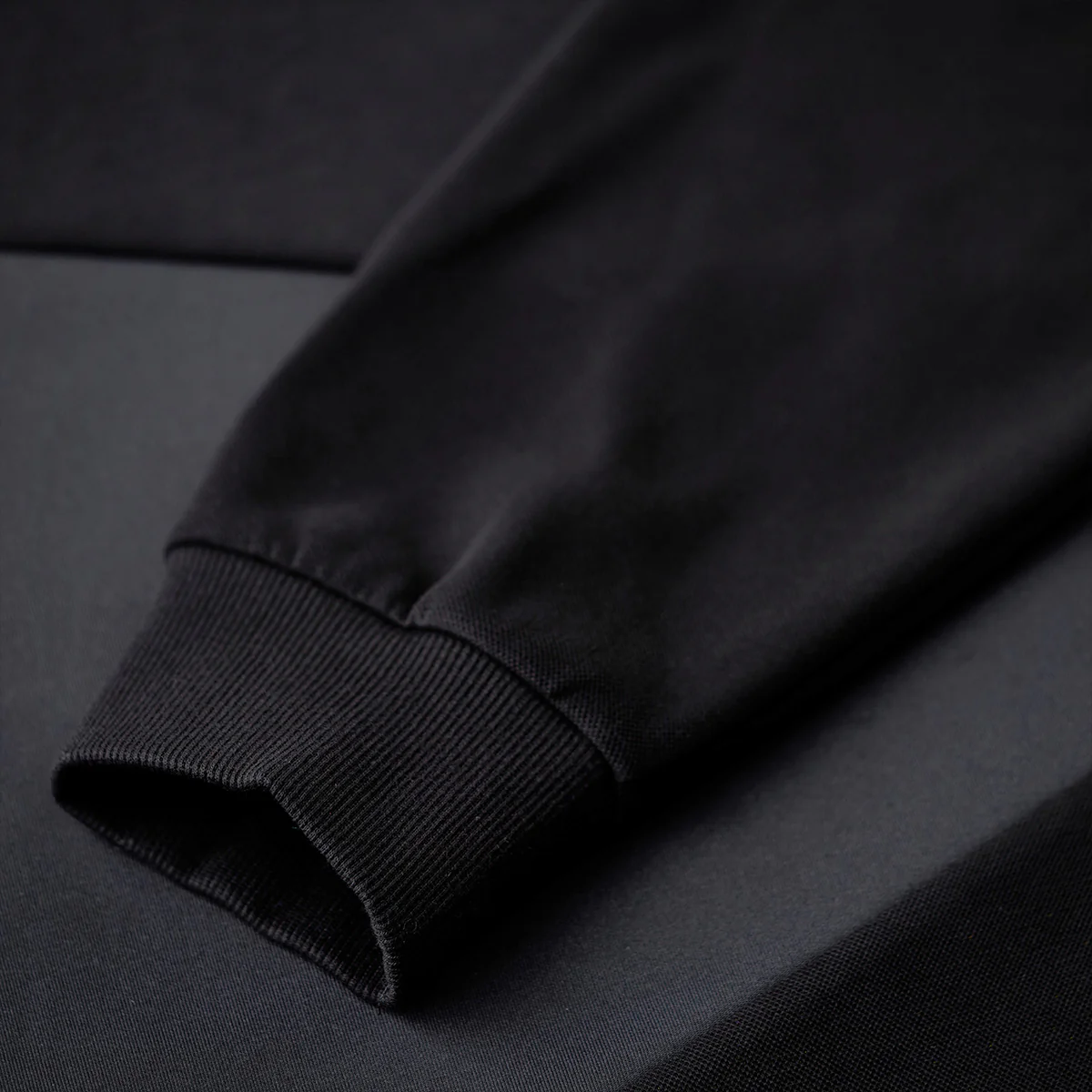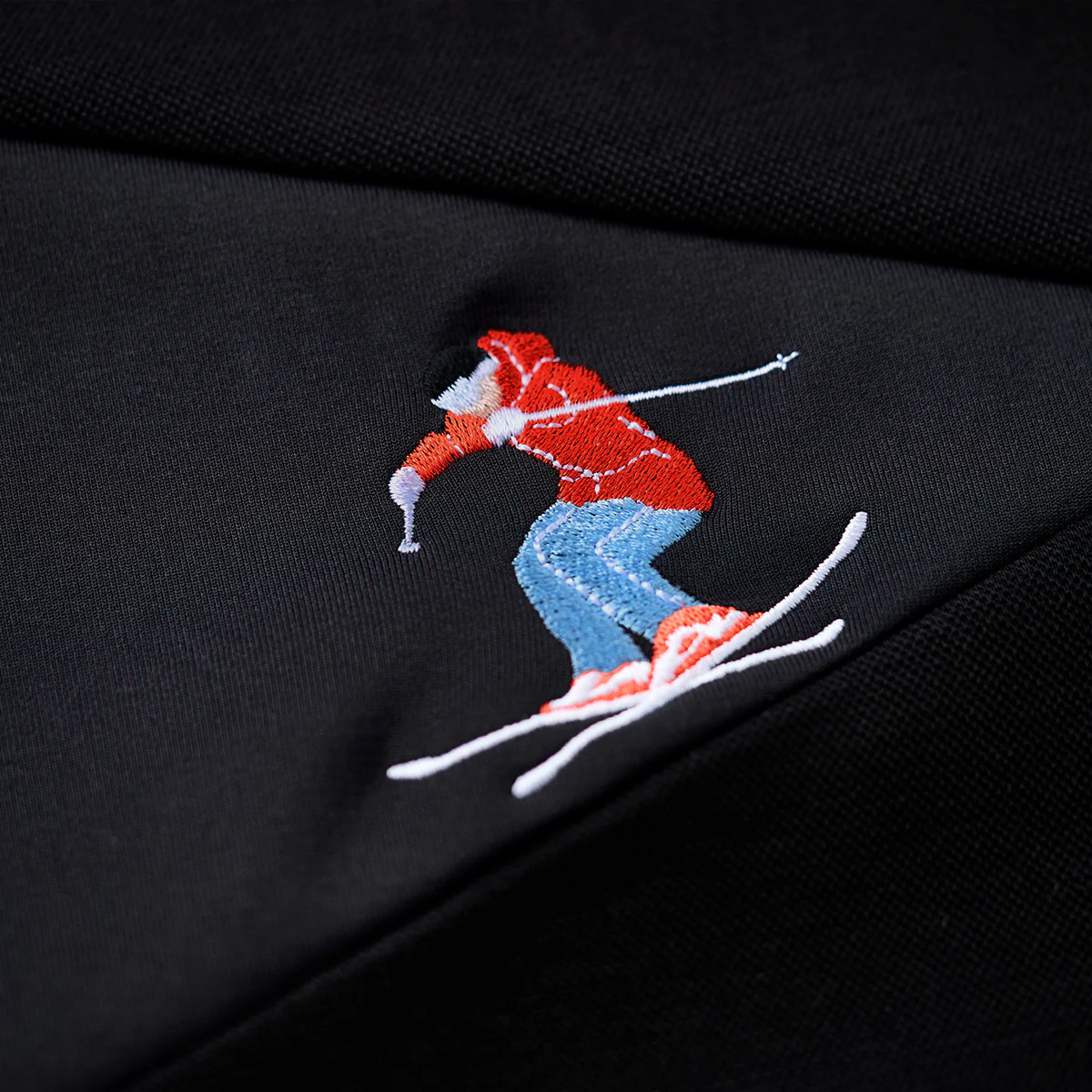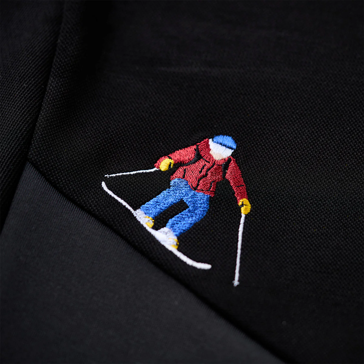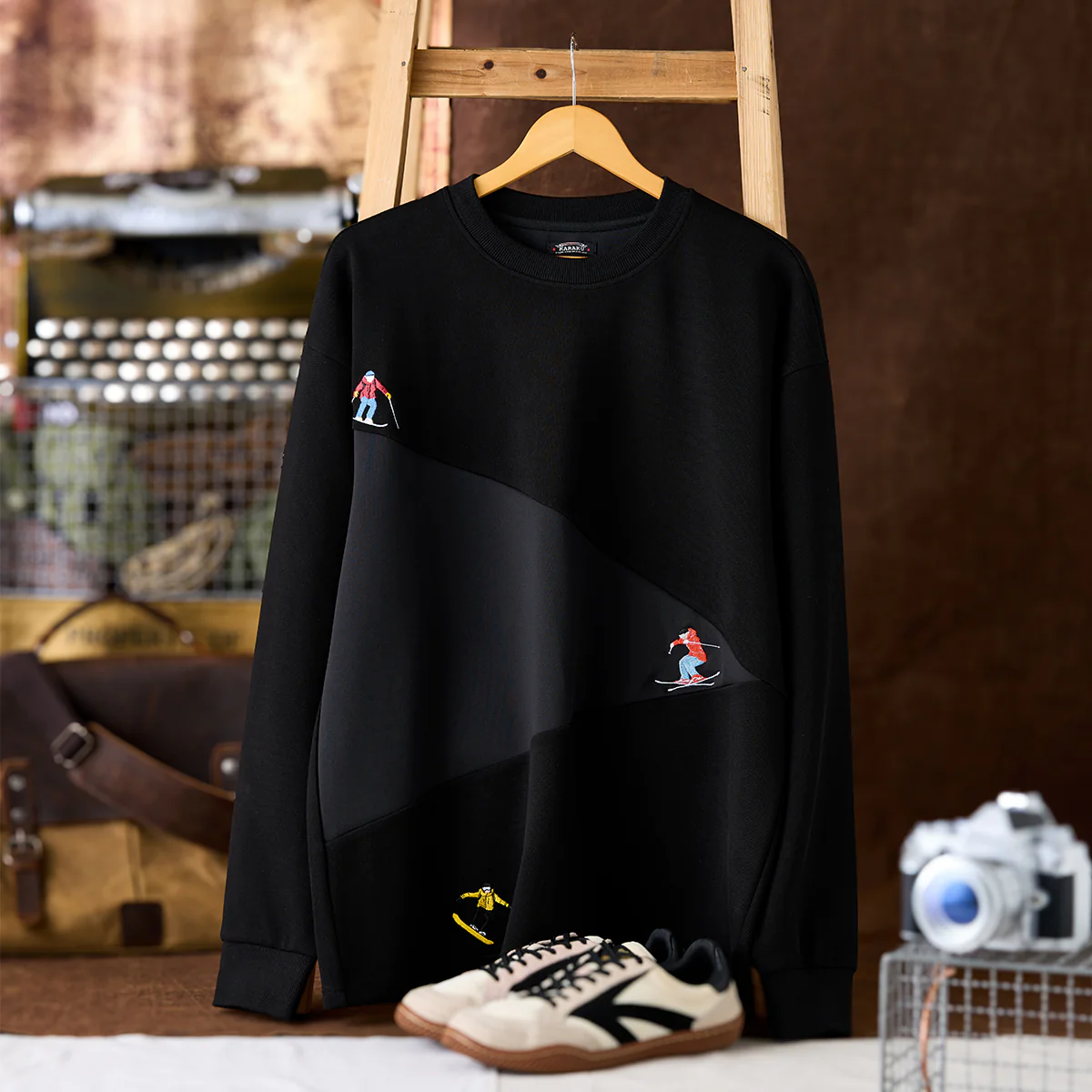大人気の刺繍入りTシャツが長袖で新登場!半袖モデルは清潔感あるホワイト、長袖はシックなブラックで展開。異素材の切り替えで雪山の斜面を表現したユニークな一着です。前身頃には立体感のあるピケ編み生地を採用し、斜めの切り替えラインが雪山の傾斜を想起させるデザインに。その"斜面"には軽やかに滑走するスキーヤーが刺繍で配置され、遊び心のあるディテールがシンプルなTシャツにストーリーを加えます。街でもアウトドアでも映える、“着るグラフィック”を楽しめるアイテムです。