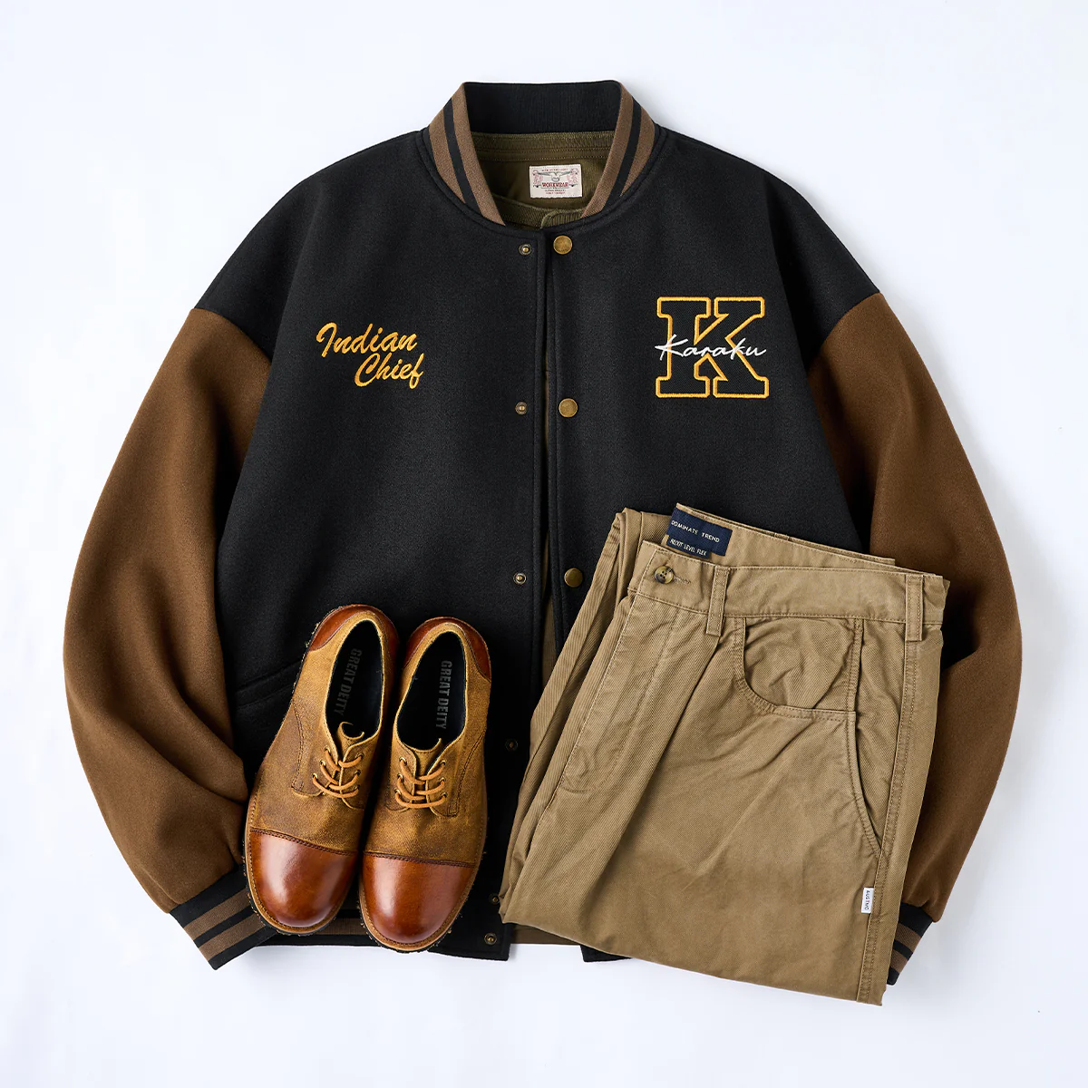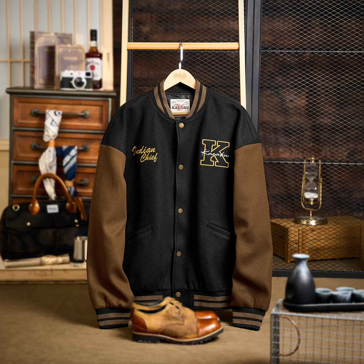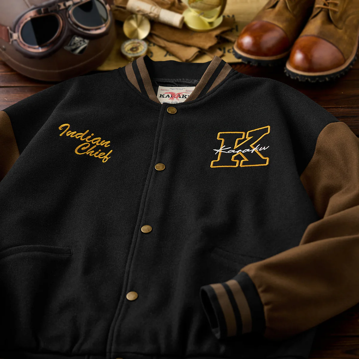 左胸に大きな「K」のワッペンを中心に据え、内側に「Karaku」と書かれています。配色は黄色のアウトラインで強調され、視認性が高くスポーティな印象を与えます。右胸に「Indian Chief」と刺繍されて、上品で温かみのある配色になって、全体のコンセプトに一貫性を持たせています。