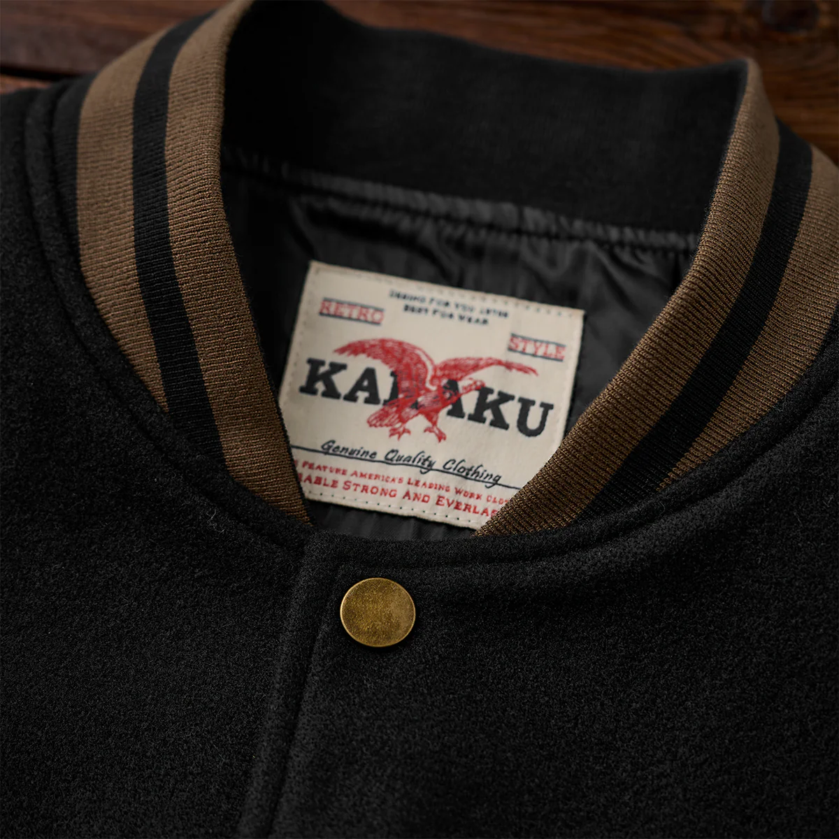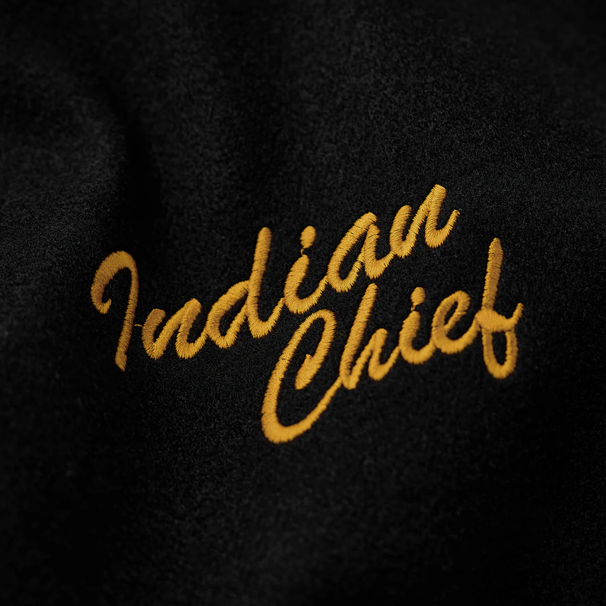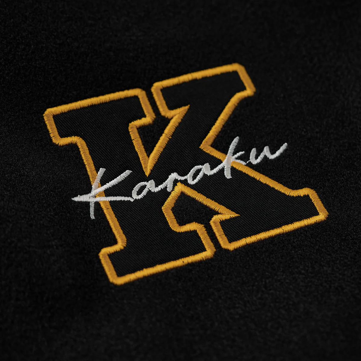 左胸に大きな「K」のワッペンを中心に据え、内側に「Karaku」と書かれています。配色は黄色のアウトラインで強調され、視認性が高くスポーティな印象を与えます。右胸に「Indian Chief」と刺繍されて、上品で温かみのある配色になって、全体のコンセプトに一貫性を持たせています。