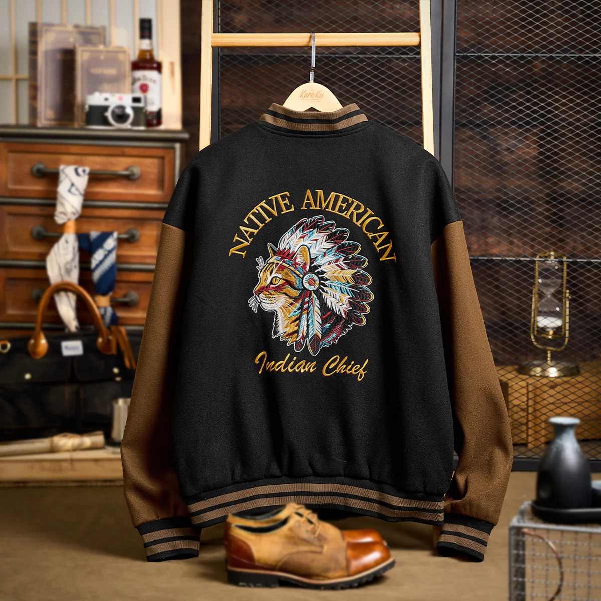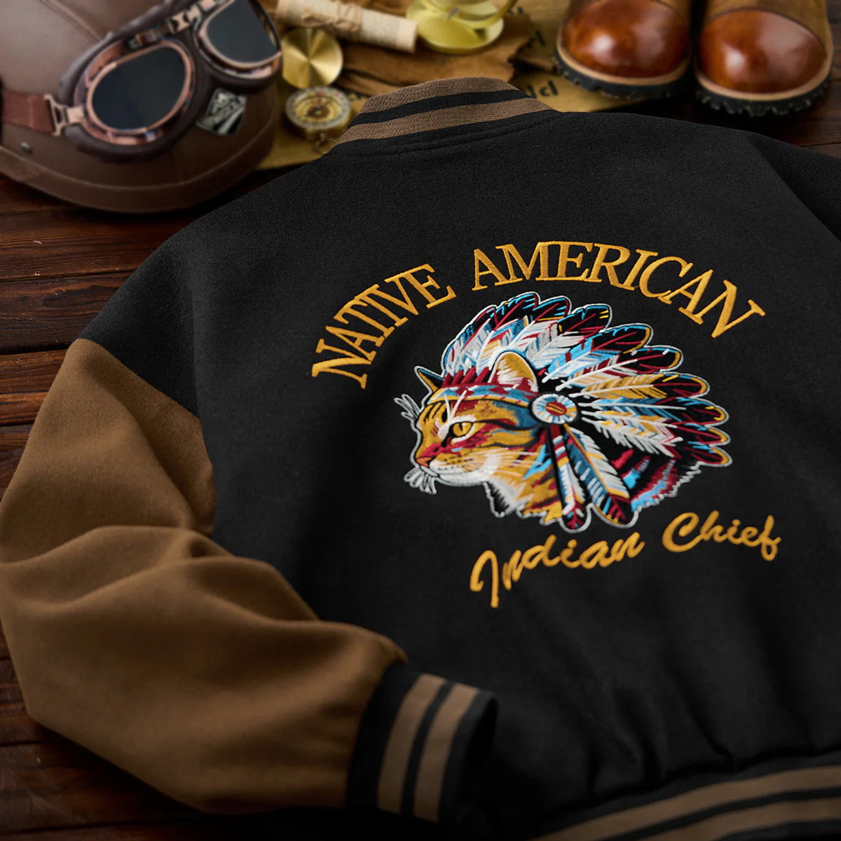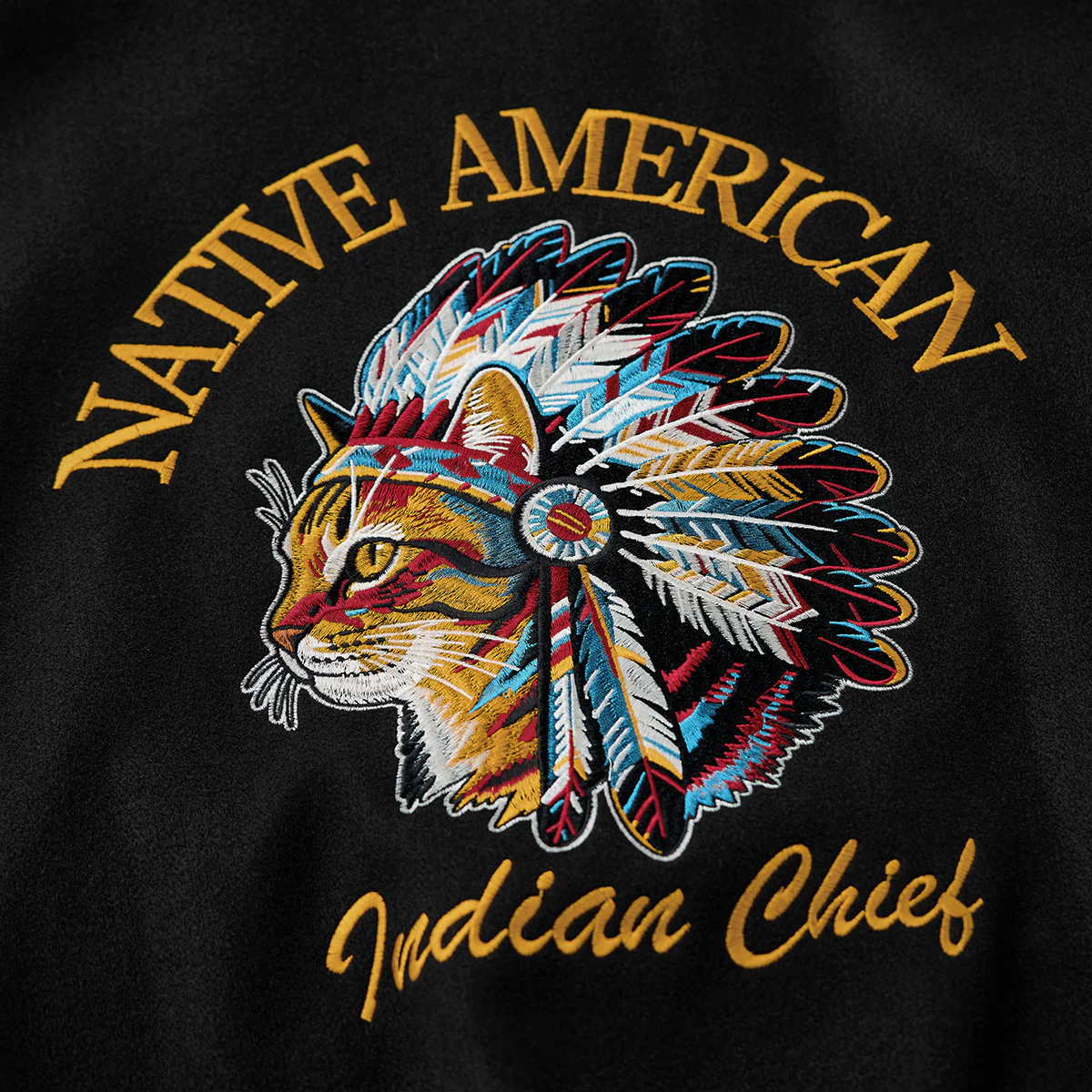 バック中央に猫がインディアンの酋長のヘッドドレスを身に着けているユニークなデザイン。「Native American」と「Indian Chief」の文字が上下に配置され、全体を引き締めています。