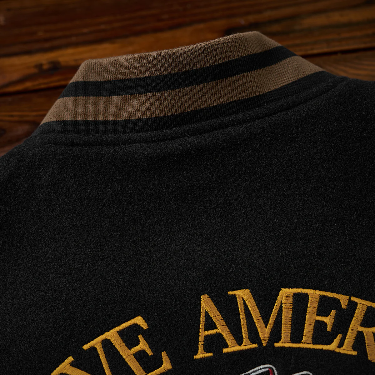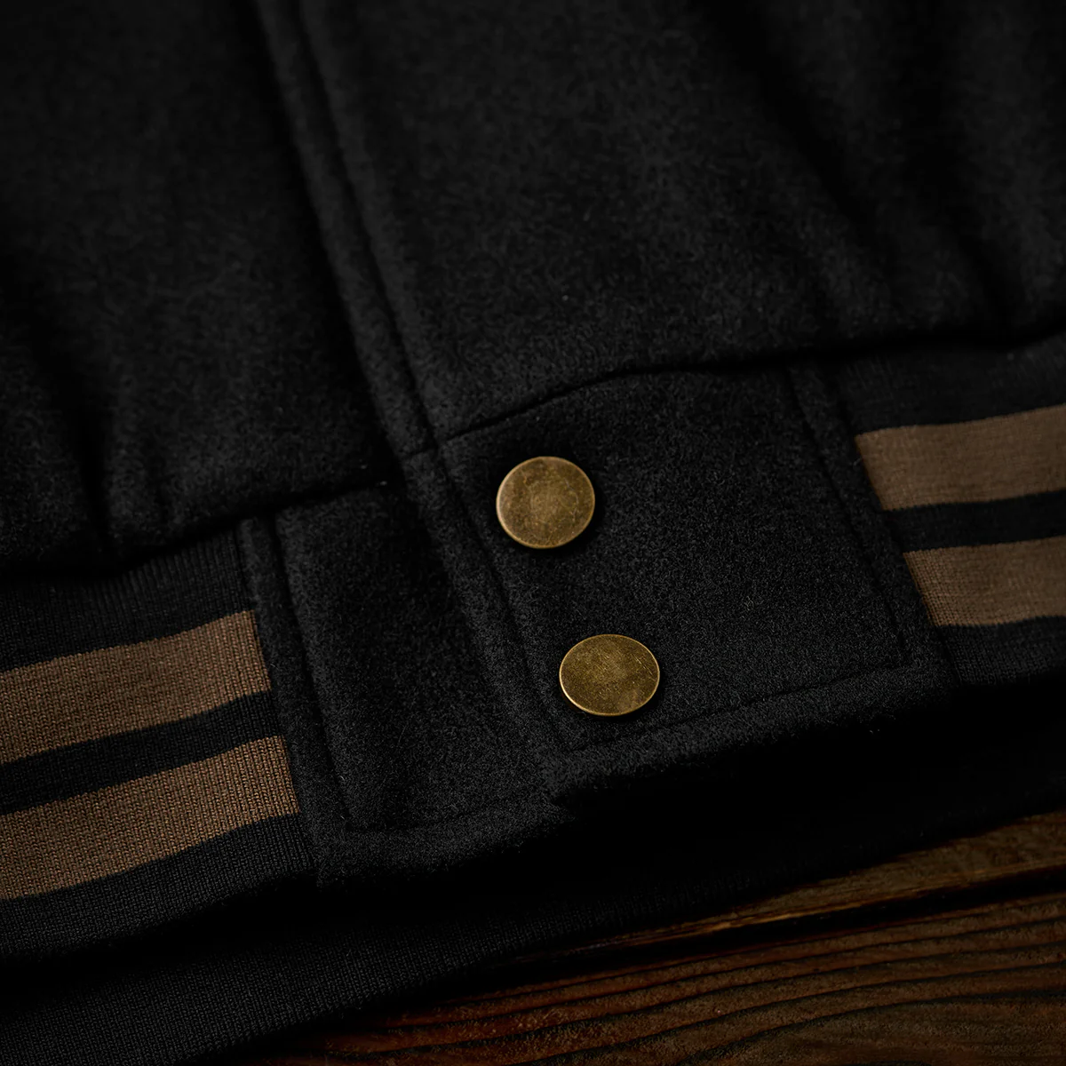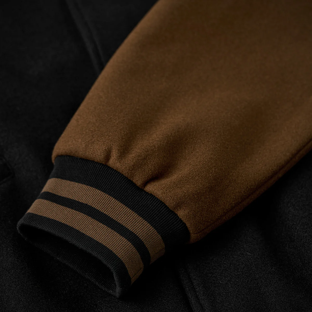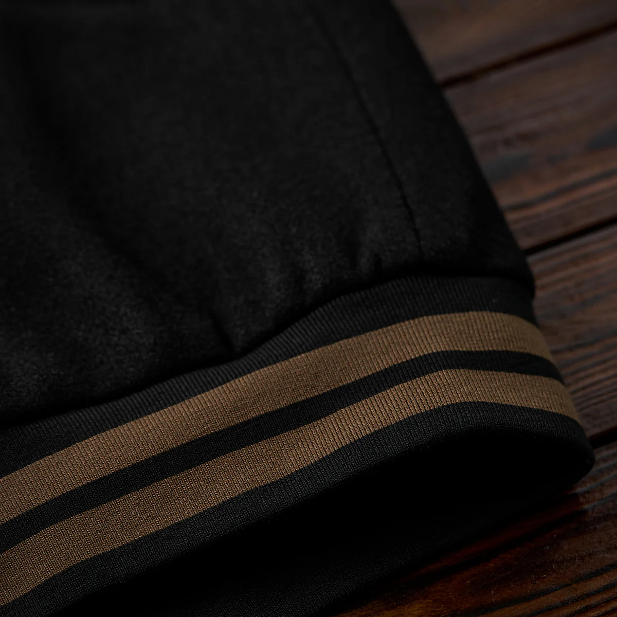 袖口、裾、襟元のリブはブラウンとブラックのボーダーで構成されて、スポーティな要素を加えつつ、全体のデザインを引き締める役割を果たしている。