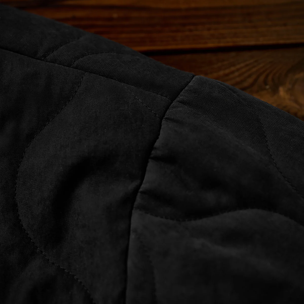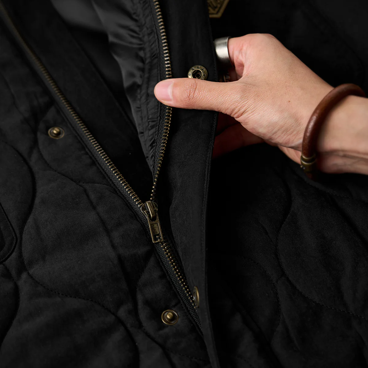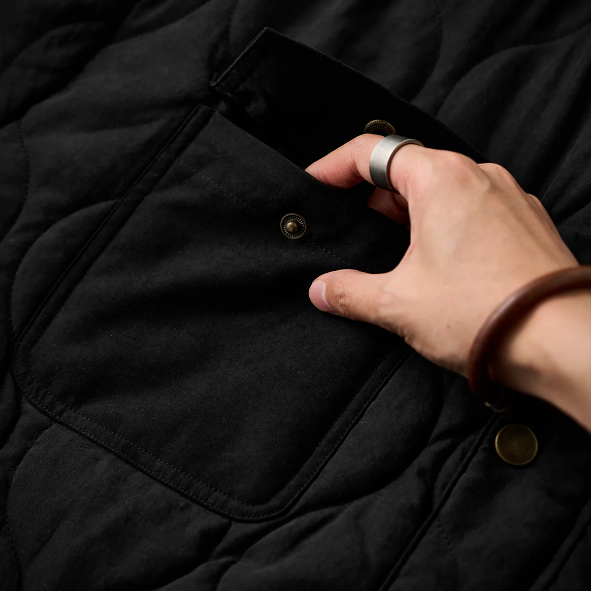 やわらかな手触りが魅力のピーチスキン生地を使用した、ひょうたんキルティング仕様のミリタリージャケット。襟にはコーデュロイ素材を切り替え、シーズンムード漂う上品なアクセントをプラスしました。フロントには収納力の高い4つのリベット付きポケットを配置し、機能性とデザイン性を両立。中綿入りで保温性にも優れ、軽く羽織るだけで暖かさをキープします。カジュアルからアウトドアまで幅広く対応できる、万能な秋冬アウターです。
