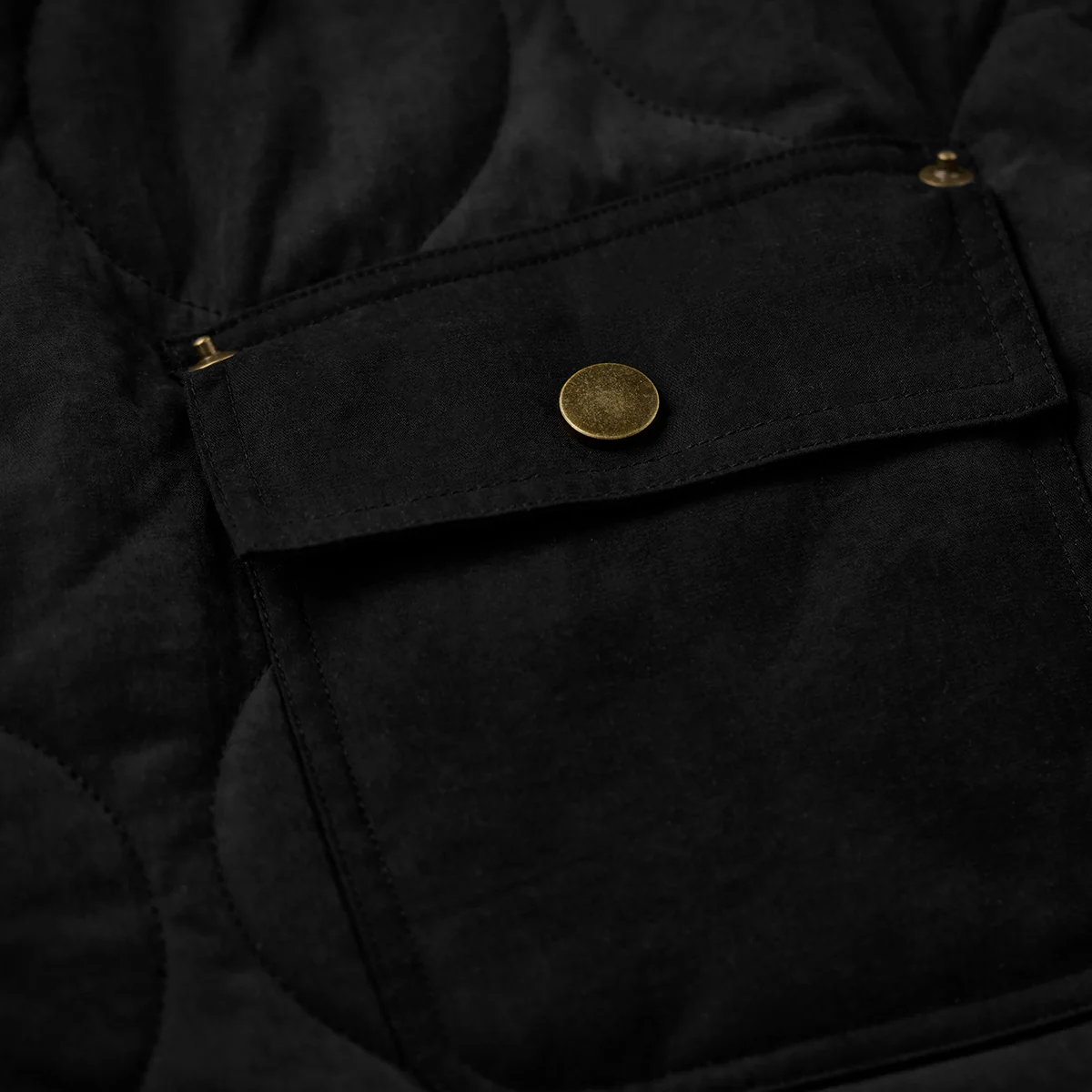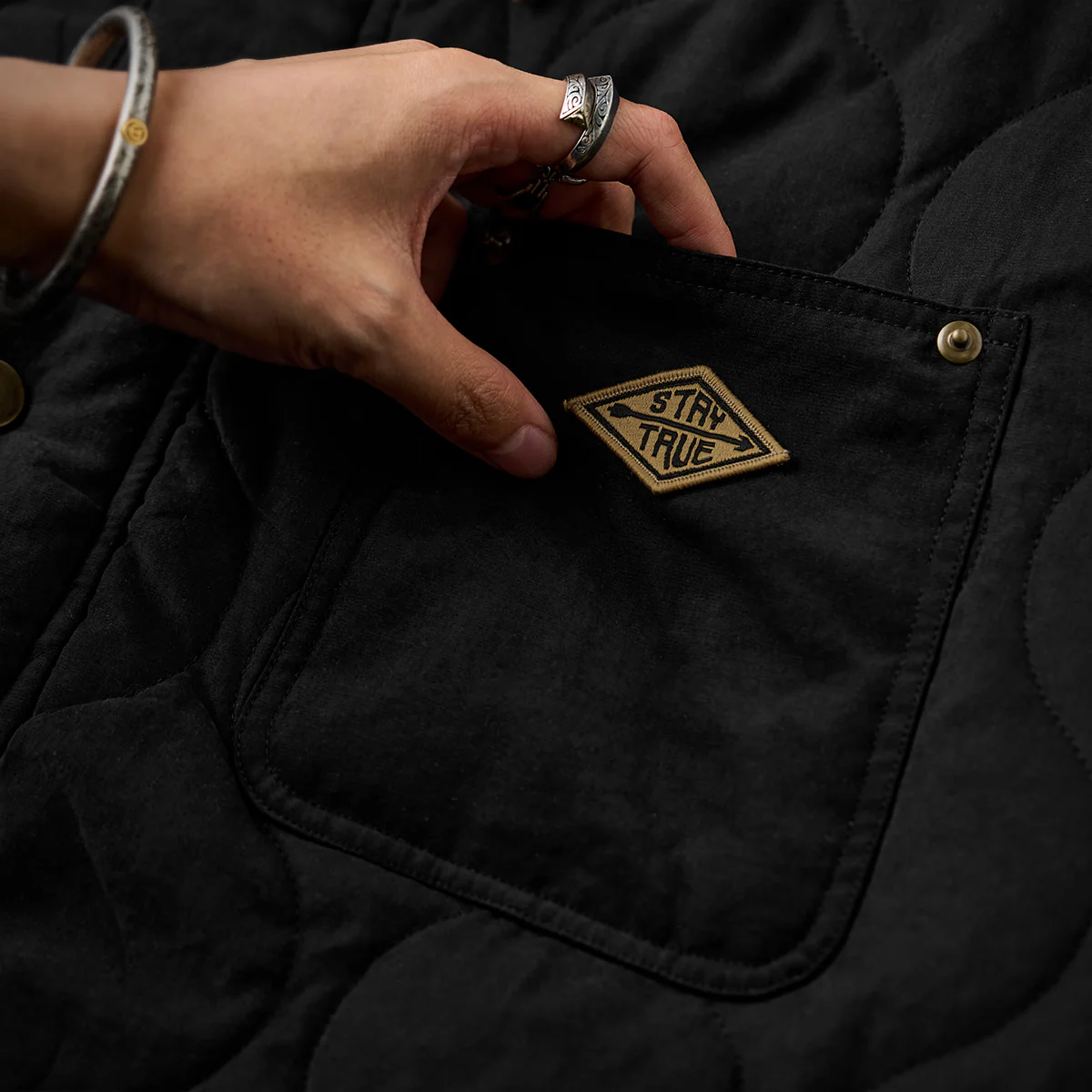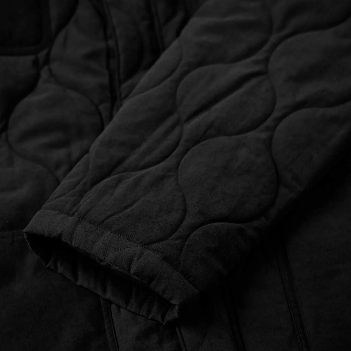 やわらかな手触りが魅力のピーチスキン生地を使用した、ひょうたんキルティング仕様のミリタリージャケット。襟にはコーデュロイ素材を切り替え、シーズンムード漂う上品なアクセントをプラスしました。フロントには収納力の高い4つのリベット付きポケットを配置し、機能性とデザイン性を両立。中綿入りで保温性にも優れ、軽く羽織るだけで暖かさをキープします。カジュアルからアウトドアまで幅広く対応できる、万能な秋冬アウターです。