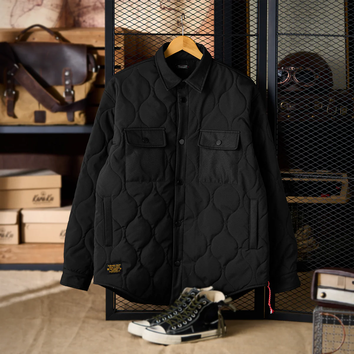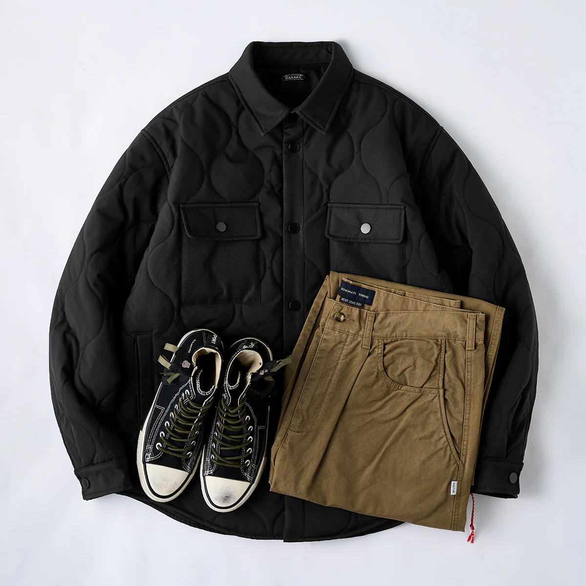 程よい光沢感と高級感のある風合いが持ち味のポリエステルを採用しており、武骨さと耐久性があり、実用的な機能美が魅力的です。中綿が入っているため、保温性が高く、寒い季節でも暖かく着用できます。