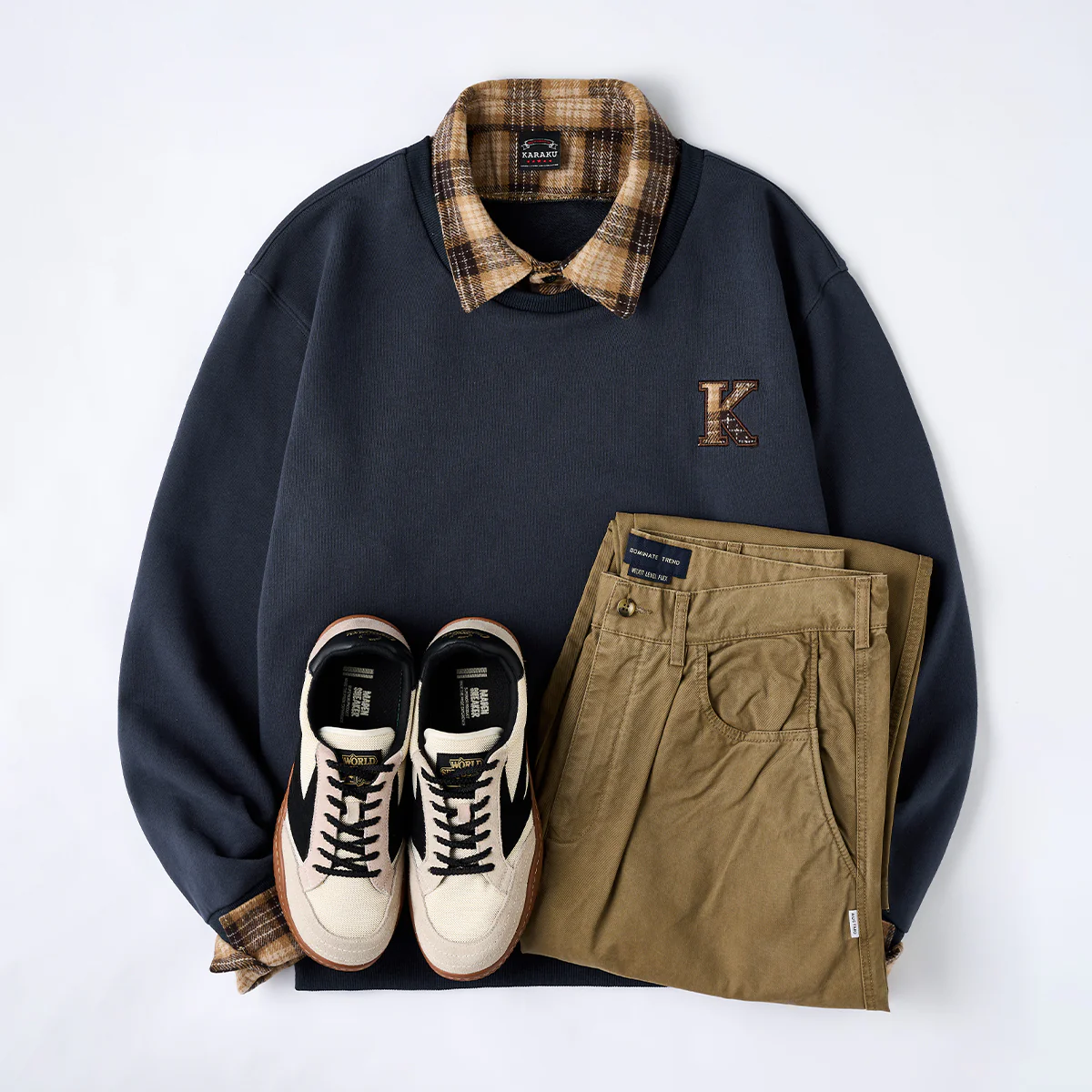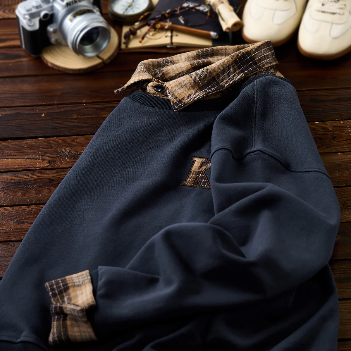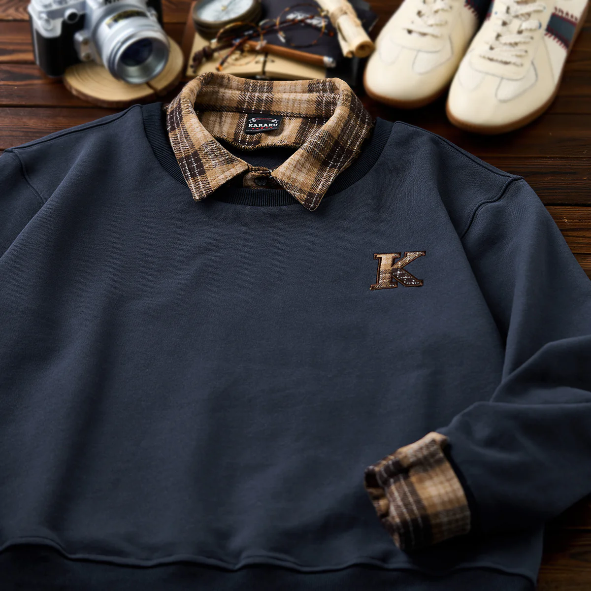 クラシックなシルエットとトレンド感を融合させたフェイクレイヤードデザインのスウェットシャツ。ネイビーカラーを基調にした360gの裏毛コットン素材を使用し、適度な厚みと柔らかな着心地を実現しています。ユニークなポイントとして、ブラウンの起毛感のあるチェック柄シャツ生地を巧みに切り替えで配置。レイヤードスタイルを簡単に演出できるデザインで、コーディネートに奥行きをプラスします。胸元には「K」のアルファベットをパッチワーク刺繍で表現し、遊び心あふれるアクセントを添えました。カジュアルな日常使いはもちろん、スポーティな着こなしやトレンドを意識したスタイルにもマッチします。