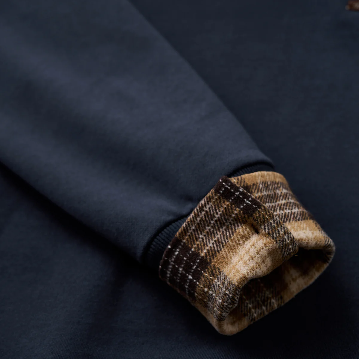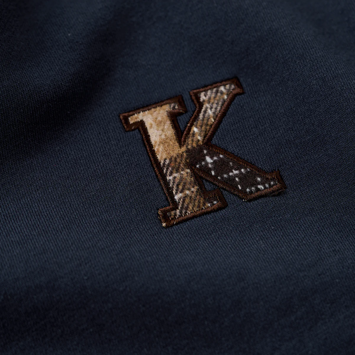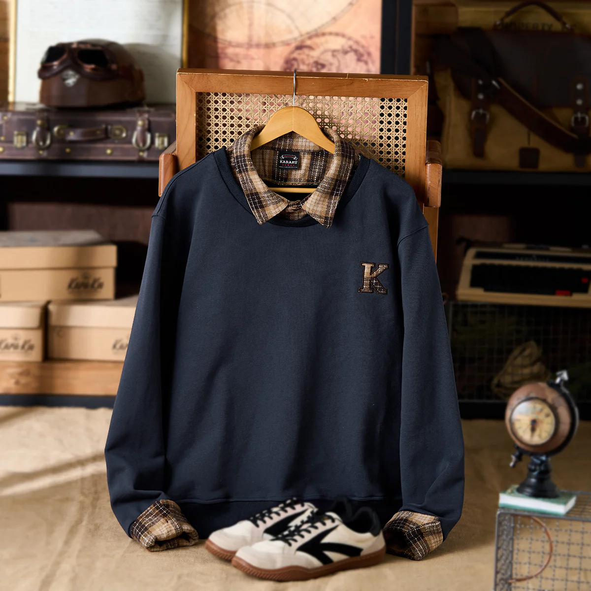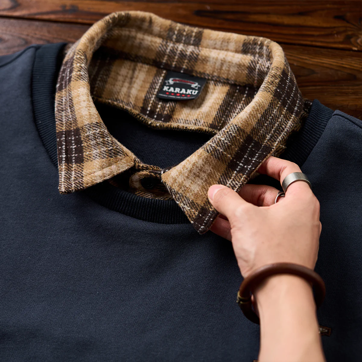 クラシックなシルエットとトレンド感を融合させたフェイクレイヤードデザインのスウェットシャツ。ネイビーカラーを基調にした360gの裏毛コットン素材を使用し、適度な厚みと柔らかな着心地を実現しています。ユニークなポイントとして、ブラウンの起毛感のあるチェック柄シャツ生地を巧みに切り替えで配置。レイヤードスタイルを簡単に演出できるデザインで、コーディネートに奥行きをプラスします。胸元には「K」のアルファベットをパッチワーク刺繍で表現し、遊び心あふれるアクセントを添えました。カジュアルな日常使いはもちろん、スポーティな着こなしやトレンドを意識したスタイルにもマッチします。
