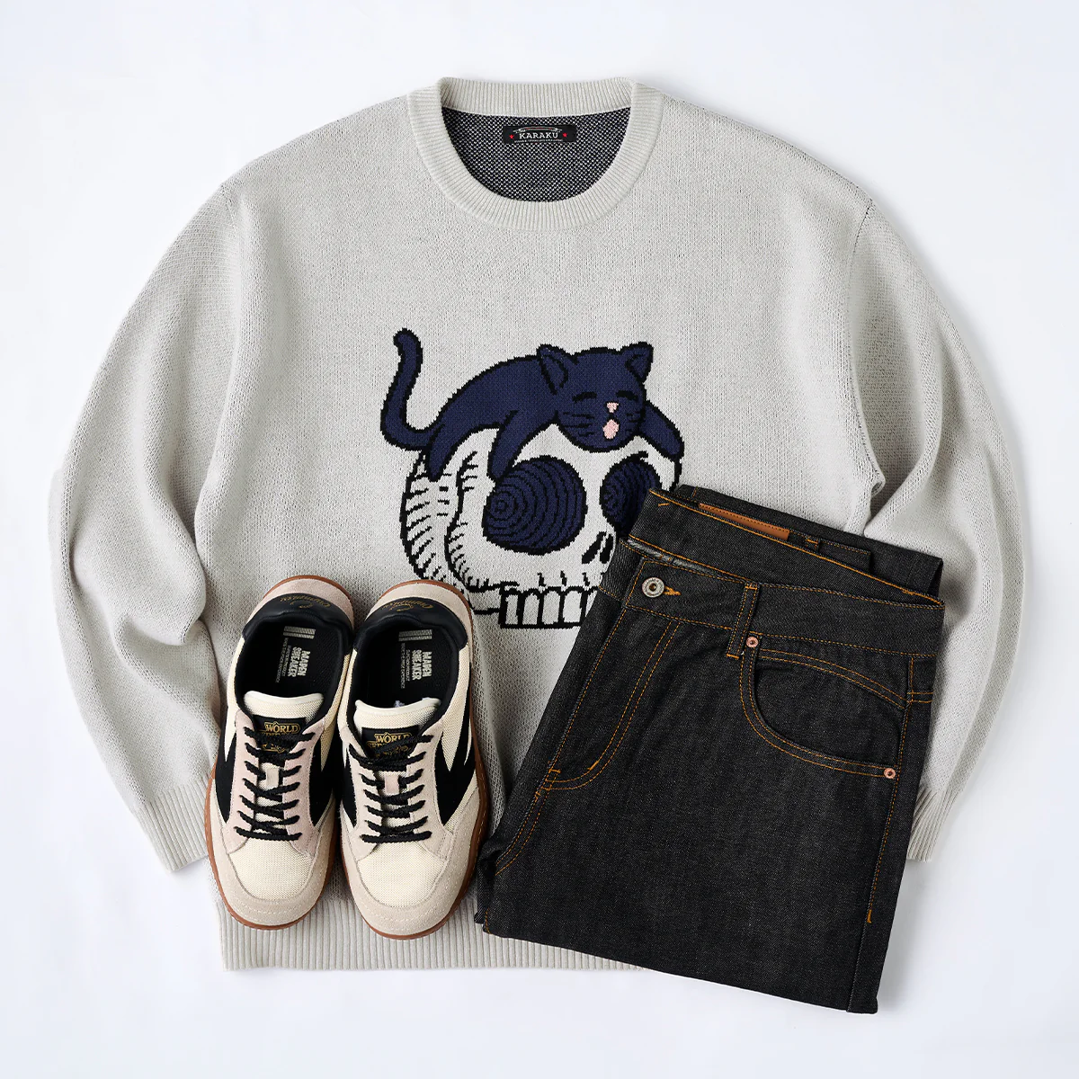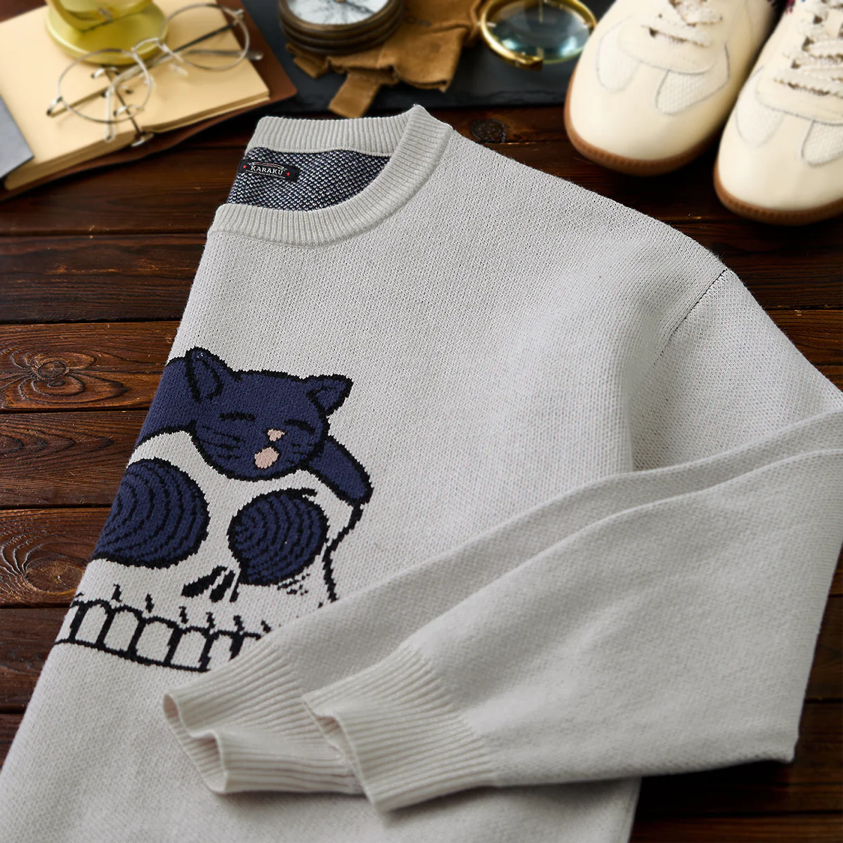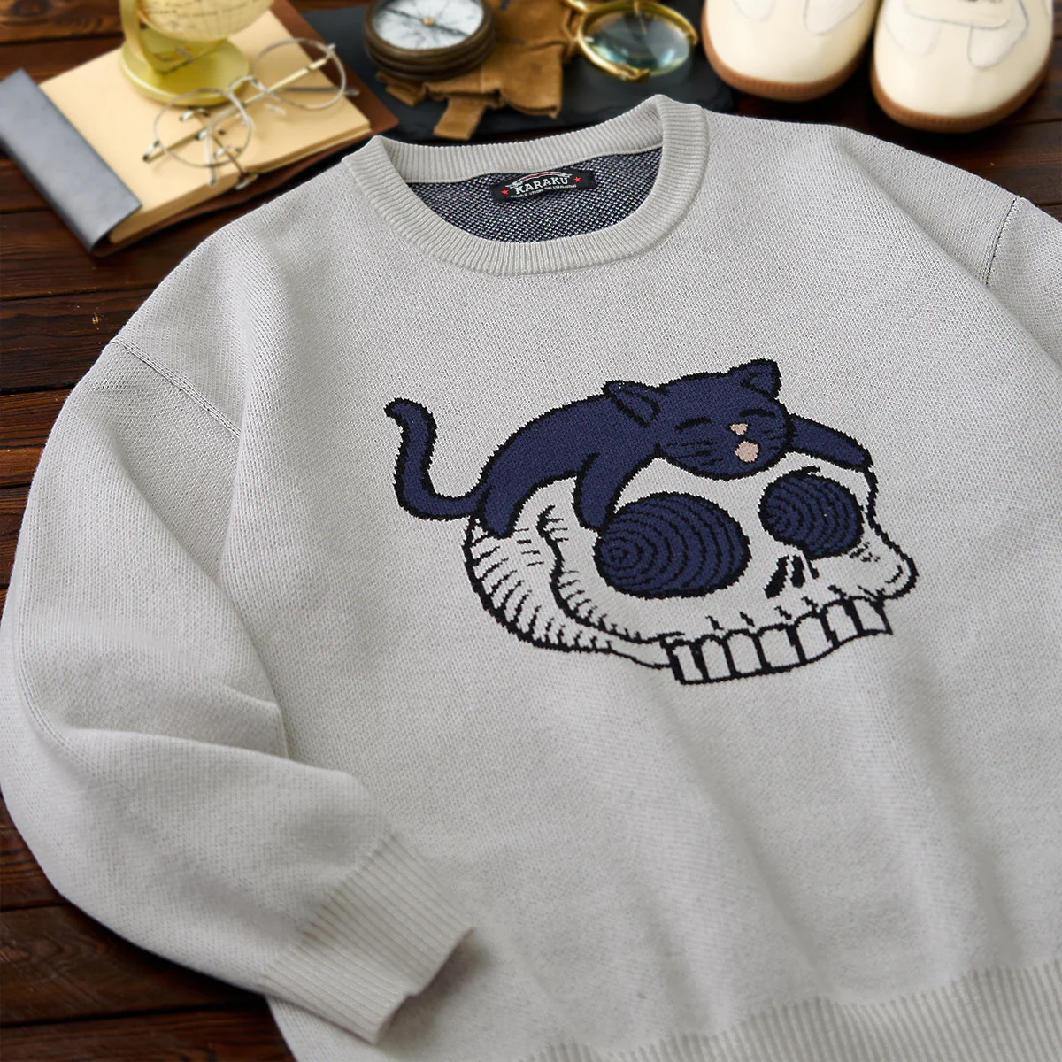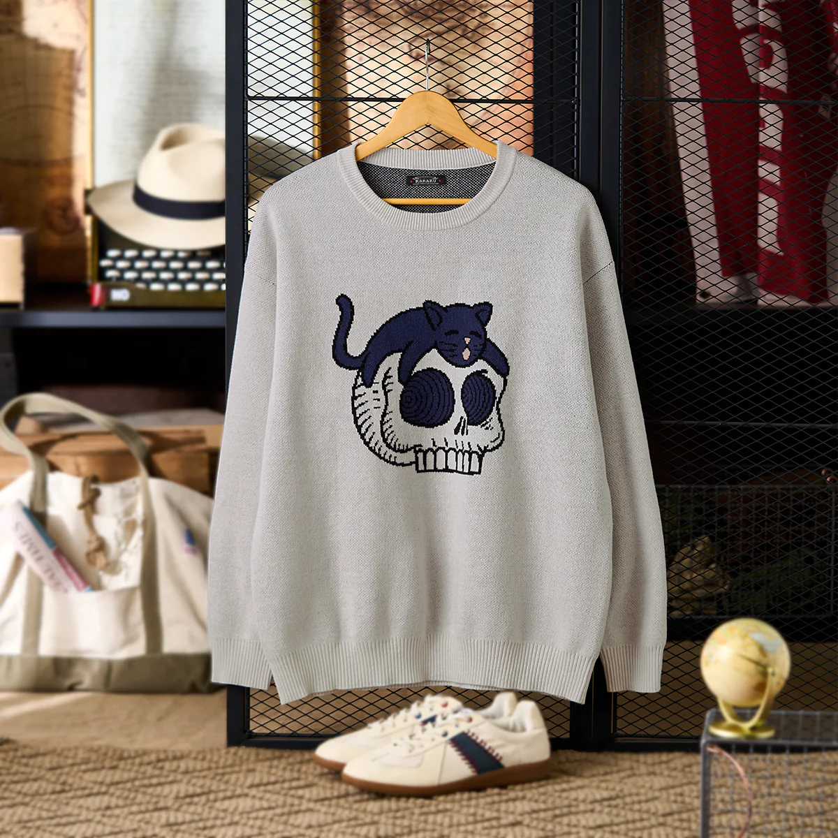 • 「スカルの上に寝そべり黒猫」ポップアート風ジャガードニットセーター