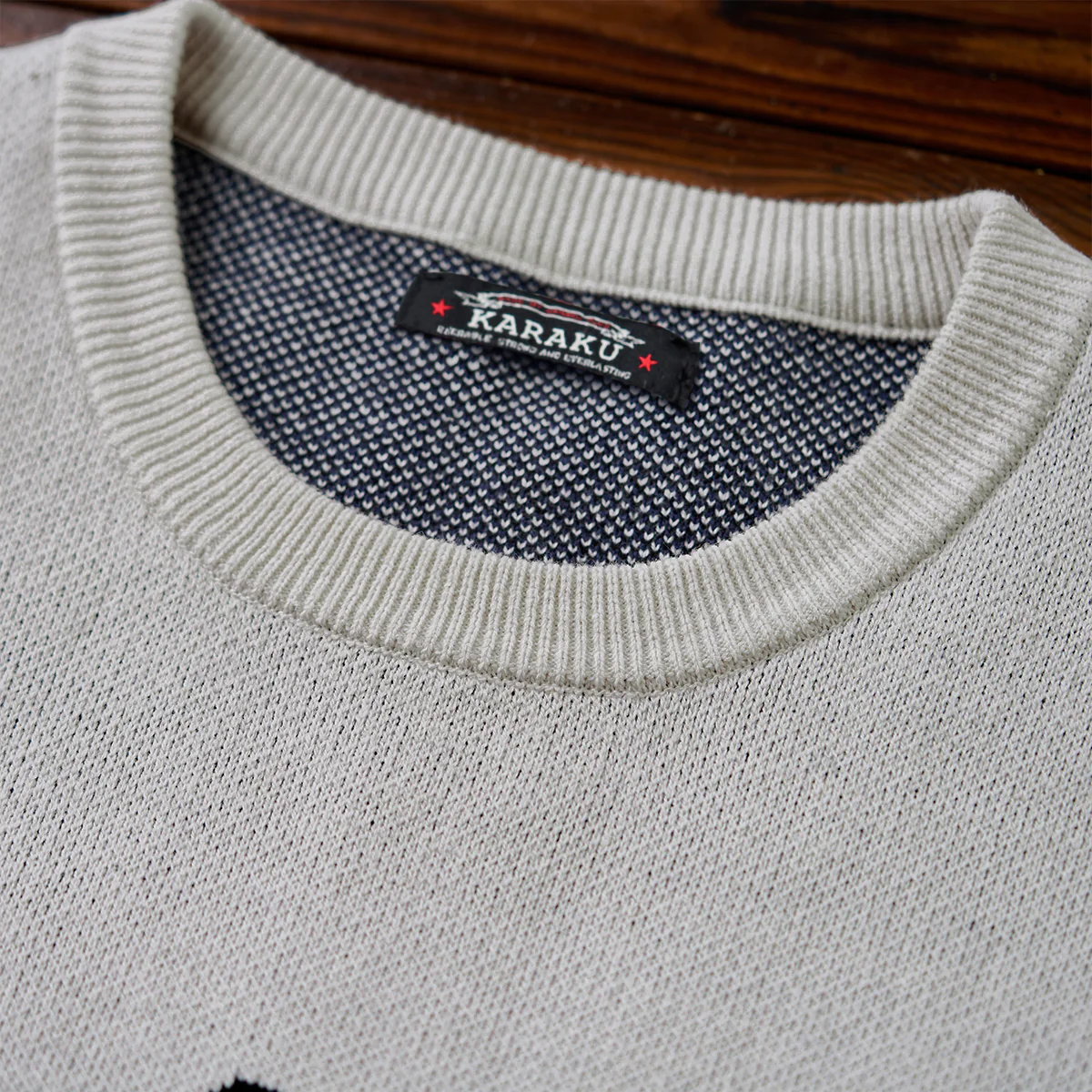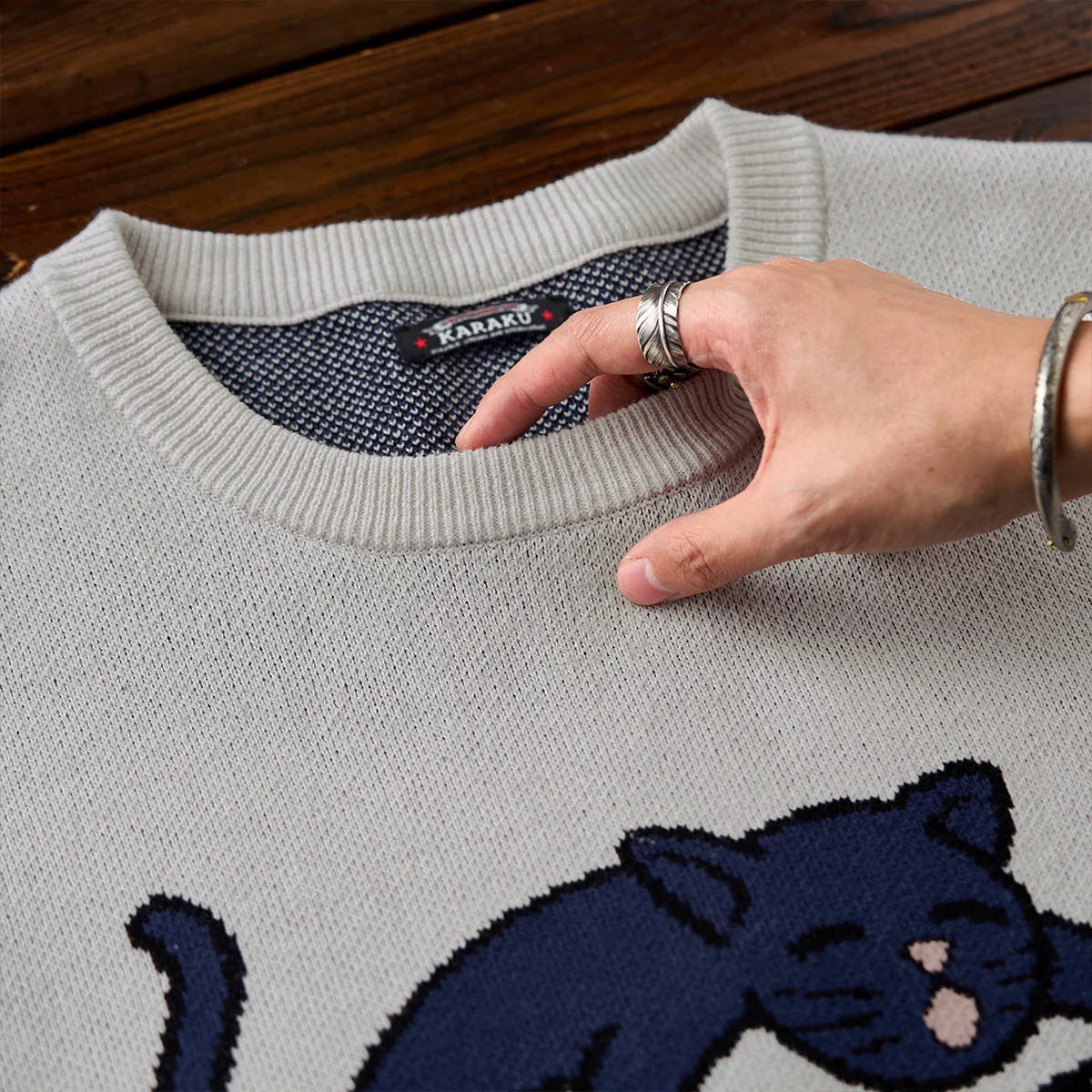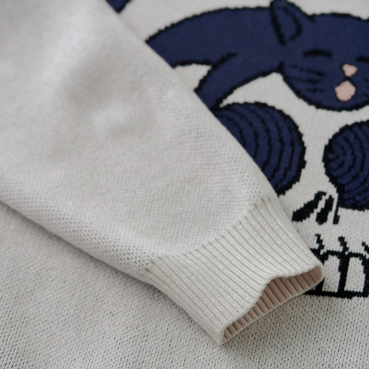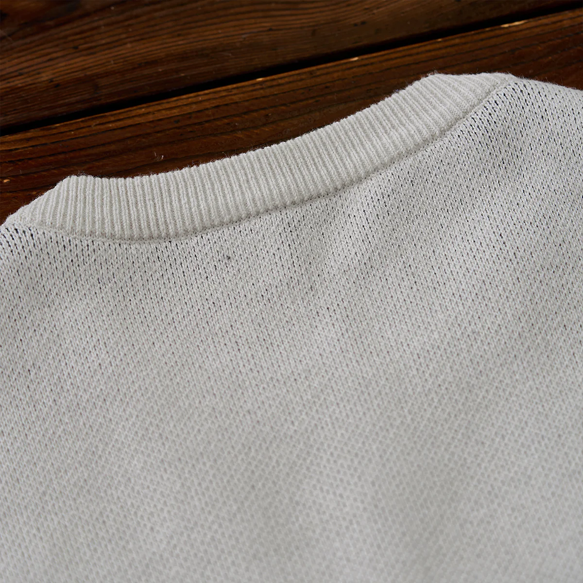 丸い襟元は、首周りを締め付けず、カジュアルかつリラックスした印象を与えます。袖口と裾にはリブ編みが施されて、フィット感を向上させています。
