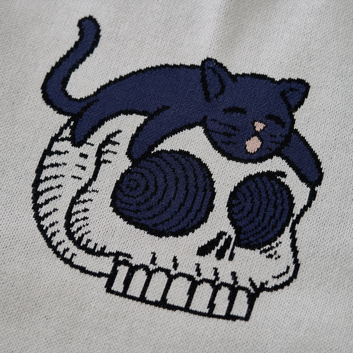 「スカルの上に寝そべり黒猫」ポップアート風ジャガードニットセーター