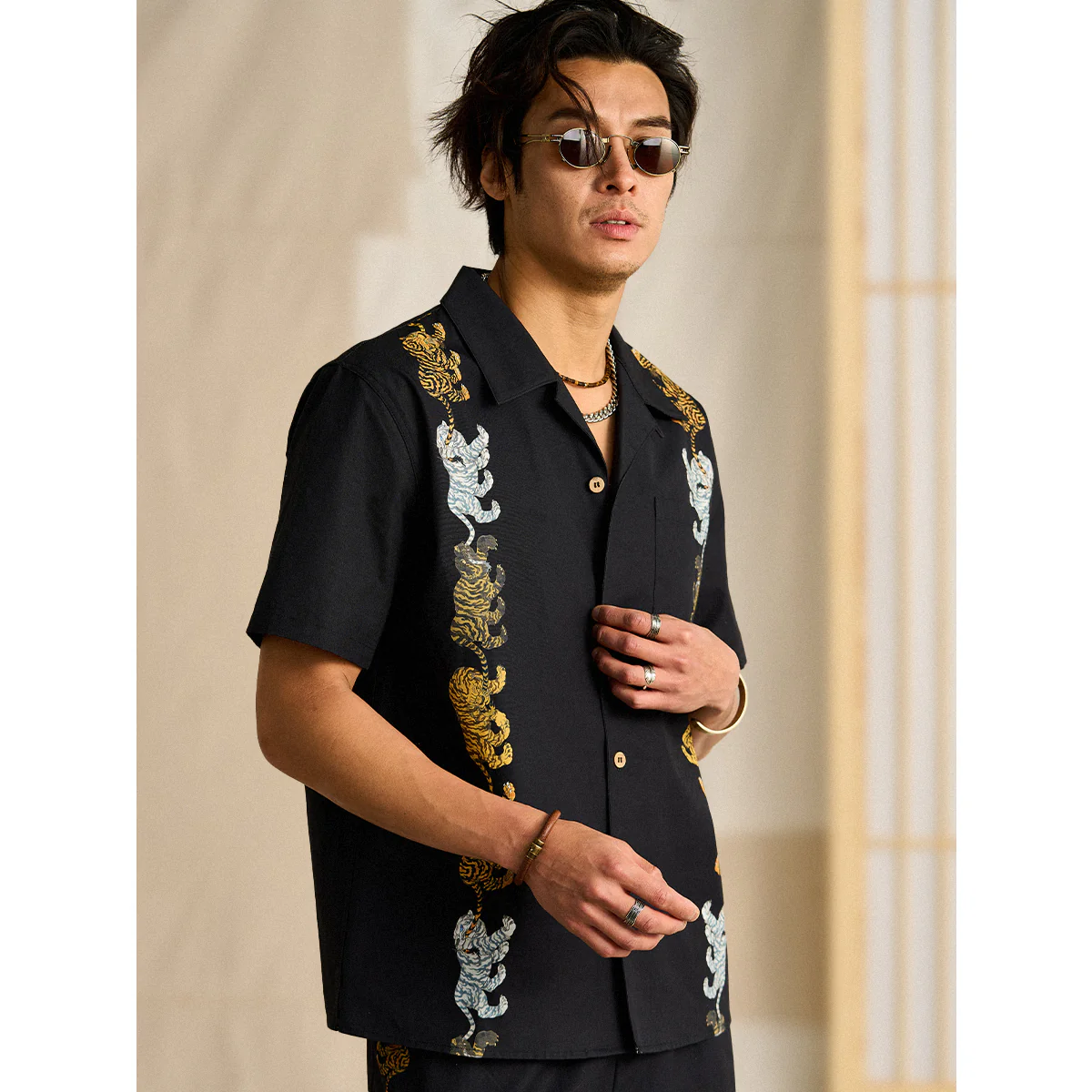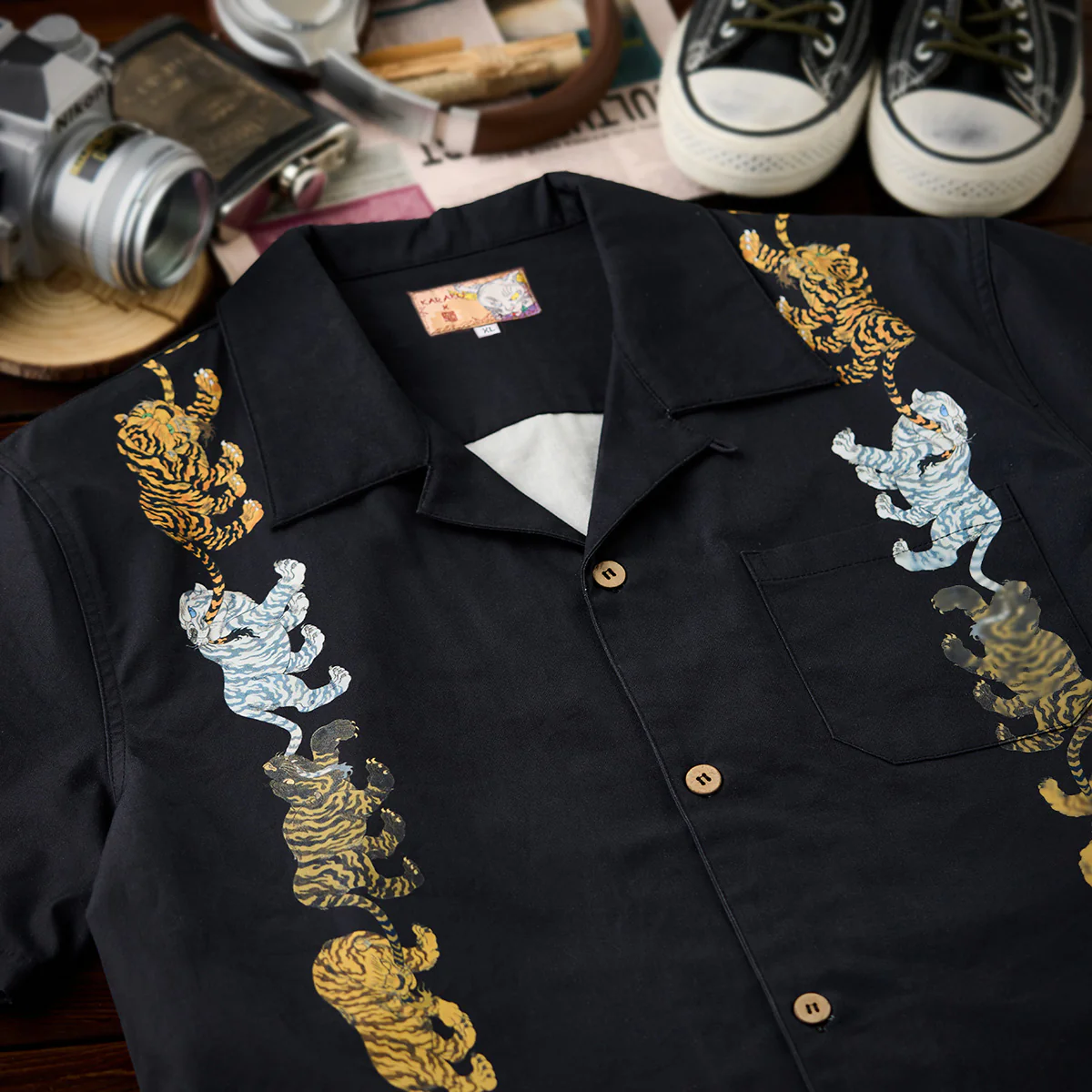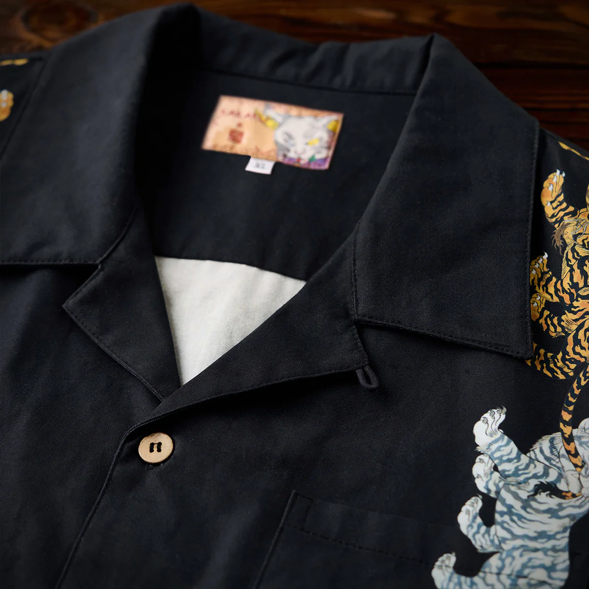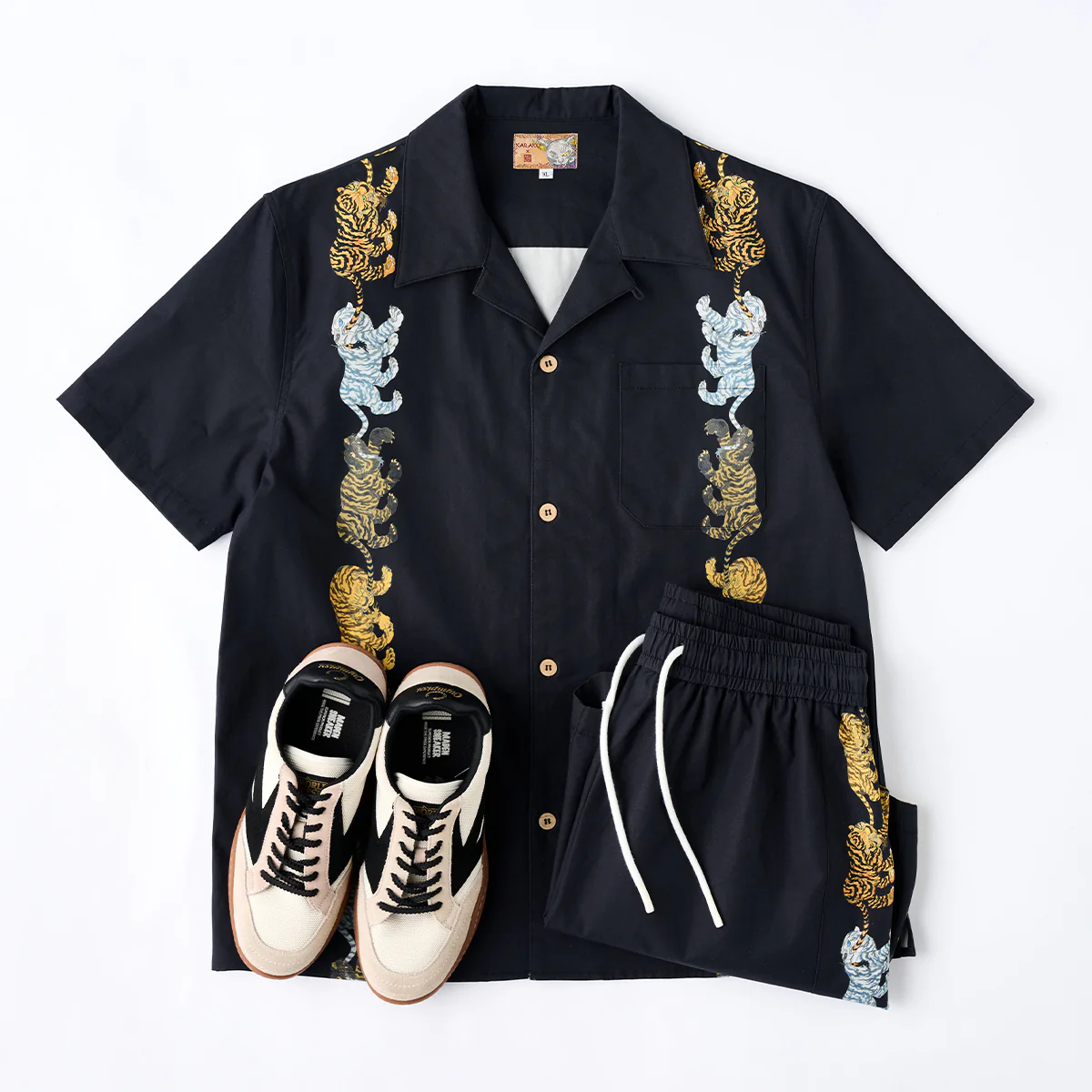 大胆に描かれた「三虎列」のモチーフを、縦方向にリズミカルに並べたバーティカルアロハシャツ。人気アーティスト・石黒亜矢子氏とのコラボレーションにより生まれた、ユーモラスかつ力強い世界観が魅力の一着です。個性豊かな虎たちが連なり、バーティカルにようなデザインは、永遠や生命のつながりをも感じさせます。落ち感のある生地にオープンカラーを合わせ、リラックス感たっぷりに仕上げました。遊び心と大人の抜け感を絶妙なバランスで楽しめる、KARAKUならではのオリジナルシャツです。