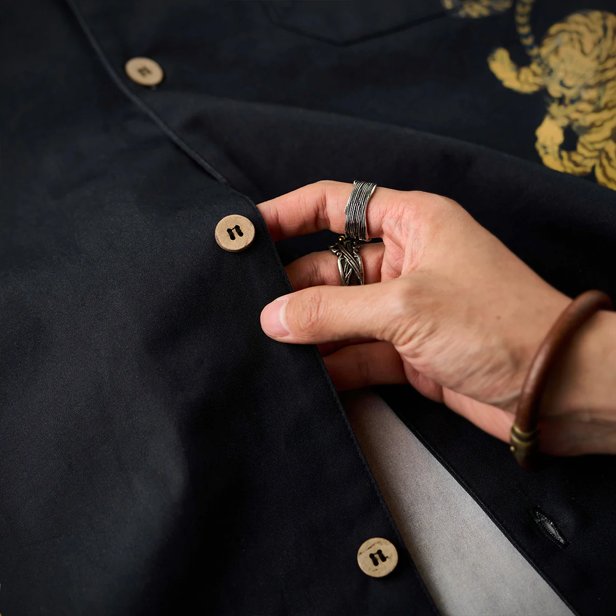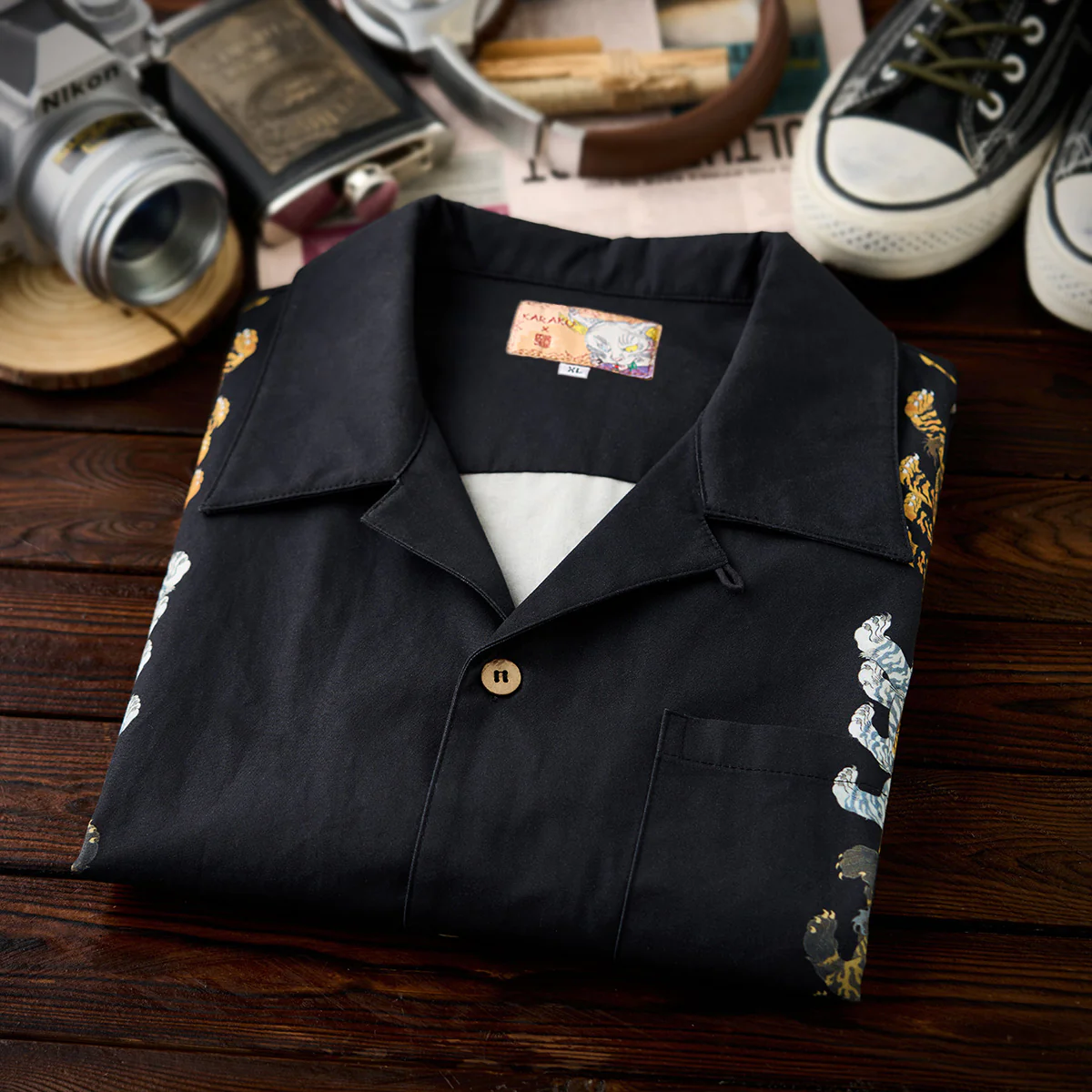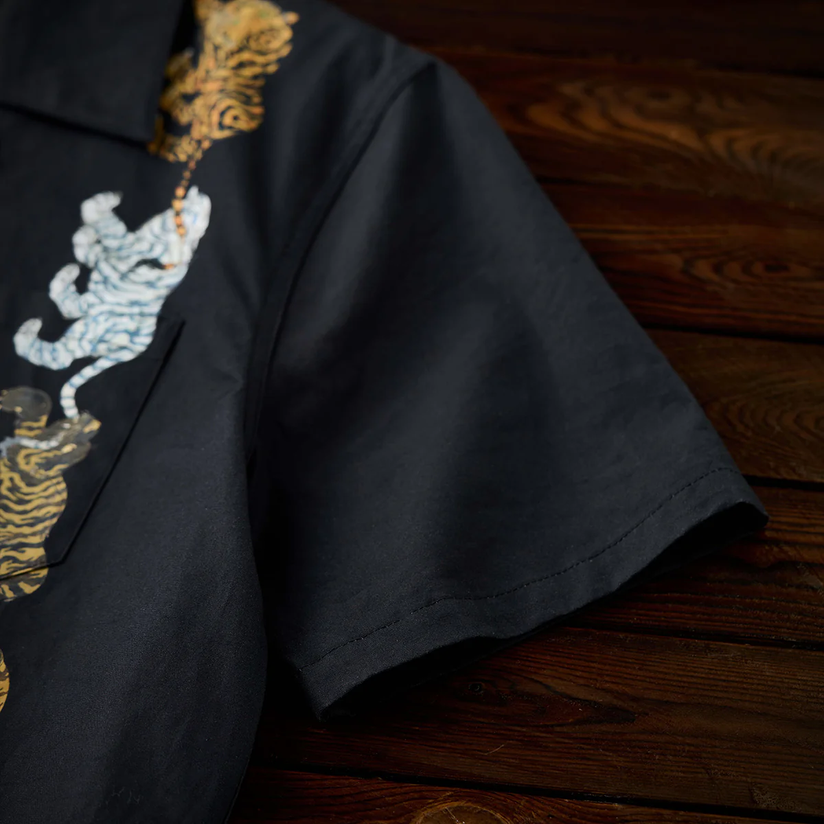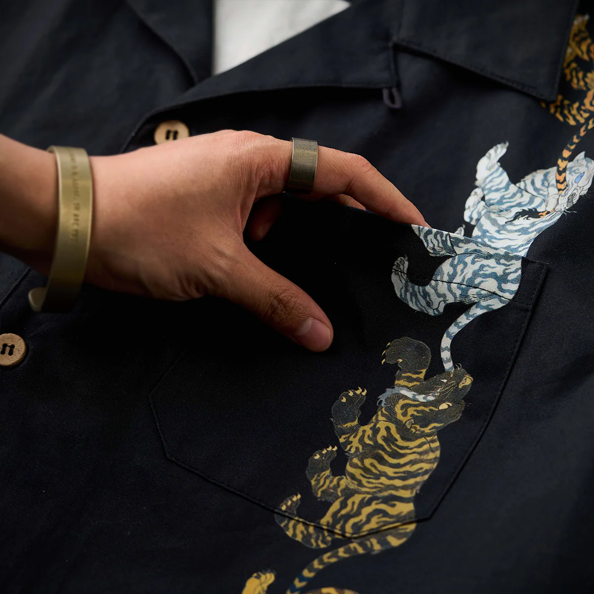 大胆に描かれた「三虎列」のモチーフを、縦方向にリズミカルに並べたバーティカルアロハシャツ。人気アーティスト・石黒亜矢子氏とのコラボレーションにより生まれた、ユーモラスかつ力強い世界観が魅力の一着です。個性豊かな虎たちが連なり、バーティカルにようなデザインは、永遠や生命のつながりをも感じさせます。落ち感のある生地にオープンカラーを合わせ、リラックス感たっぷりに仕上げました。遊び心と大人の抜け感を絶妙なバランスで楽しめる、KARAKUならではのオリジナルシャツです。