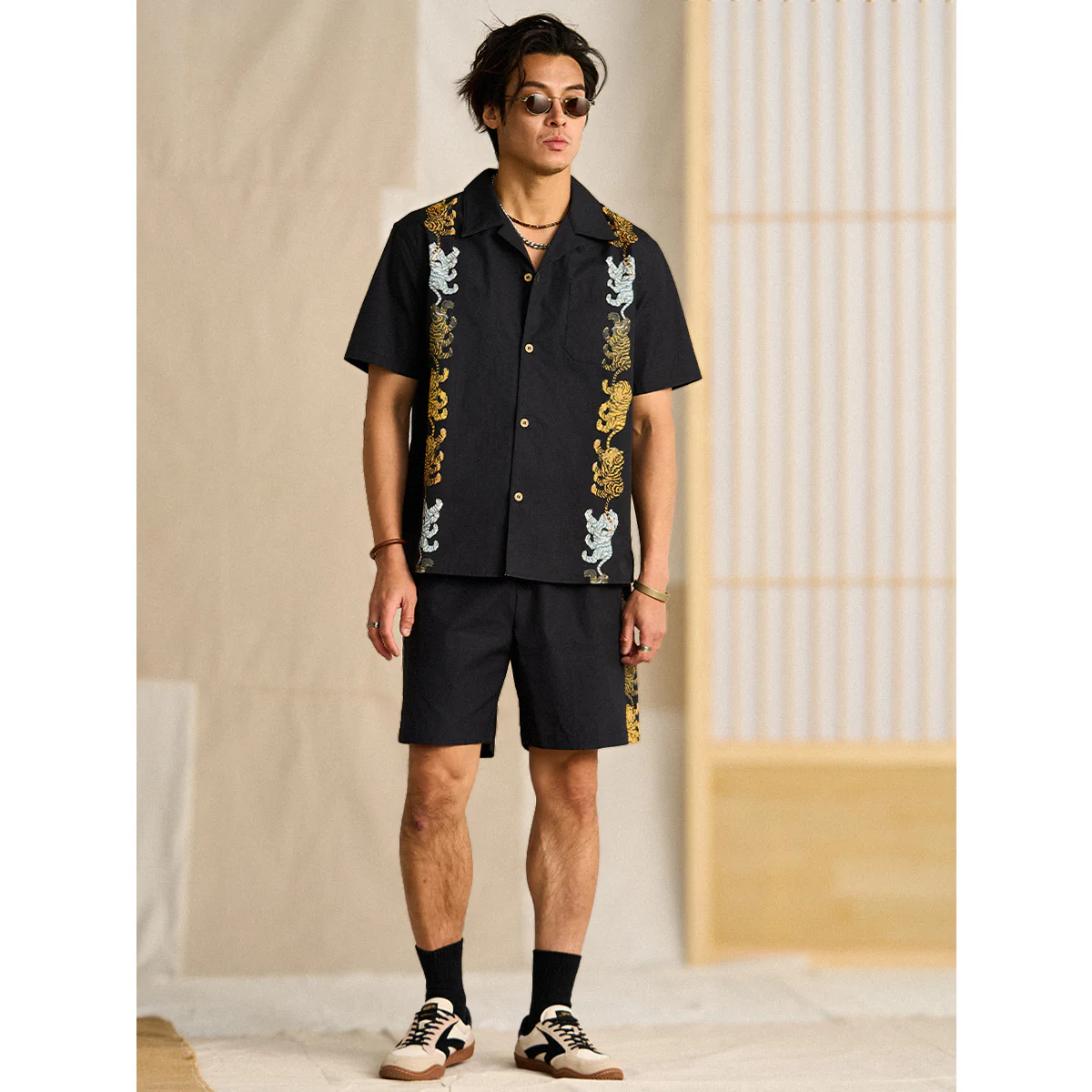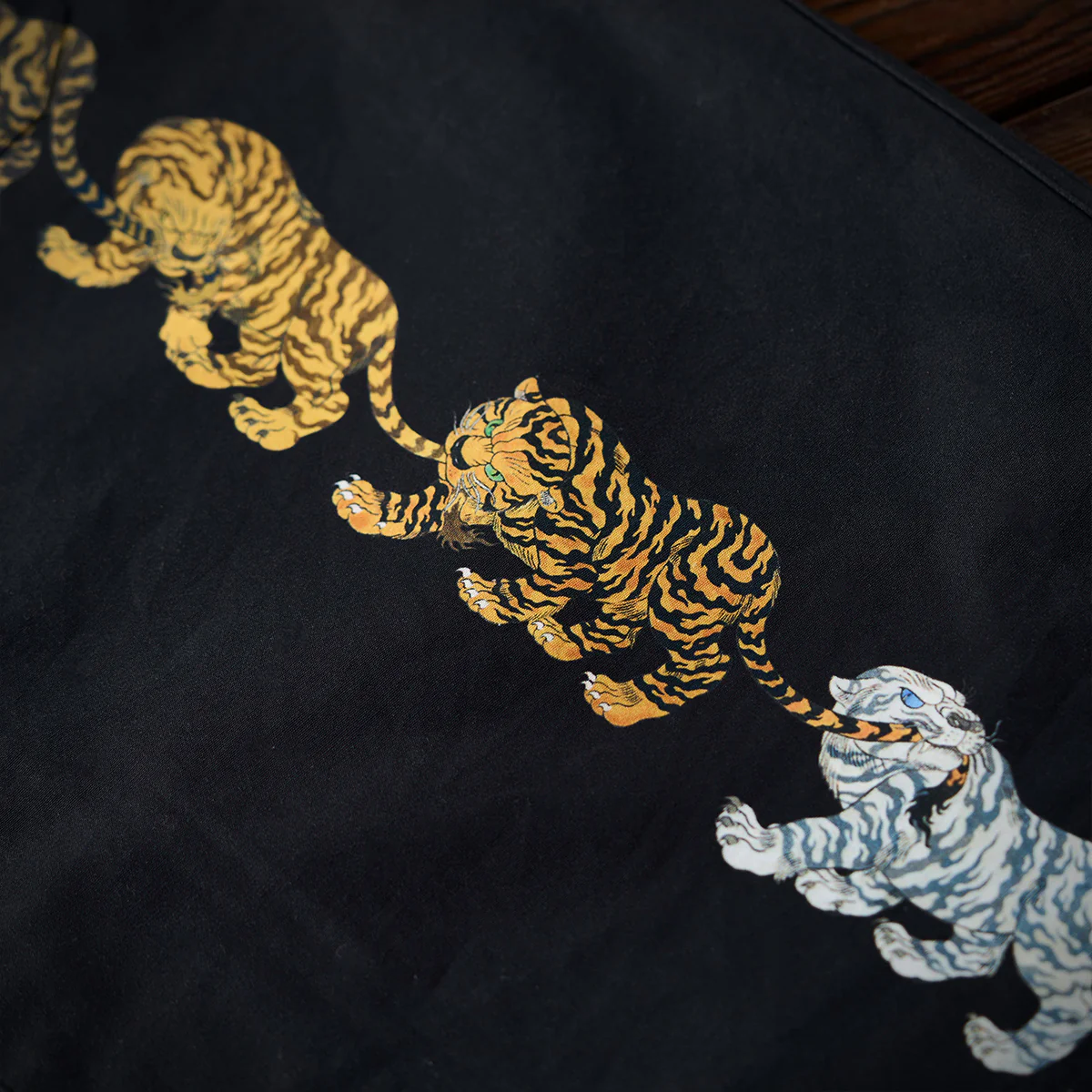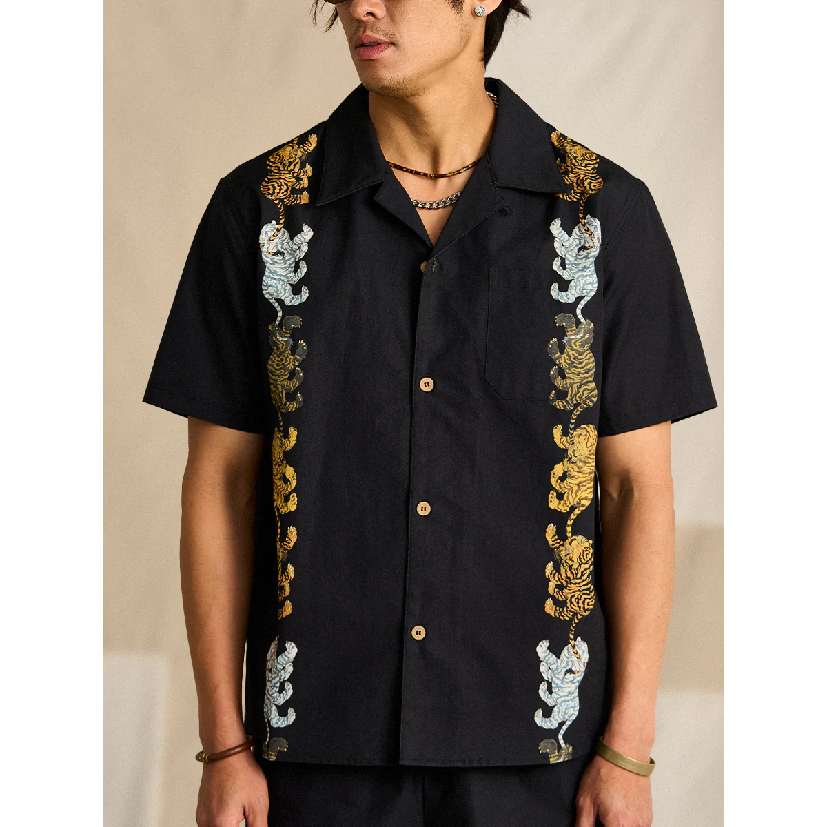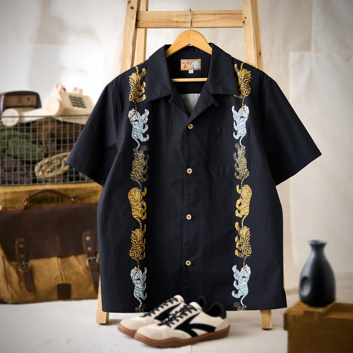 大胆に描かれた「三虎列」のモチーフを、縦方向にリズミカルに並べたバーティカルアロハシャツ。人気アーティスト・石黒亜矢子氏とのコラボレーションにより生まれた、ユーモラスかつ力強い世界観が魅力の一着です。個性豊かな虎たちが連なり、バーティカルにようなデザインは、永遠や生命のつながりをも感じさせます。落ち感のある生地にオープンカラーを合わせ、リラックス感たっぷりに仕上げました。遊び心と大人の抜け感を絶妙なバランスで楽しめる、KARAKUならではのオリジナルシャツです。
