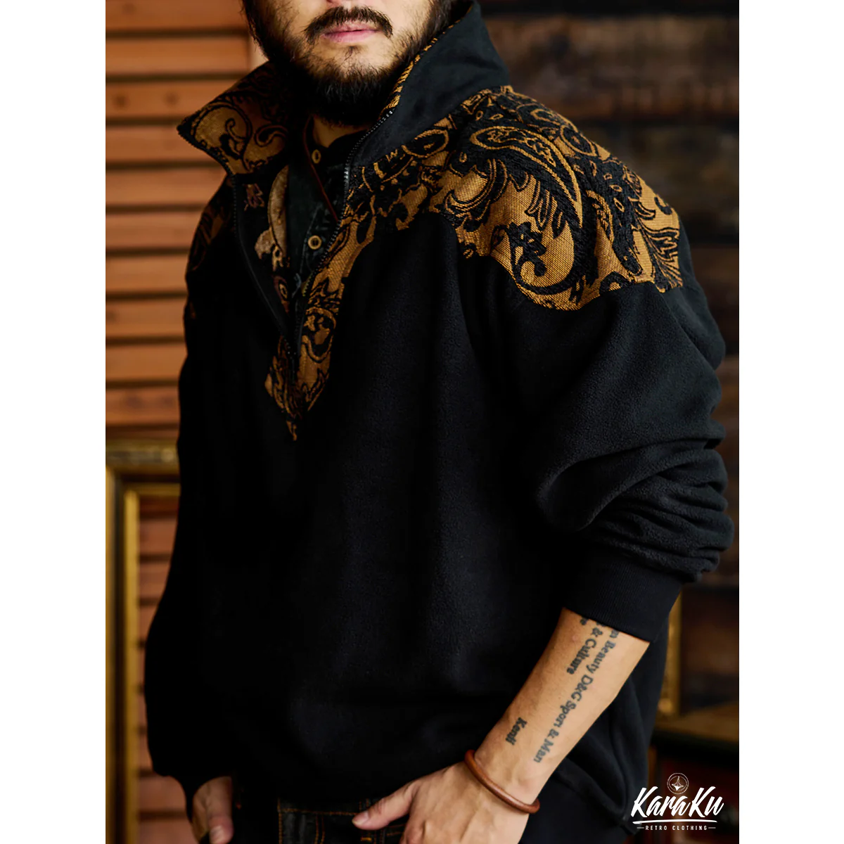 ウエスタンテイストとペイズリー柄が融合した、洗練されたデザインが魅力のメンズフリープルオーバー。 柔らかで暖かなフリー素材をベースに、胸元や肩に施されたペイズリー柄のシャニール素材が大人の遊び心を演出。ハーフジップ仕様により着脱がスムーズ。気温に応じて開閉を調整でき、インナーとのレイヤードスタイルも自由自在。秋冬シーズンのカジュアルスタイルに個性的なアクセントを添えます。