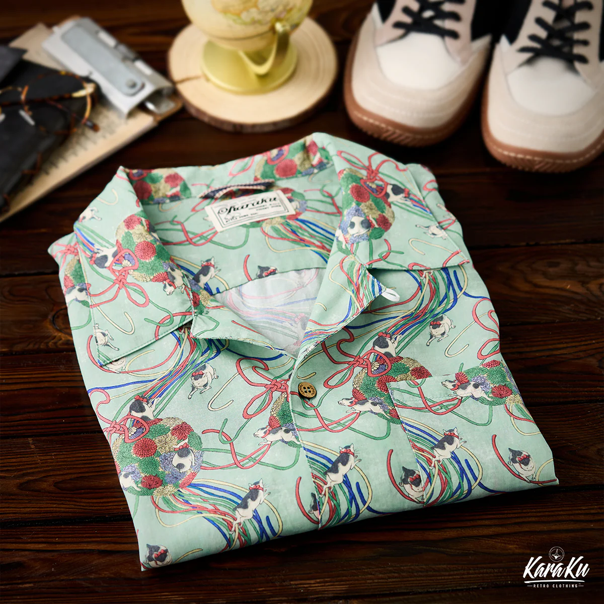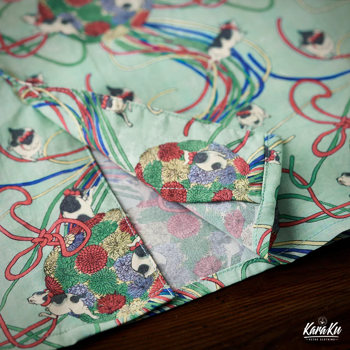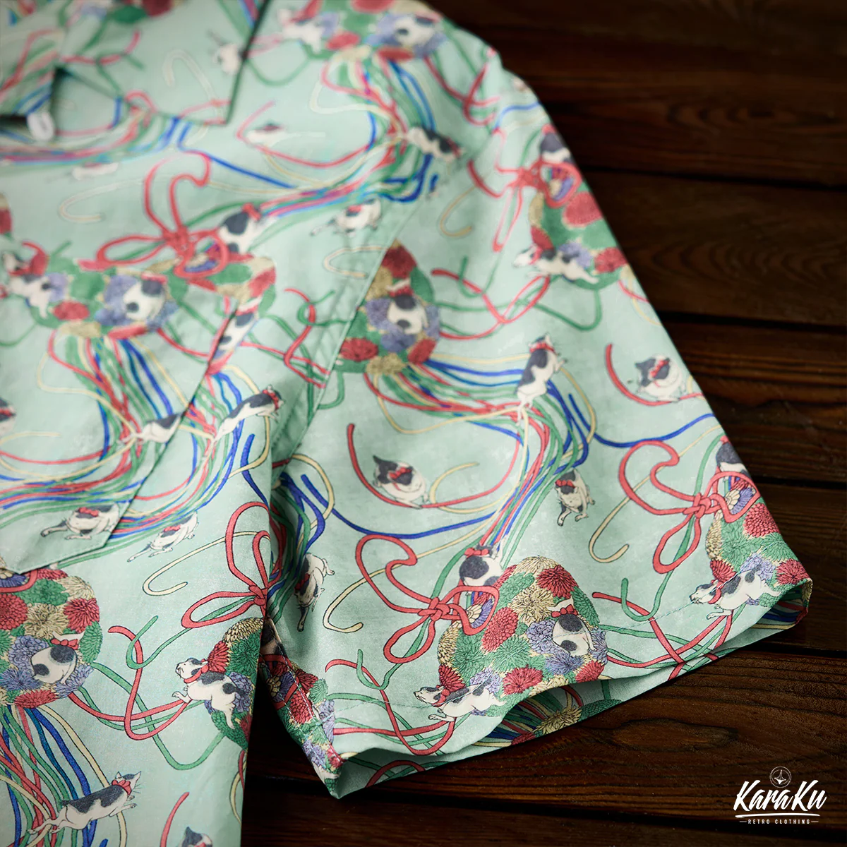 明治時代「猫・リボン・菊」浮世絵風テンセルアロハシャツ