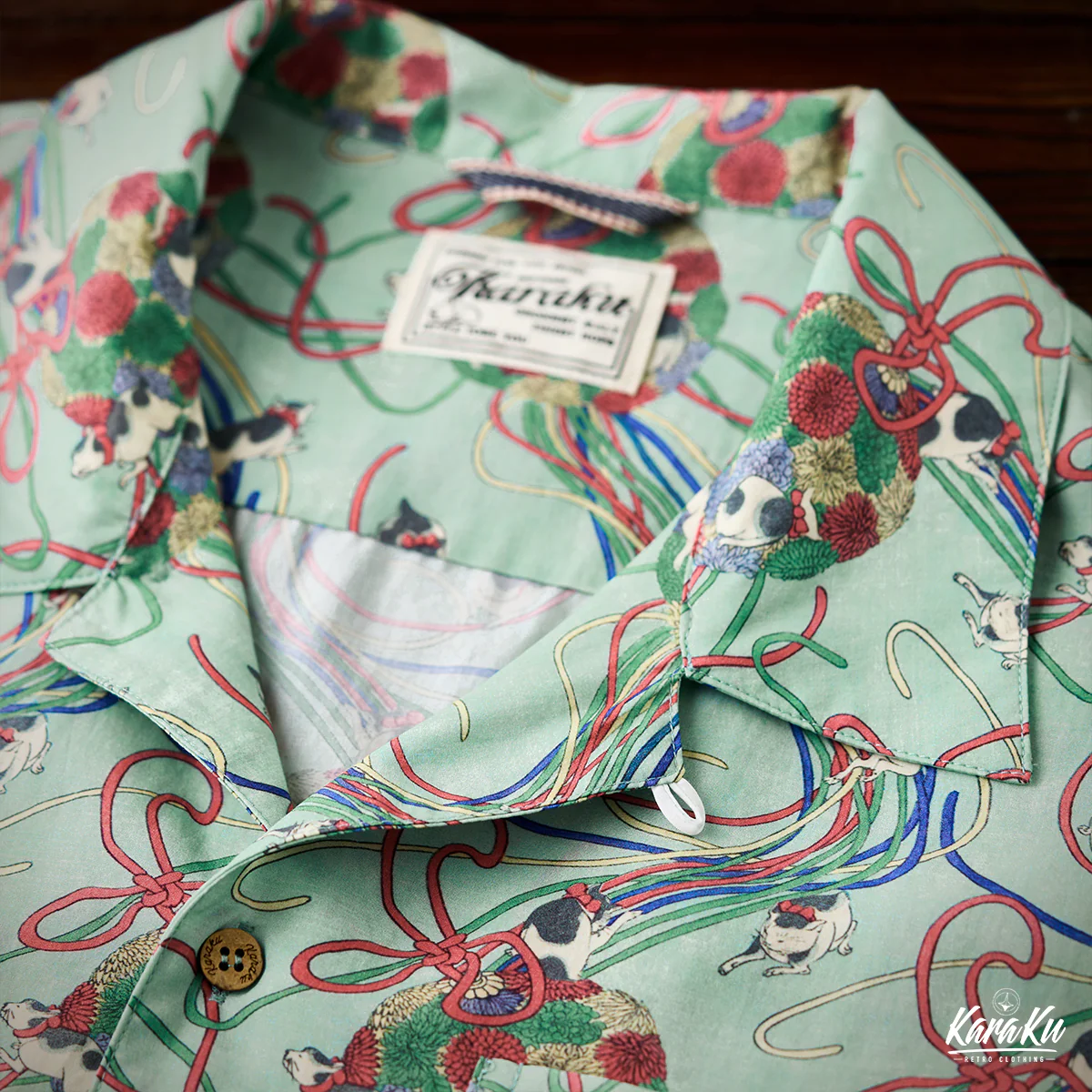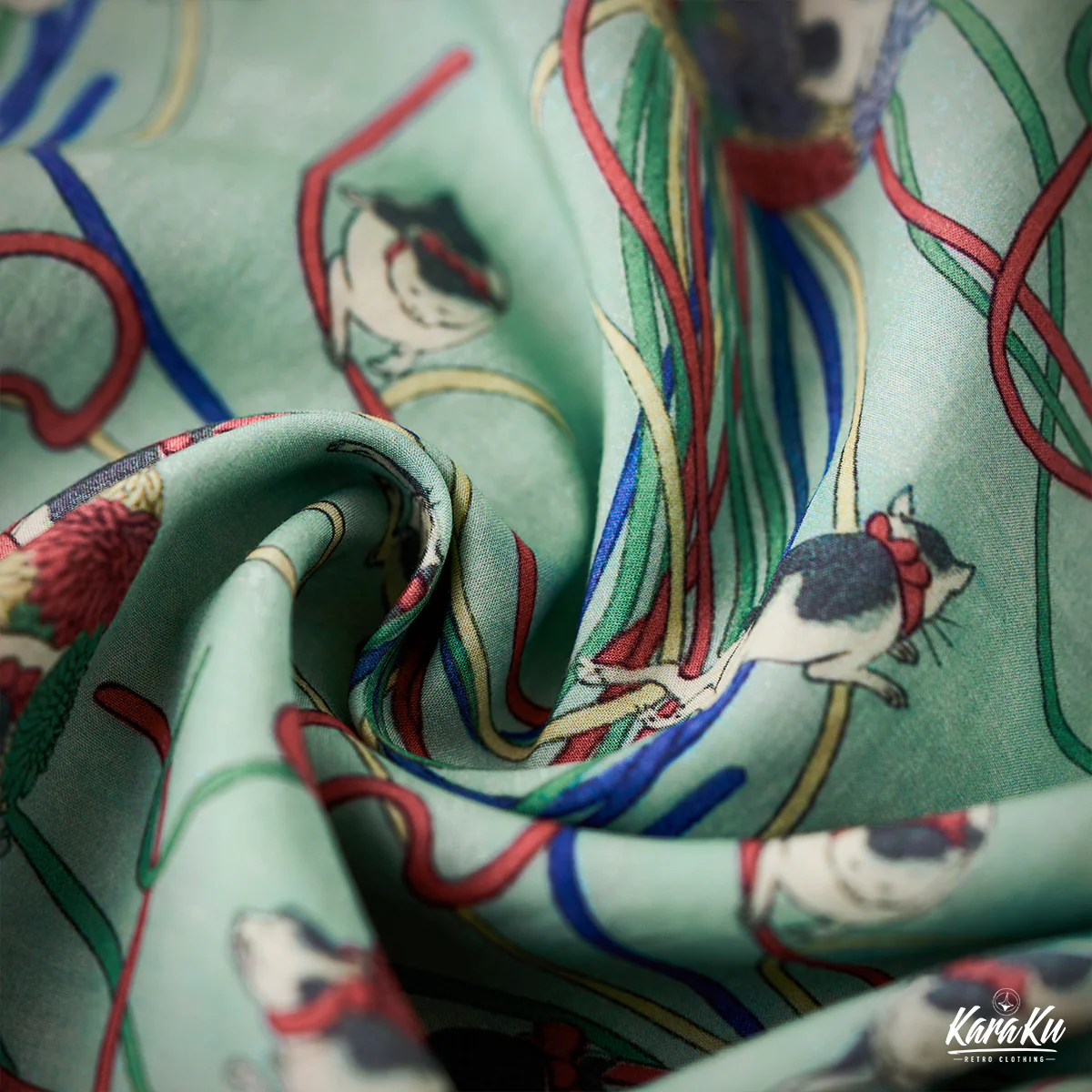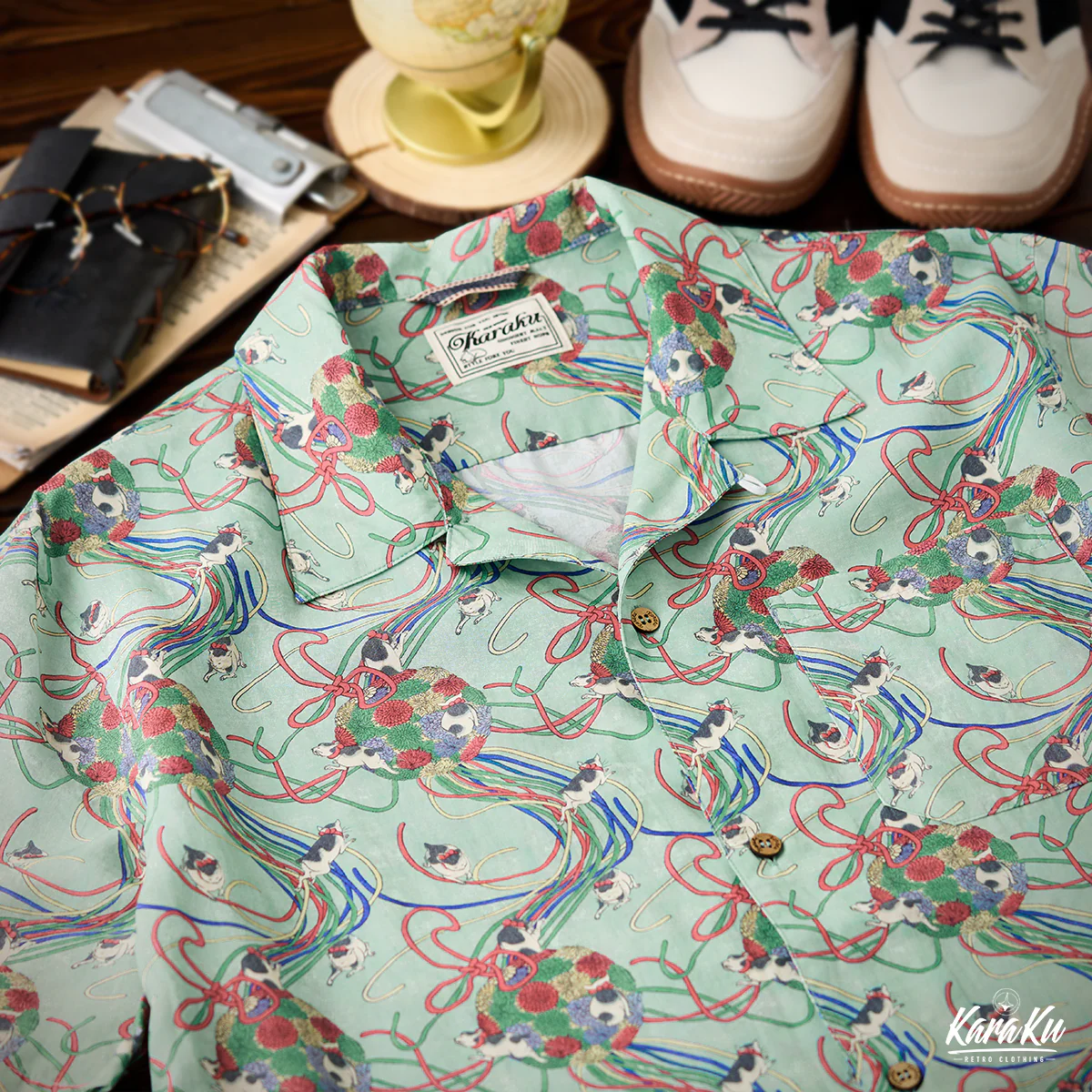 明治時代「猫・リボン・菊」浮世絵風テンセルアロハシャツ