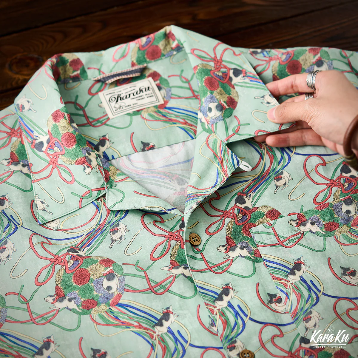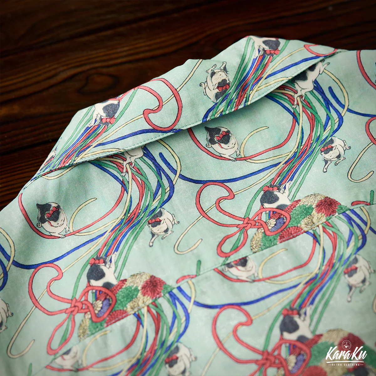 • 明治時代「猫・リボン・菊」浮世絵風テンセルアロハシャツ