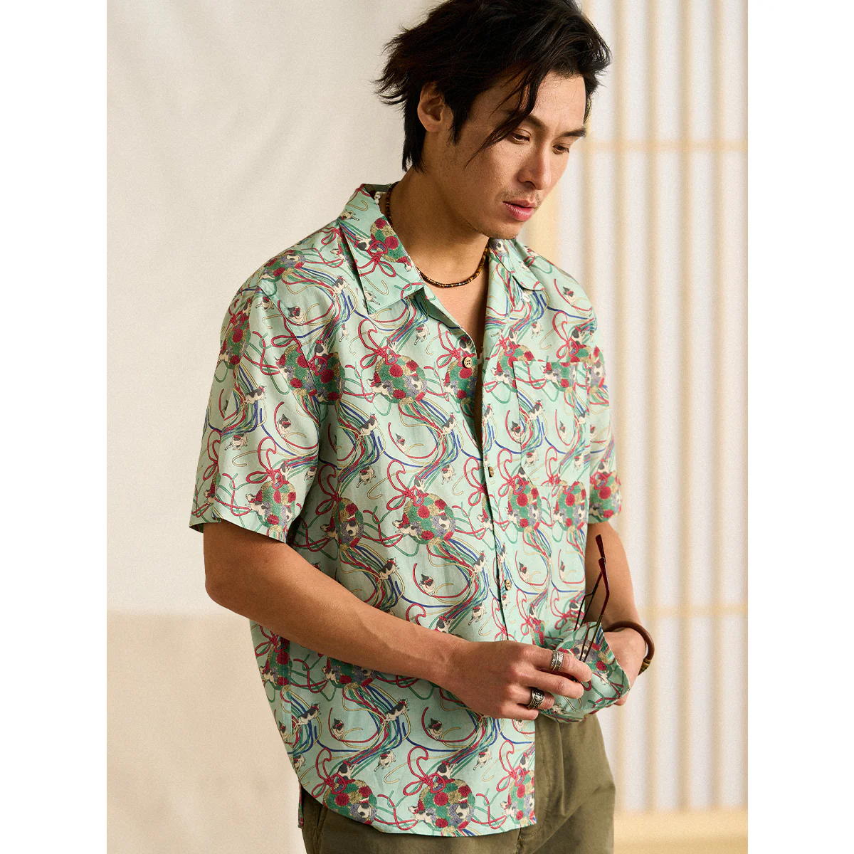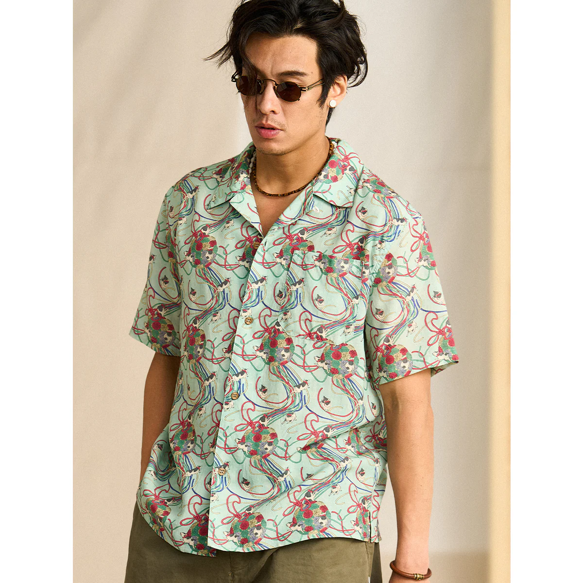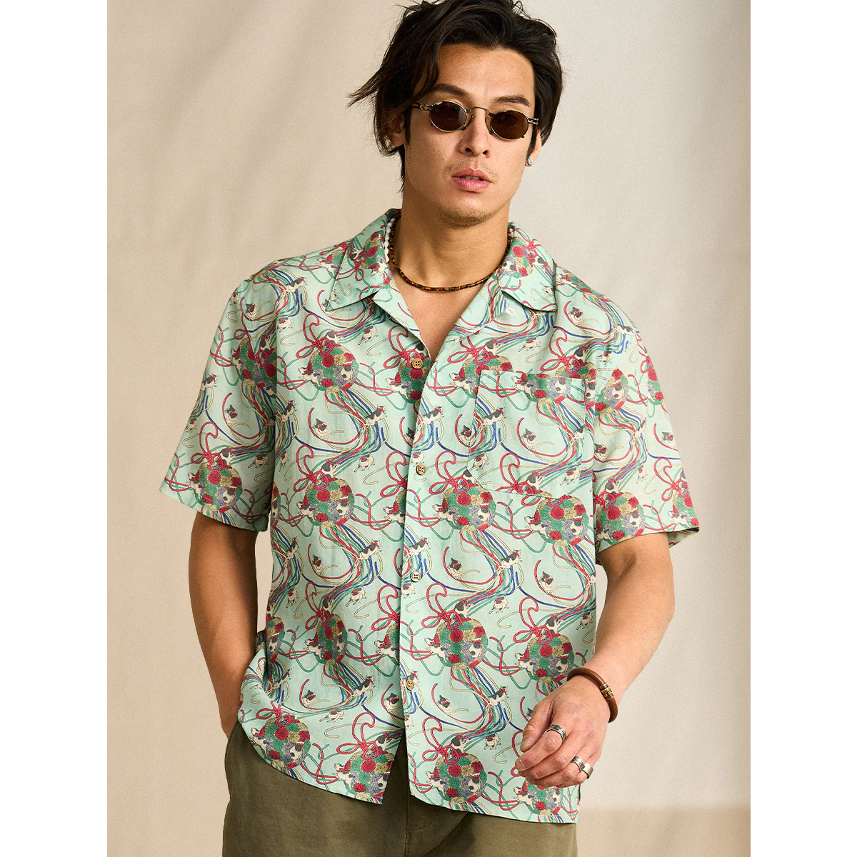 明治時代の絵をモチーフに、浮世絵の繊細な筆致を取り入れたアロハシャツ。伝統的な和の美しさを現代のスタイルに落とし込みました。デザインには、気品あふれる菊の花と愛らしい猫を組み合わせ、リボンを添えた優雅な繰り返しパターンを採用。クラシックな雰囲気を醸し出しつつ、どこか遊び心を感じさせる仕上がりです。ゆとりのあるシルエットと軽やかな着心地で、リラックス感のある着こなしを演出。デニムやスラックスと合わせるだけで、和洋折衷の個性を引き立てる一枚です。