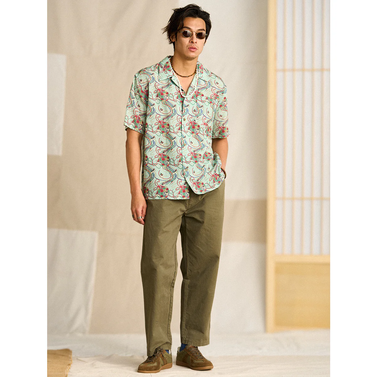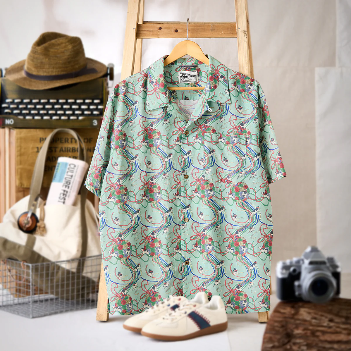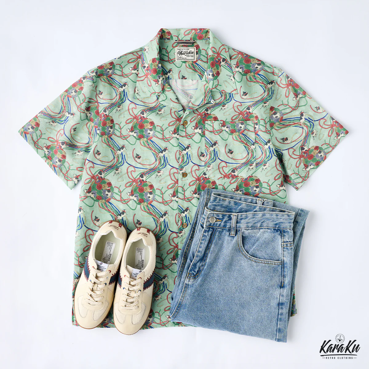明治時代の絵をモチーフに、浮世絵の繊細な筆致を取り入れたアロハシャツ。伝統的な和の美しさを現代のスタイルに落とし込みました。デザインには、気品あふれる菊の花と愛らしい猫を組み合わせ、リボンを添えた優雅な繰り返しパターンを採用。クラシックな雰囲気を醸し出しつつ、どこか遊び心を感じさせる仕上がりです。ゆとりのあるシルエットと軽やかな着心地で、リラックス感のある着こなしを演出。デニムやスラックスと合わせるだけで、和洋折衷の個性を引き立てる一枚です。