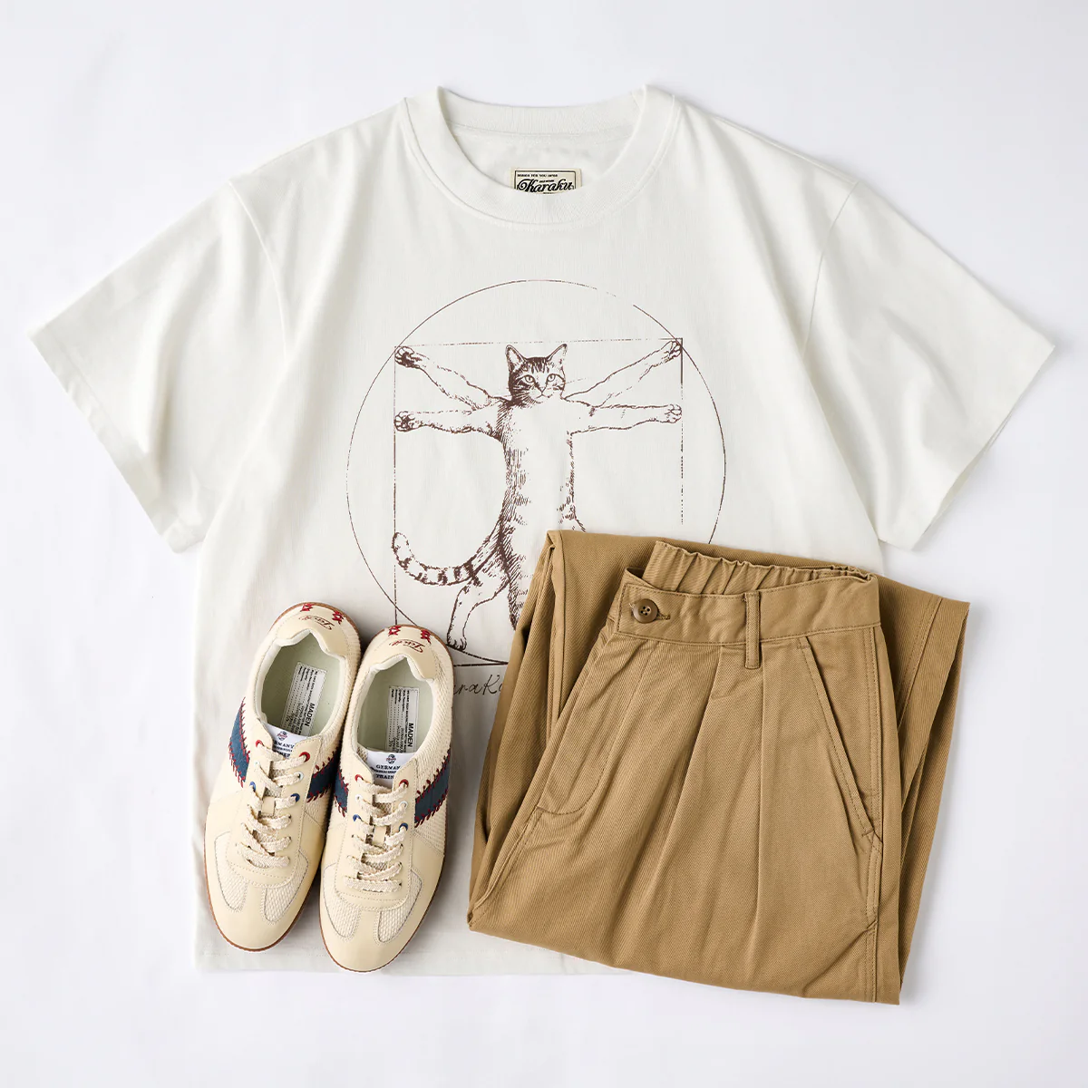 シンプルながら強烈なパロディ性があり、アートファンや猫好きの双方にアピール。カジュアルなスタイルにぴったり、日常はキャンバススニーカーと合わせても気軽に出掛けたくなります。