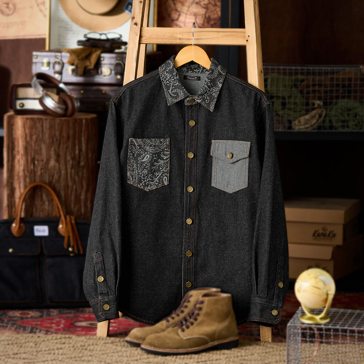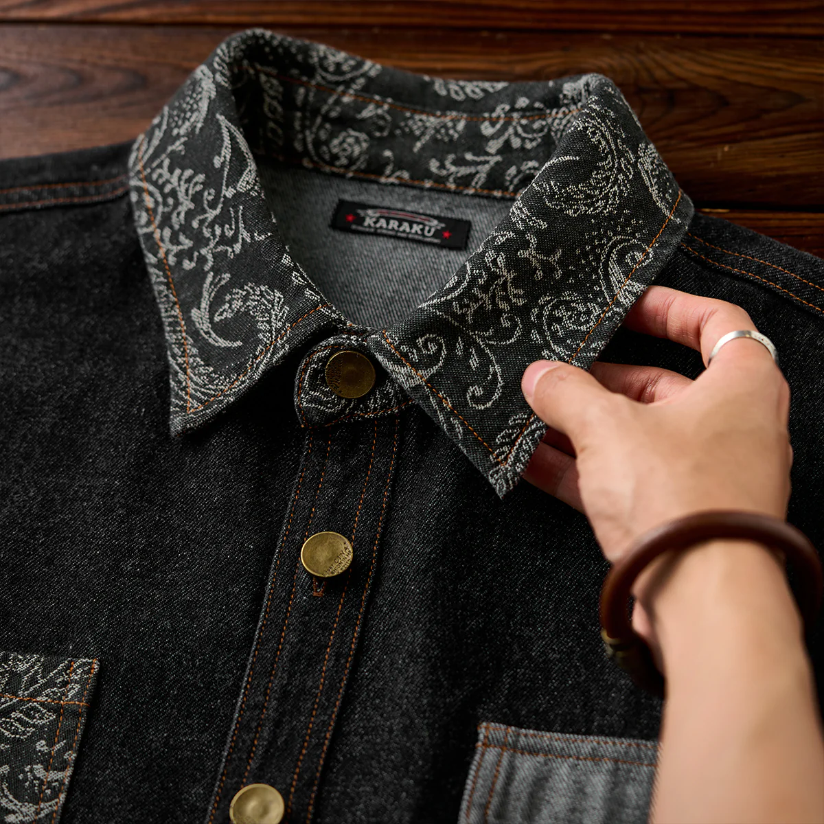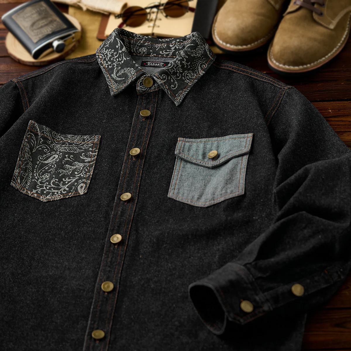 襟と左胸ポケット部分にジャガード織りのペイズリー柄が施されて、シャツ全体に華やかさをプラス。左胸ポケットはペイズリー柄、右胸ポケットは無地のデニム生地で非対称デザイン。ポケットの形状も異なり、デザイン性を強調しています。