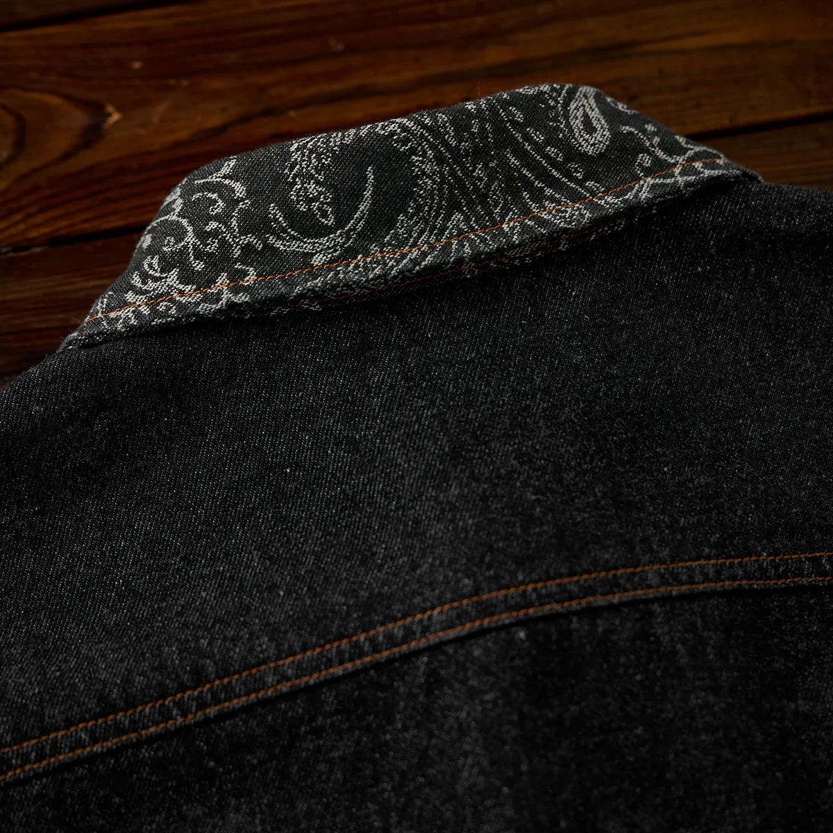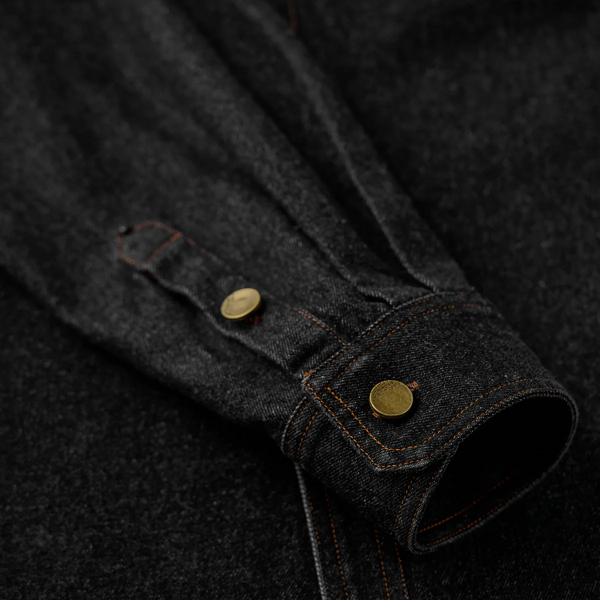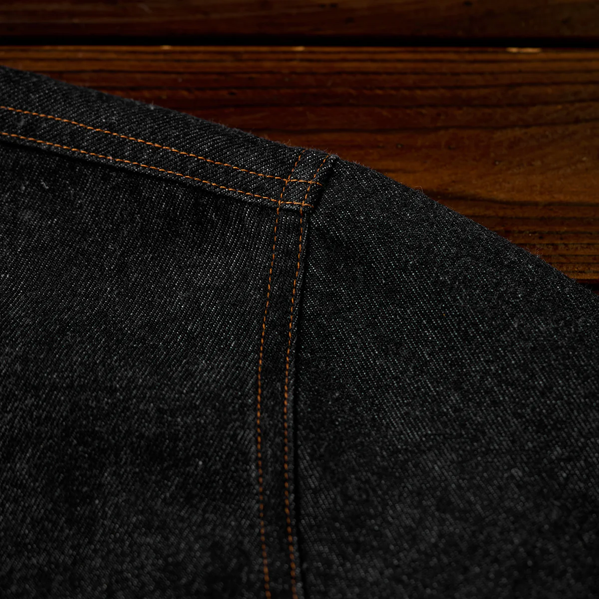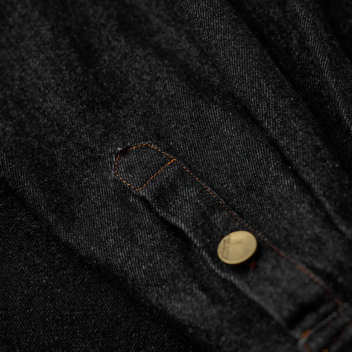 ステッチは明るいブラウン系で、ブラックデニムとのコントラストが目立ちます。ボタン部分は金属製で、無骨なアクセントをプラスしています。
