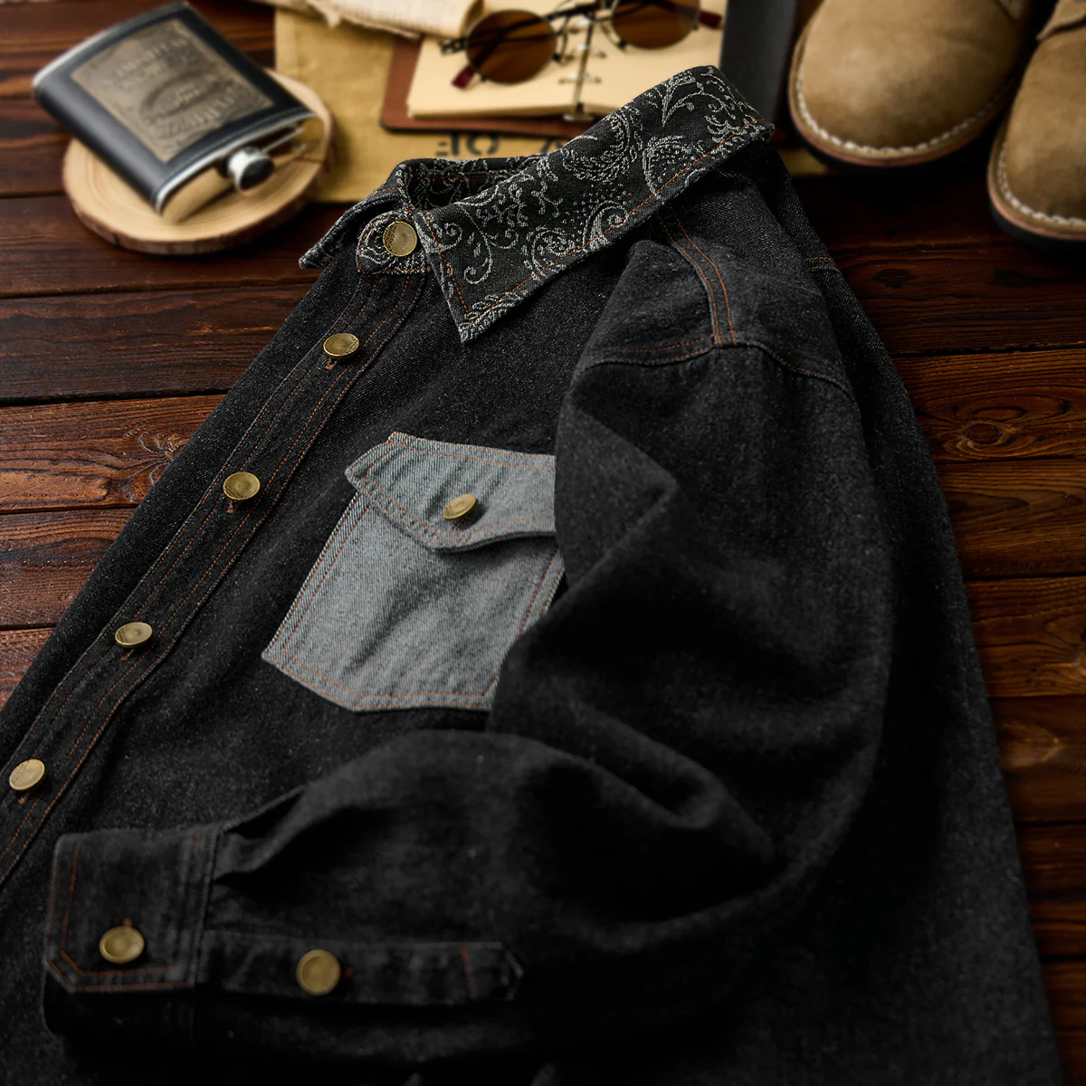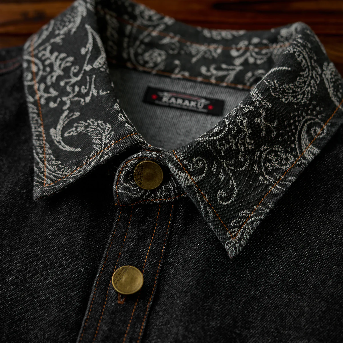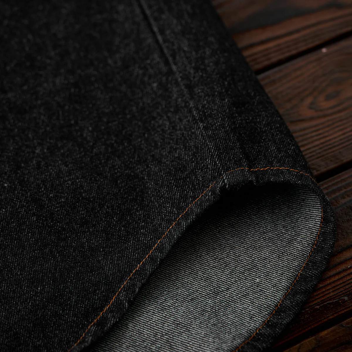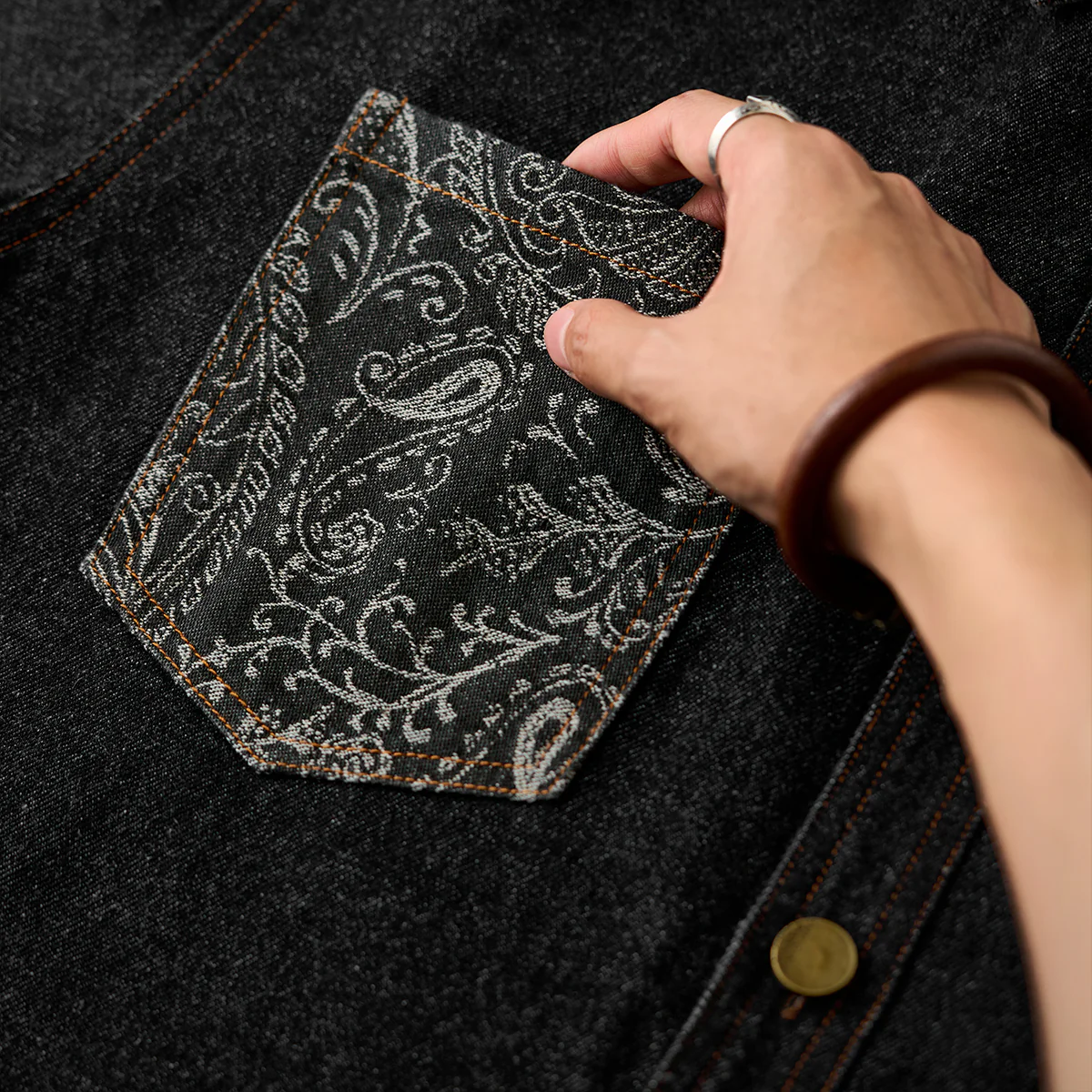 ステッチは明るいブラウン系で、ブラックデニムとのコントラストが目立ちます。ボタン部分は金属製で、無骨なアクセントをプラスしています。