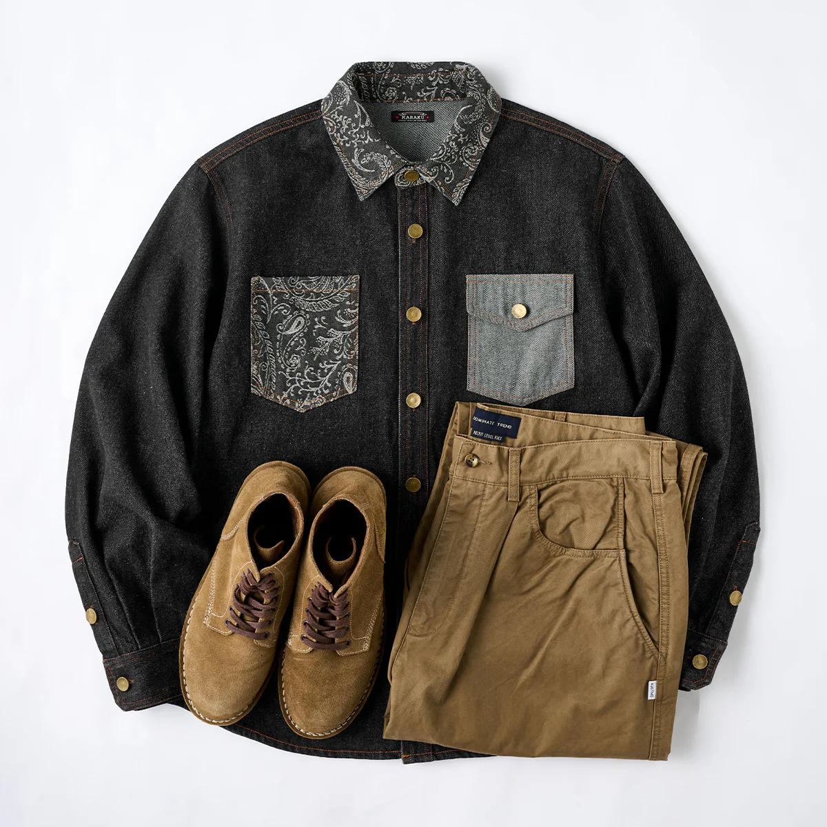 ペイズリー柄を活かし、細身のブラックパンツやブーツと合わせることで洗練された印象に。中にタートルネックやスウェットを合わせると、季節感を取り入れたレイヤードが可能。
