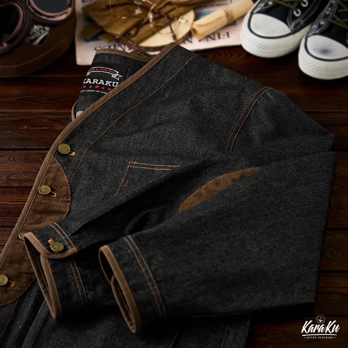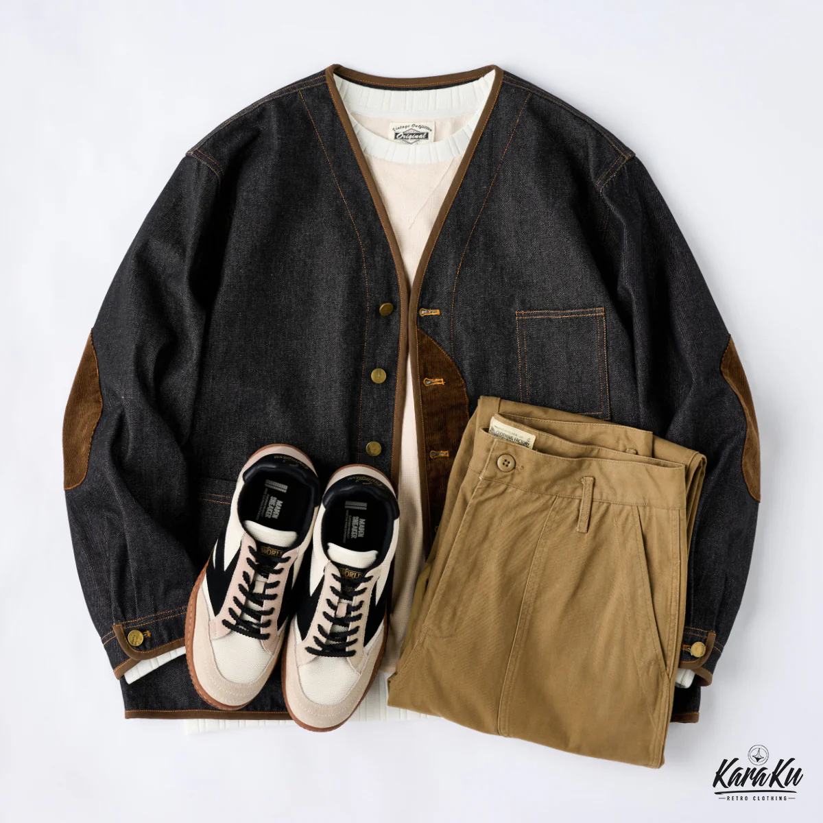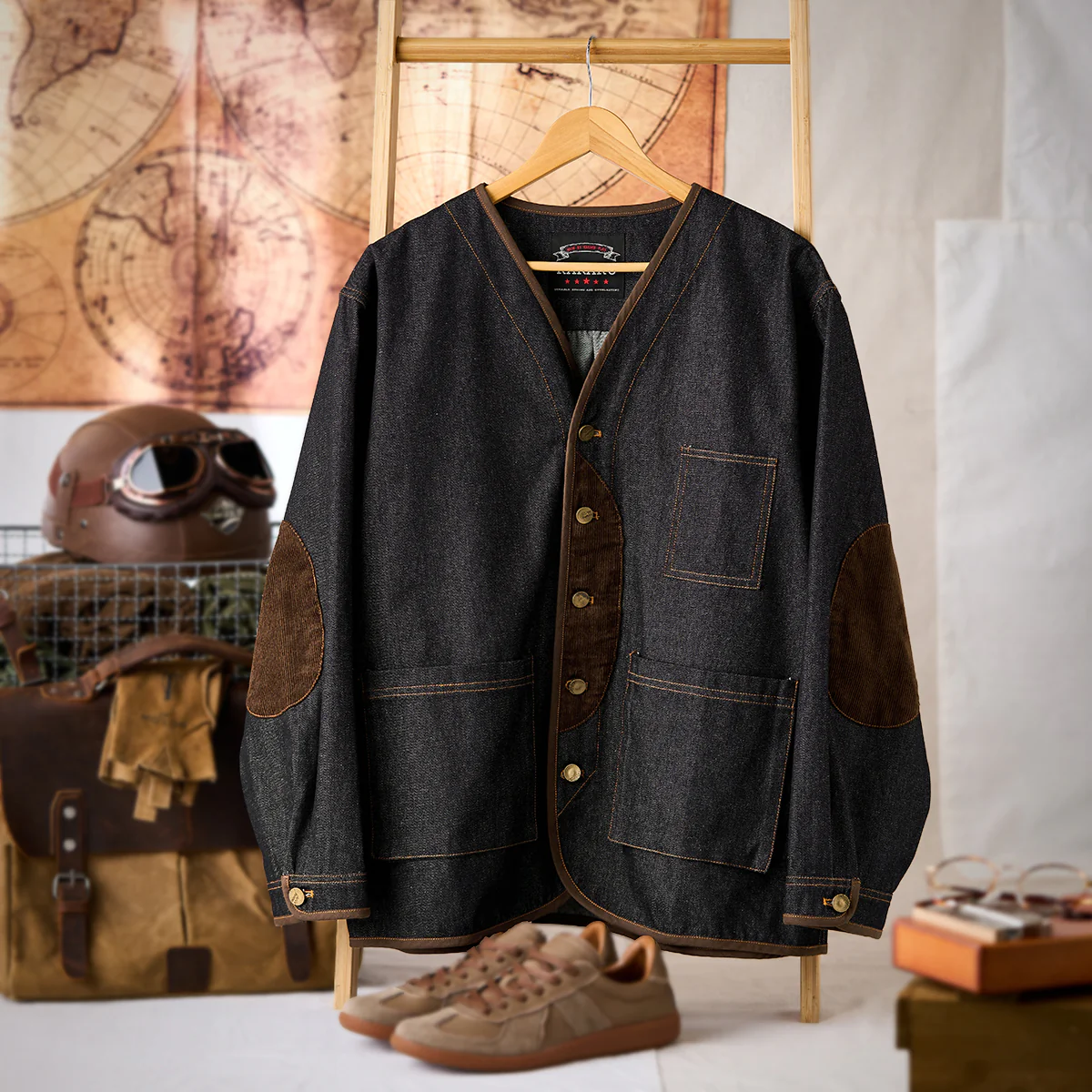 デニム素材をメイン使用し、厚すぎず薄すぎない適度なハリがあり、年間を通じて着用可能。ウォッシュ加工がされ、素材は自然の色落ちとユーズド感で現れ、ビンテージ感も満載。