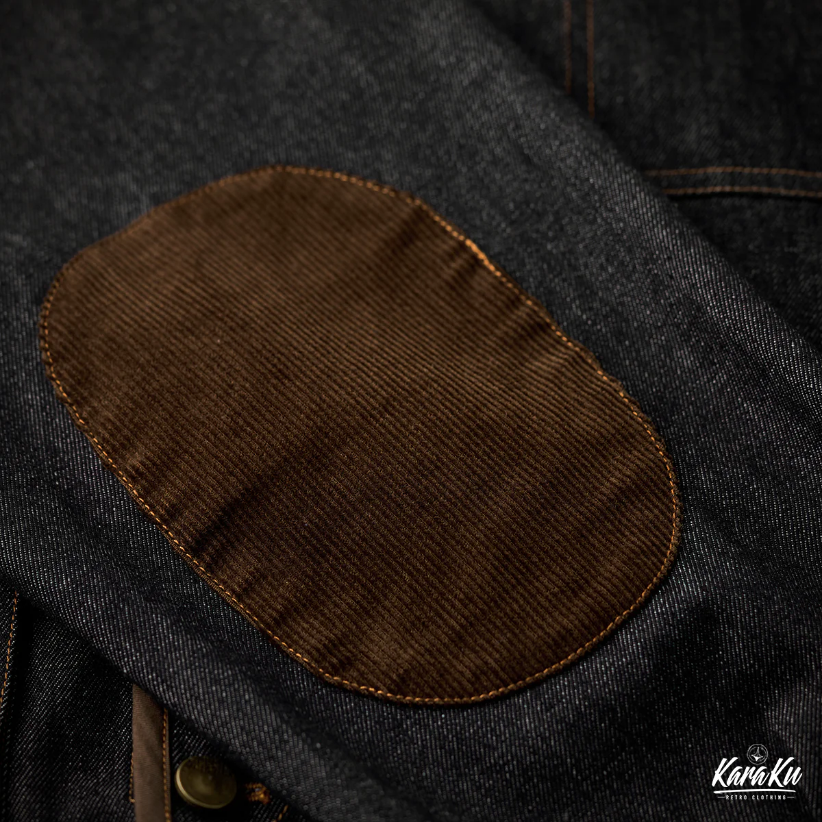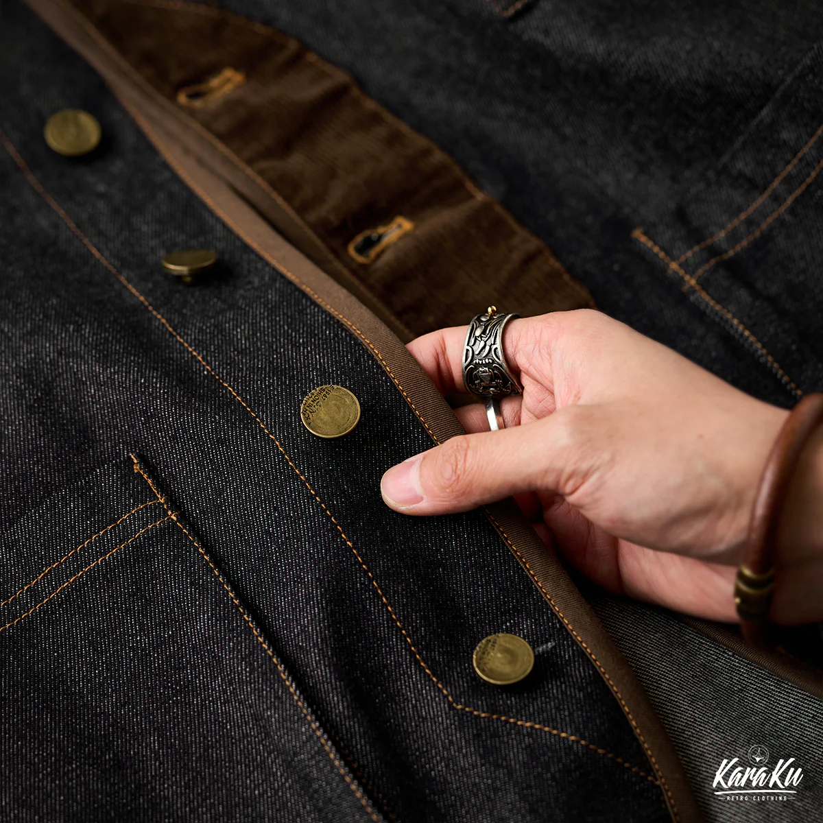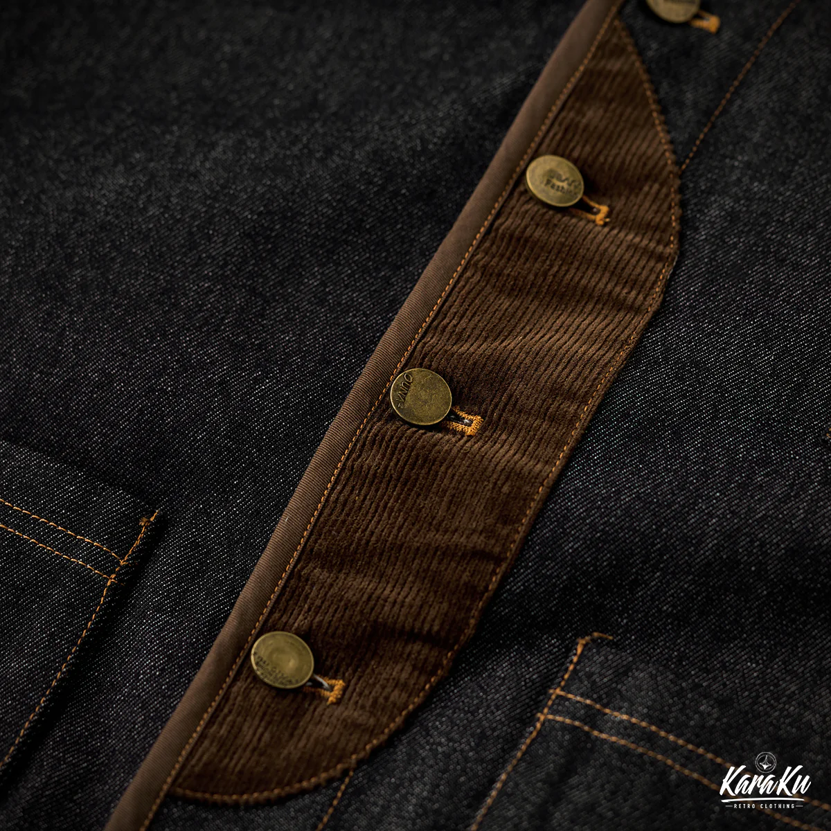 襟がないノーカラー仕様のため、すっきりとしたミニマルな印象です。前立て部分にコーデュロイ素材が使用されて、デニムのフラットな質感と対照的です。デザイン的には異素材の切り替えによってアクセントが生まれ、カーブしたカッティングも特徴的で、直線的ではなく柔らかい印象を与えている。