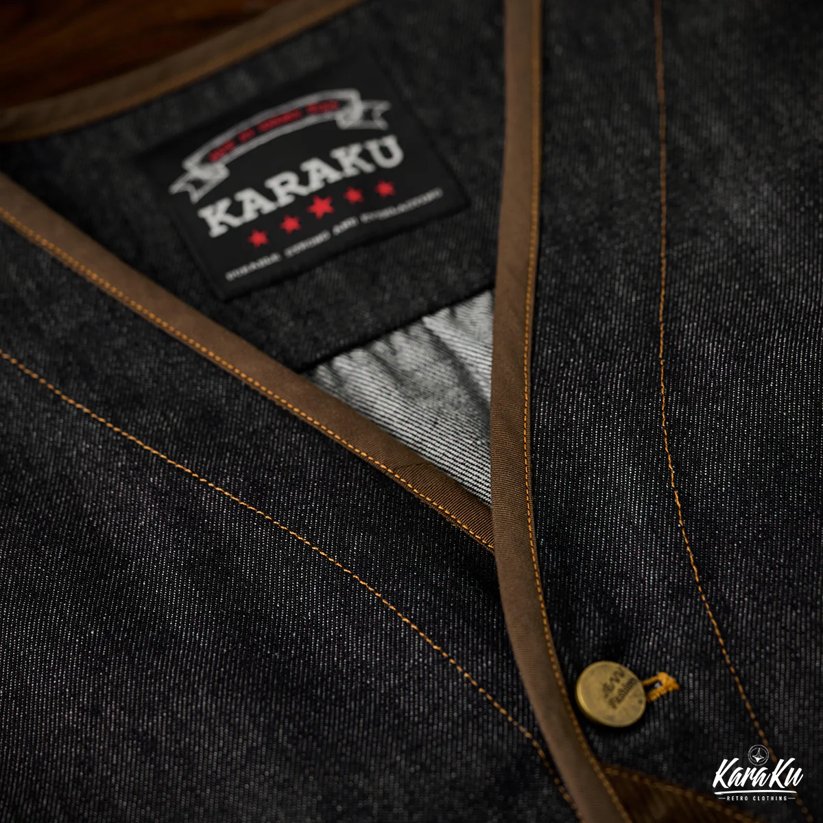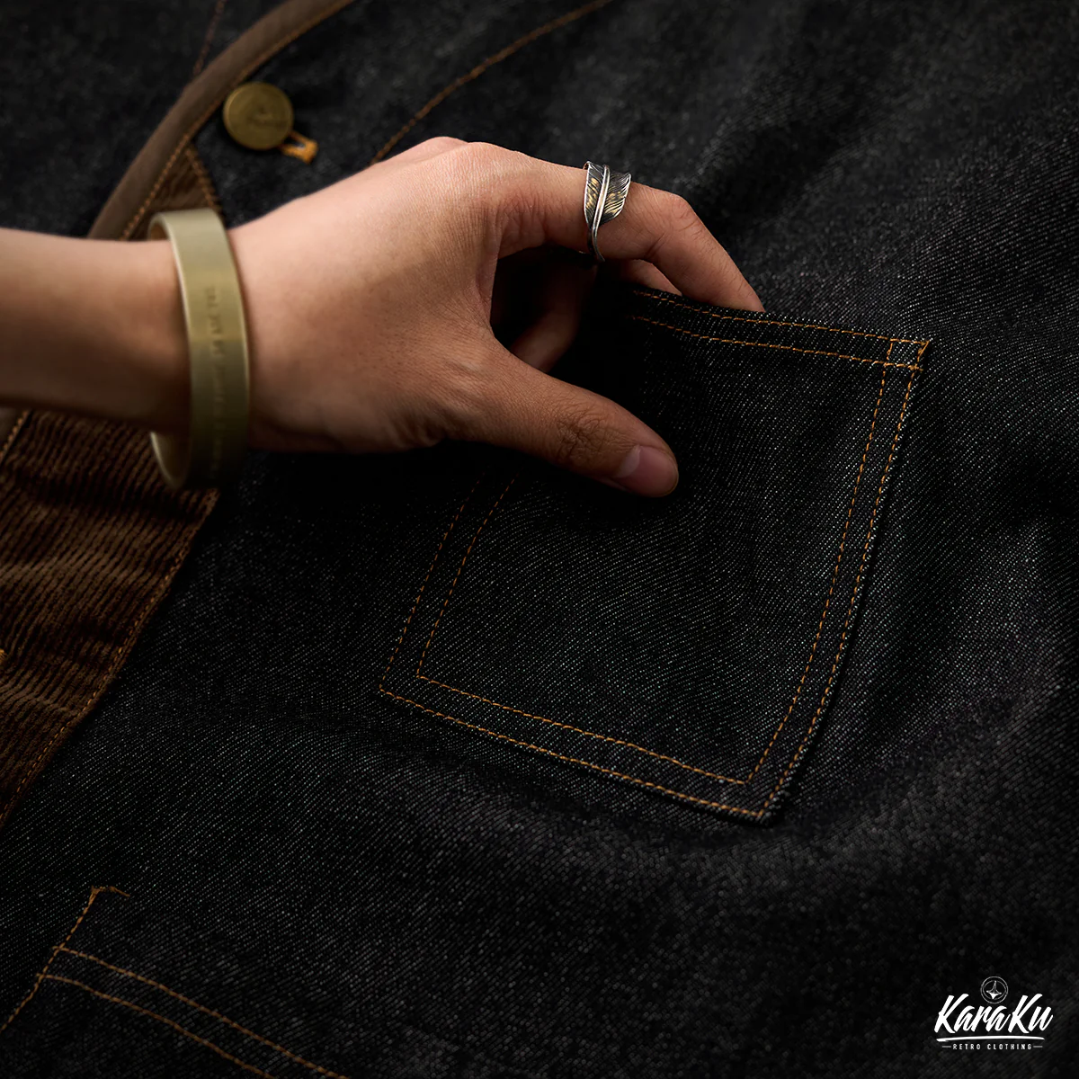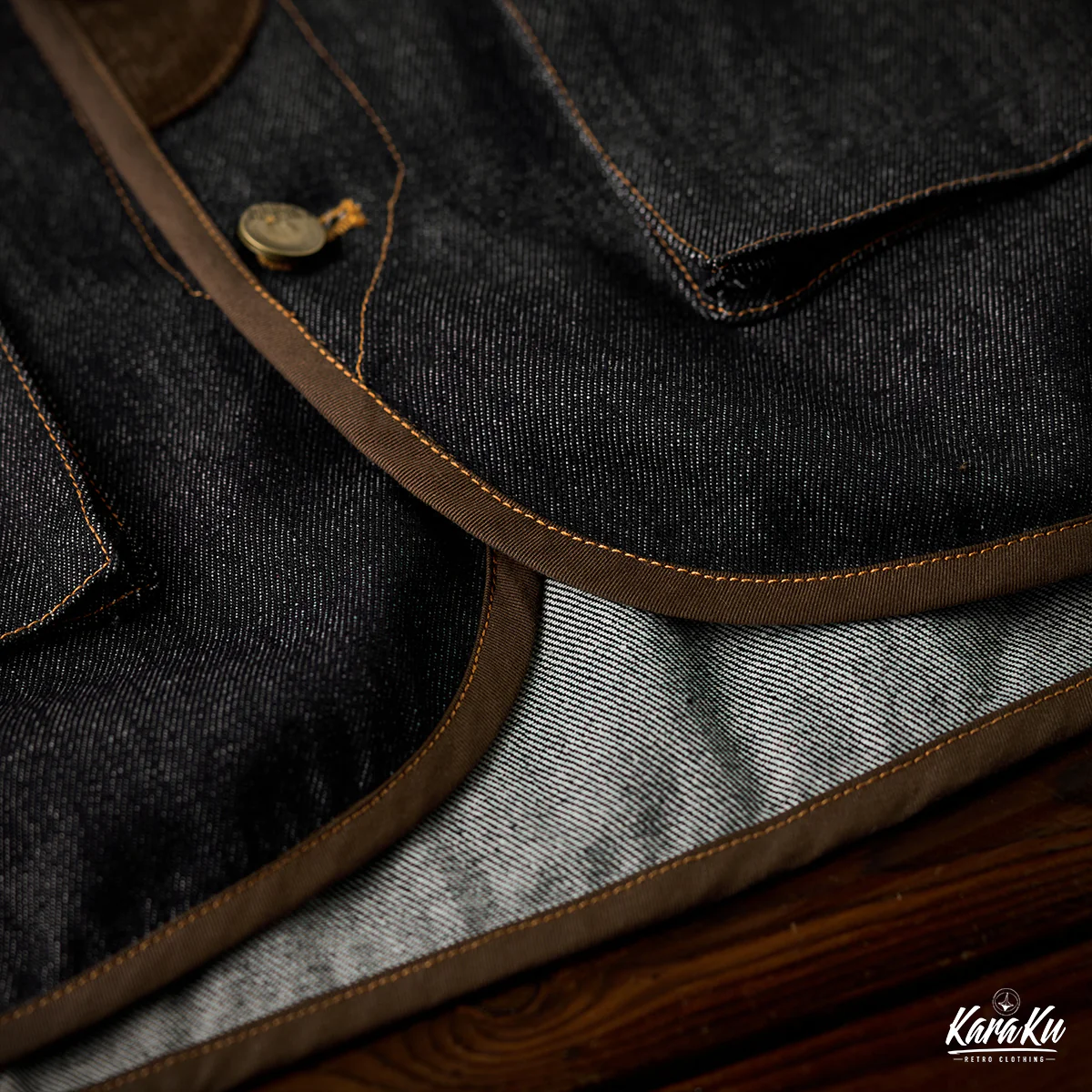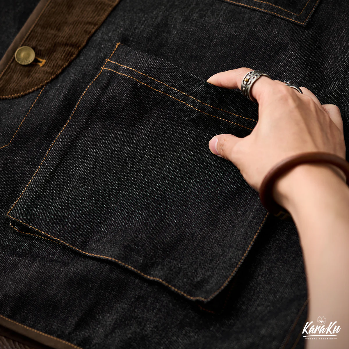 襟がないノーカラー仕様のため、すっきりとしたミニマルな印象です。前立て部分にコーデュロイ素材が使用されて、デニムのフラットな質感と対照的です。デザイン的には異素材の切り替えによってアクセントが生まれ、カーブしたカッティングも特徴的で、直線的ではなく柔らかい印象を与えている。
