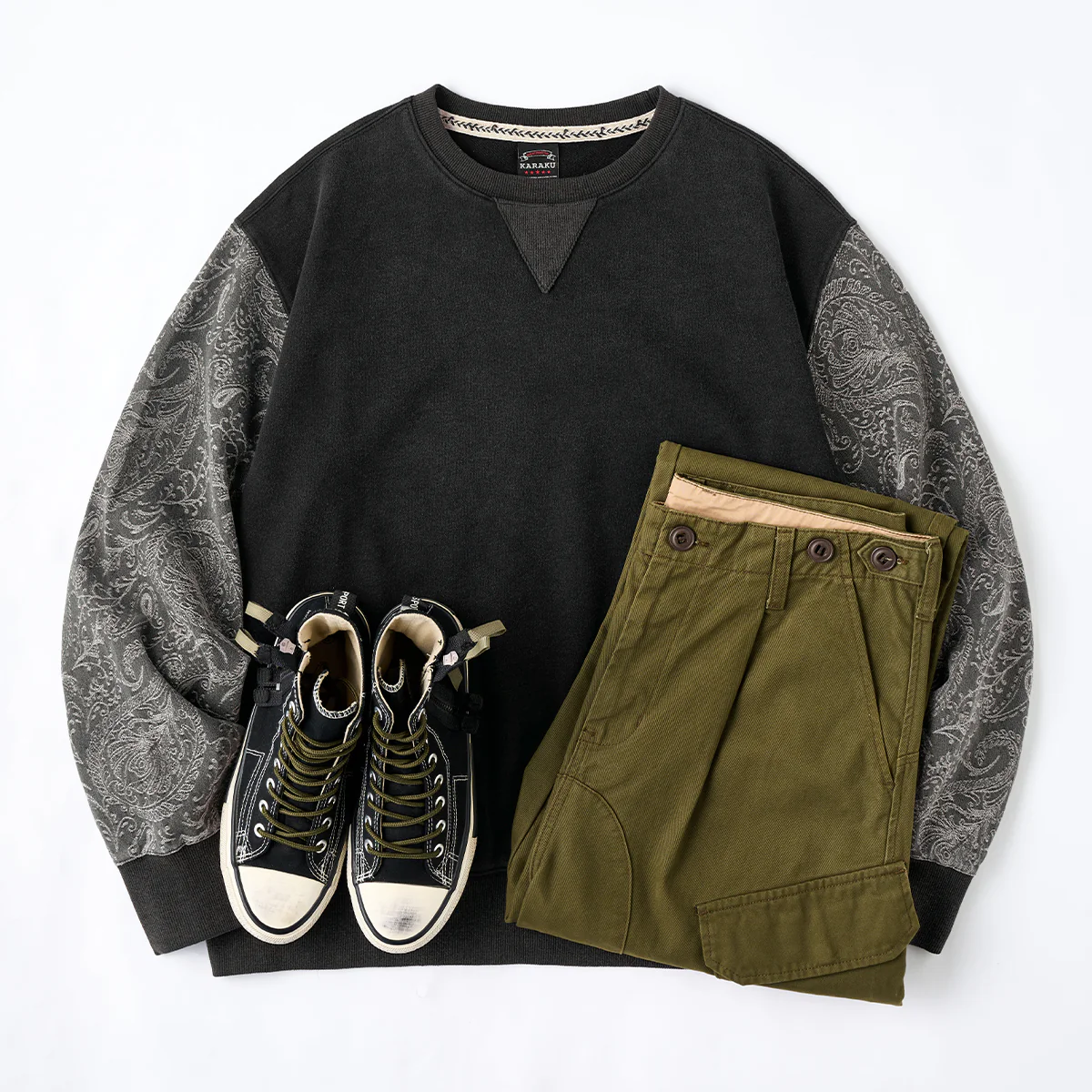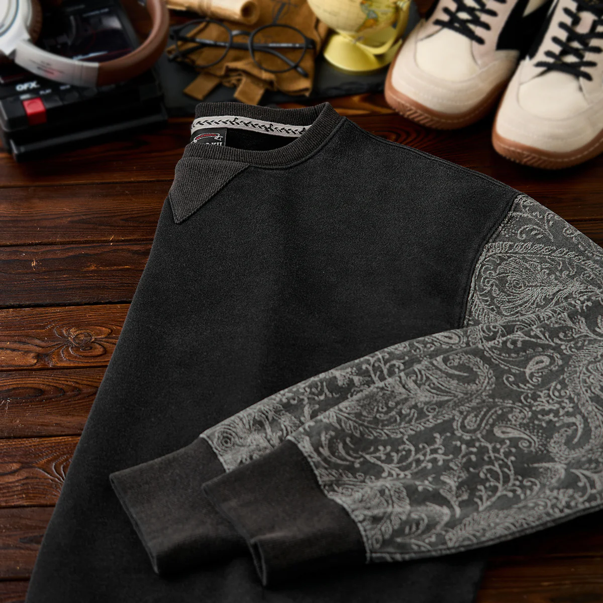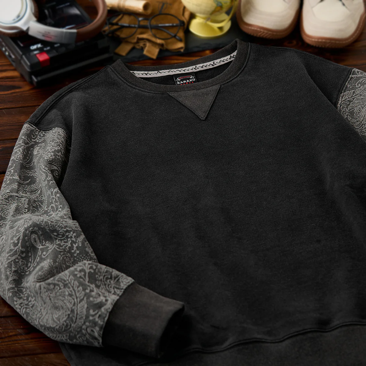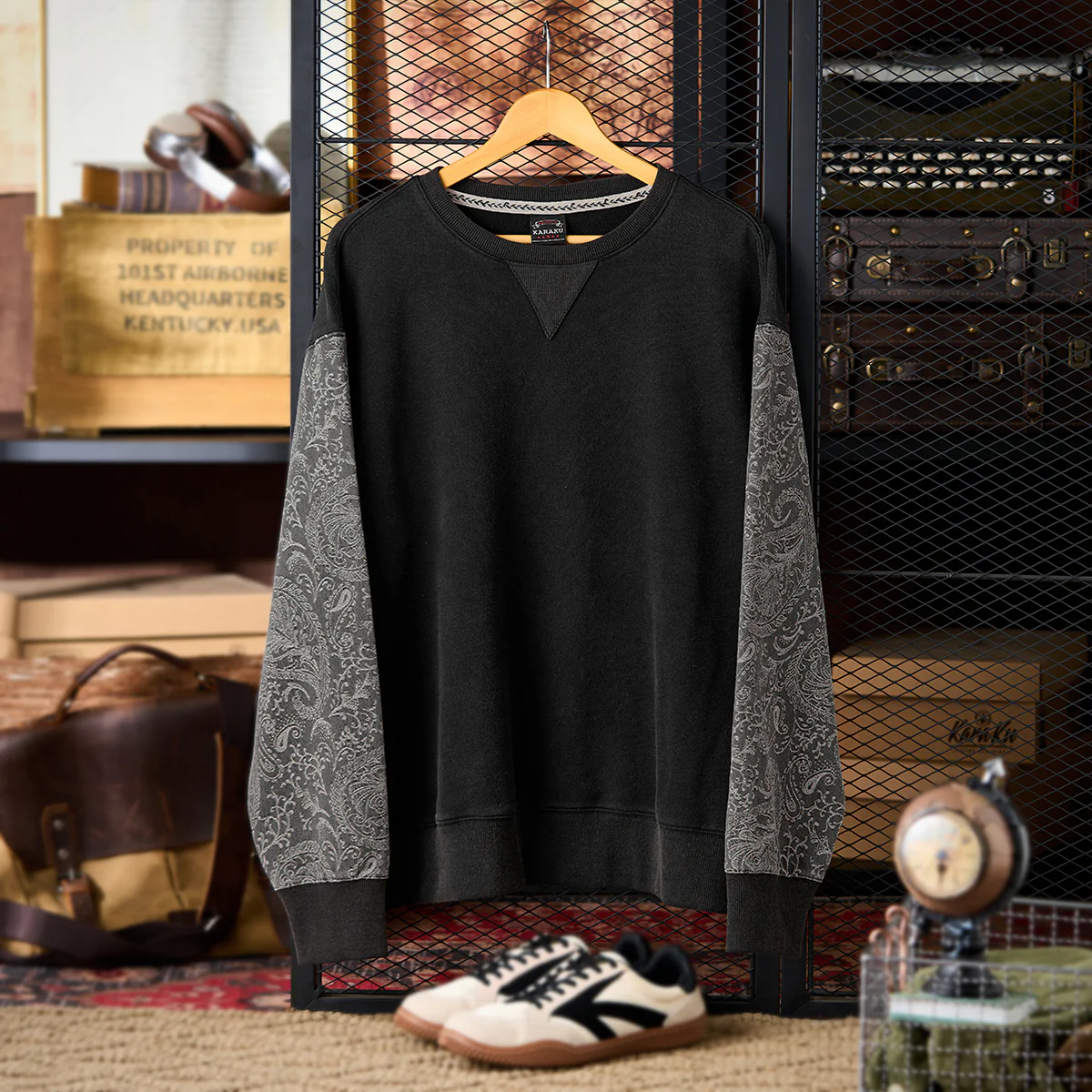 • 袖ペイズリー柄ジャガードデニム切替 ウォッシュ加工Vガゼットスウェット