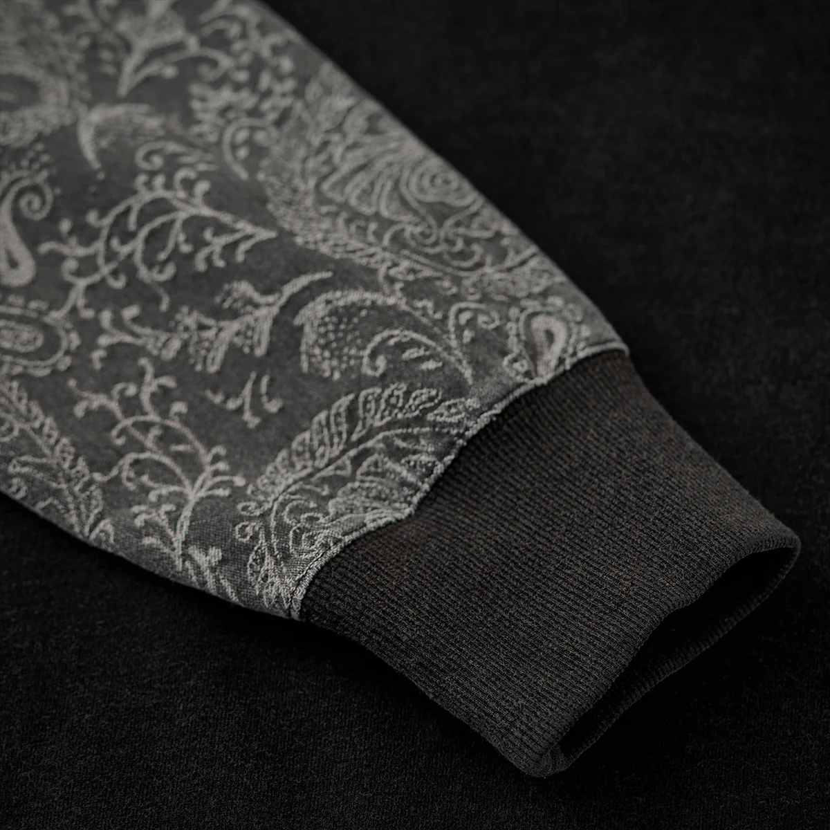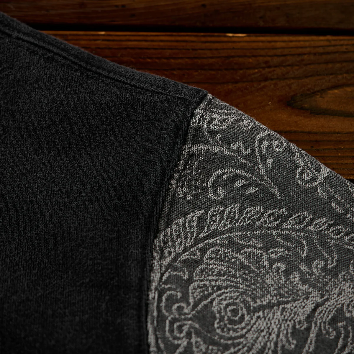 袖部分にペイズリー柄の装飾が、全体的にクラシックかつエレガントな雰囲気を演出。ジャガード織りの立体感とデニムの丈夫な質感が相まって、袖に独特の個性と存在感を与えています。