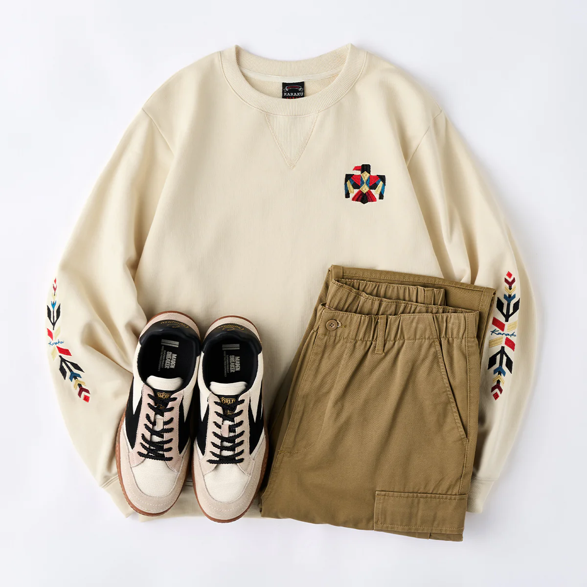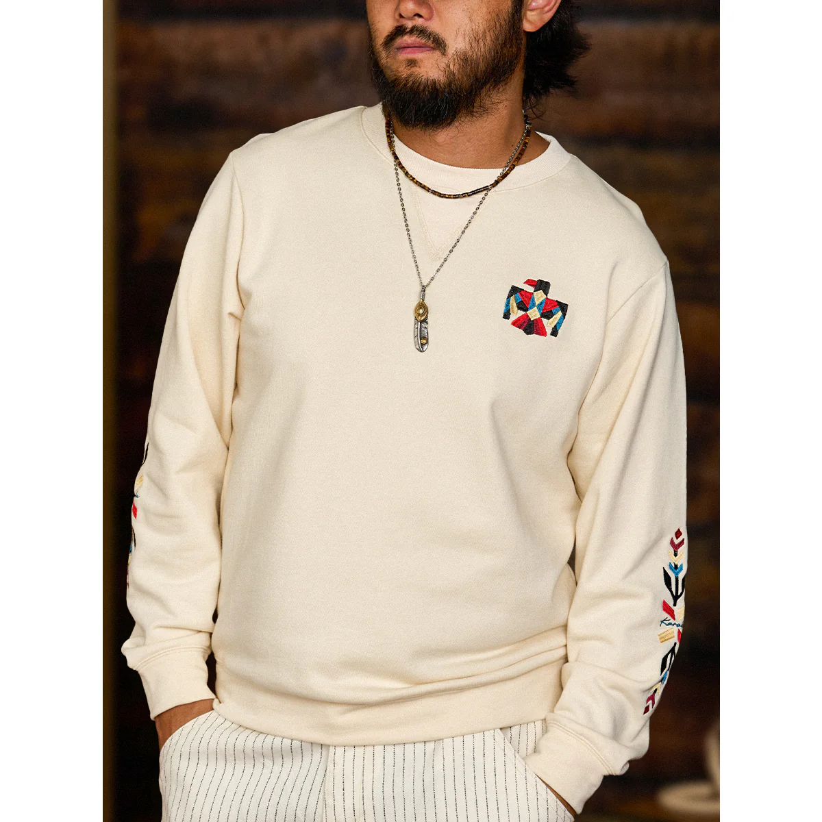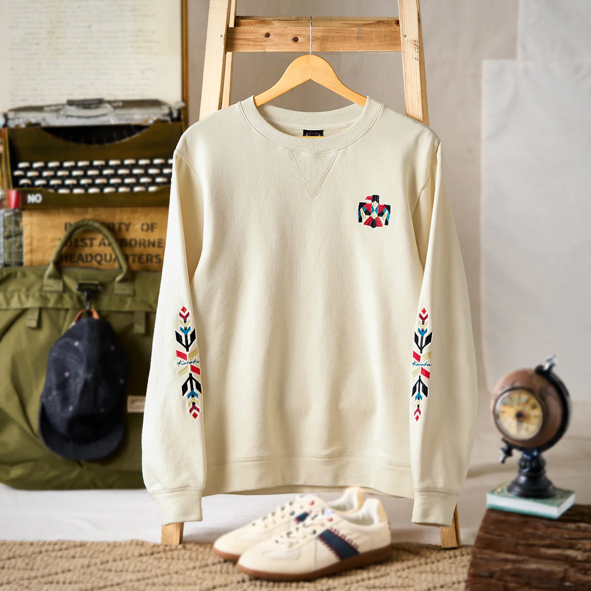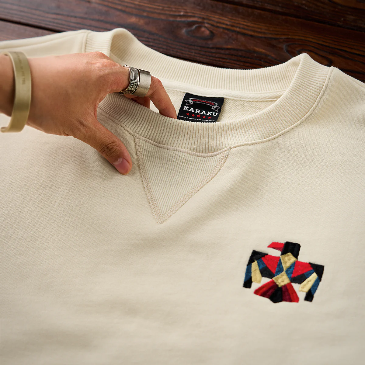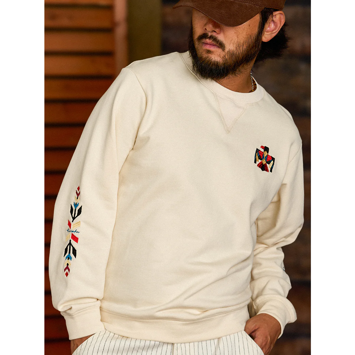 ネイティブアメリカンの象徴「サンダーバード」を胸元に、両袖には力強いナバホ柄の刺繍を施した、存在感あふれる一着。立体感のある刺繍が、奥行きと力強さを生み出し、一枚で着ても印象的な仕上がりに。ネック部分には、クラシックなスウェットシャツやTシャツに見られる「Vガゼット」を採用。スポーティーなアクセントを加えつつ、全体のバランスを引き締めています。襟・袖・裾には、同系色の厚手リブを配し、カジュアルながらも王道のヴィンテージスウェットらしい佇まいに。1枚で主役として着こなすのはもちろん、ジャケットのインナーとしても存在感を発揮。伝統的なモチーフとモダンな感性を融合させた、karakuらしい一着です。