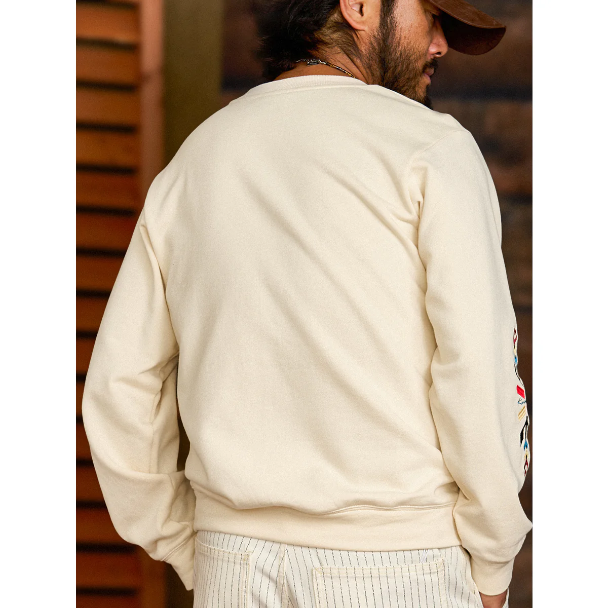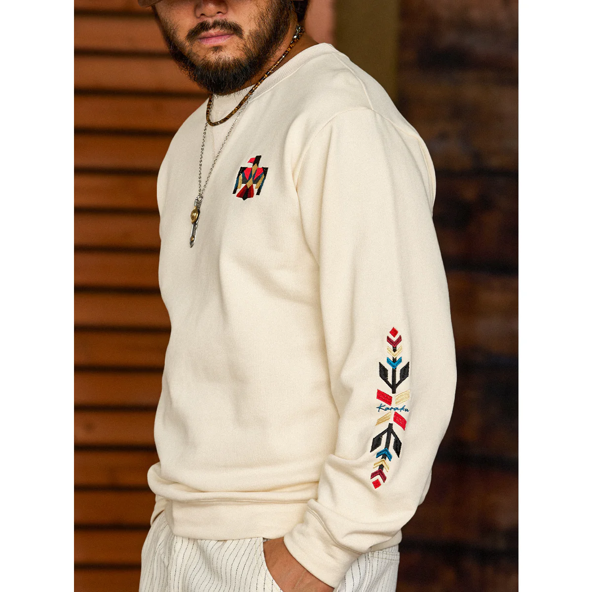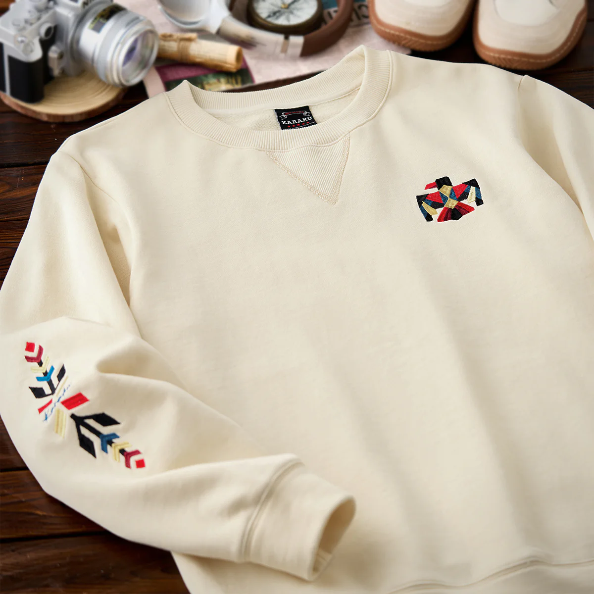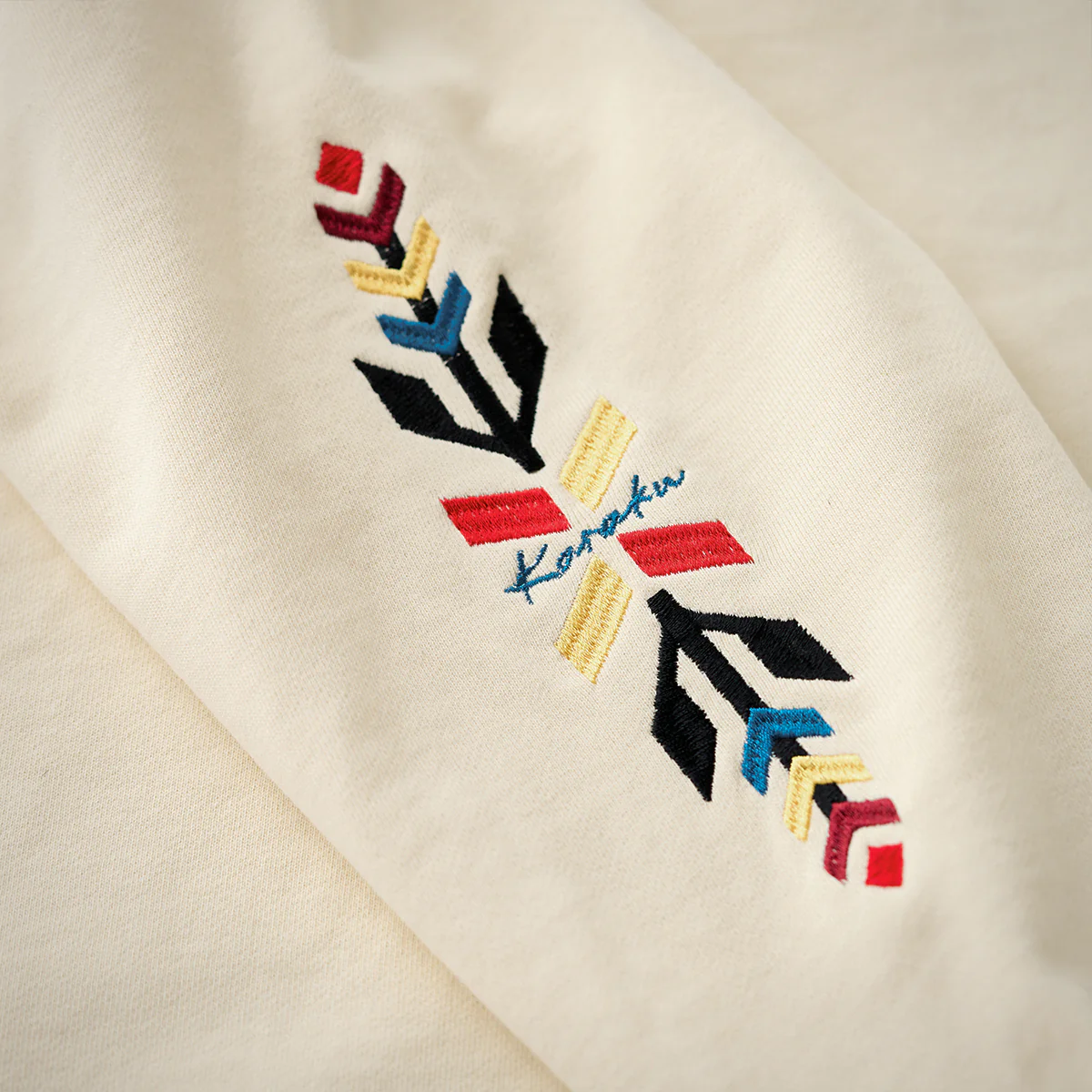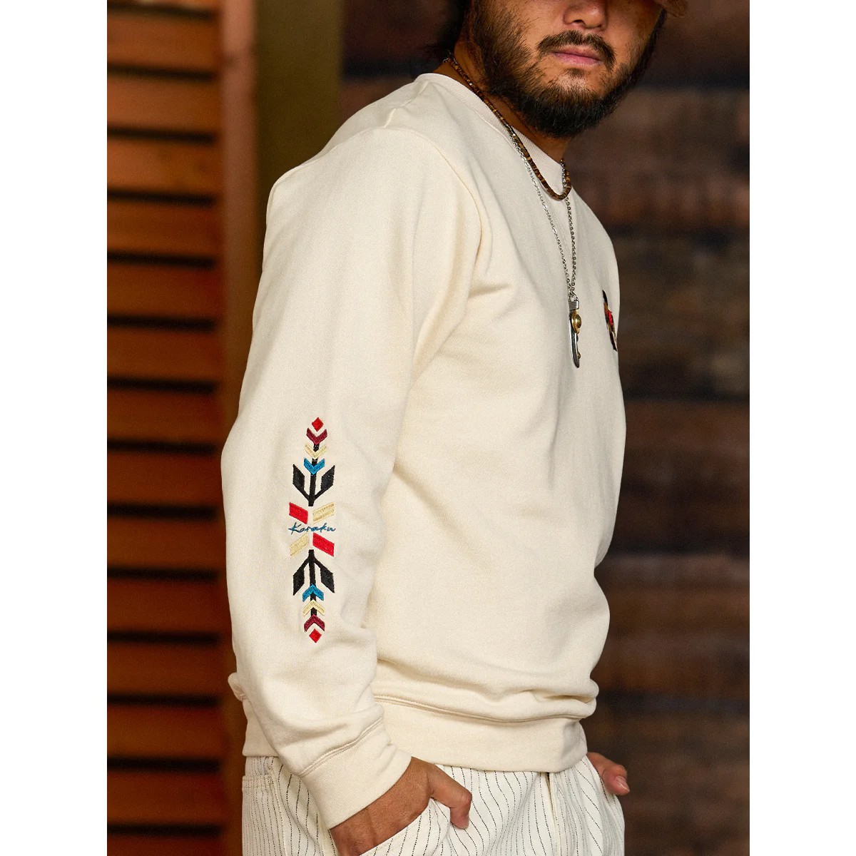 ネイティブアメリカンの象徴「サンダーバード」を胸元に、両袖には力強いナバホ柄の刺繍を施した、存在感あふれる一着。立体感のある刺繍が、奥行きと力強さを生み出し、一枚で着ても印象的な仕上がりに。ネック部分には、クラシックなスウェットシャツやTシャツに見られる「Vガゼット」を採用。スポーティーなアクセントを加えつつ、全体のバランスを引き締めています。襟・袖・裾には、同系色の厚手リブを配し、カジュアルながらも王道のヴィンテージスウェットらしい佇まいに。1枚で主役として着こなすのはもちろん、ジャケットのインナーとしても存在感を発揮。伝統的なモチーフとモダンな感性を融合させた、karakuらしい一着です。