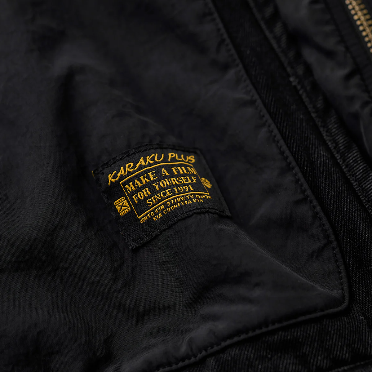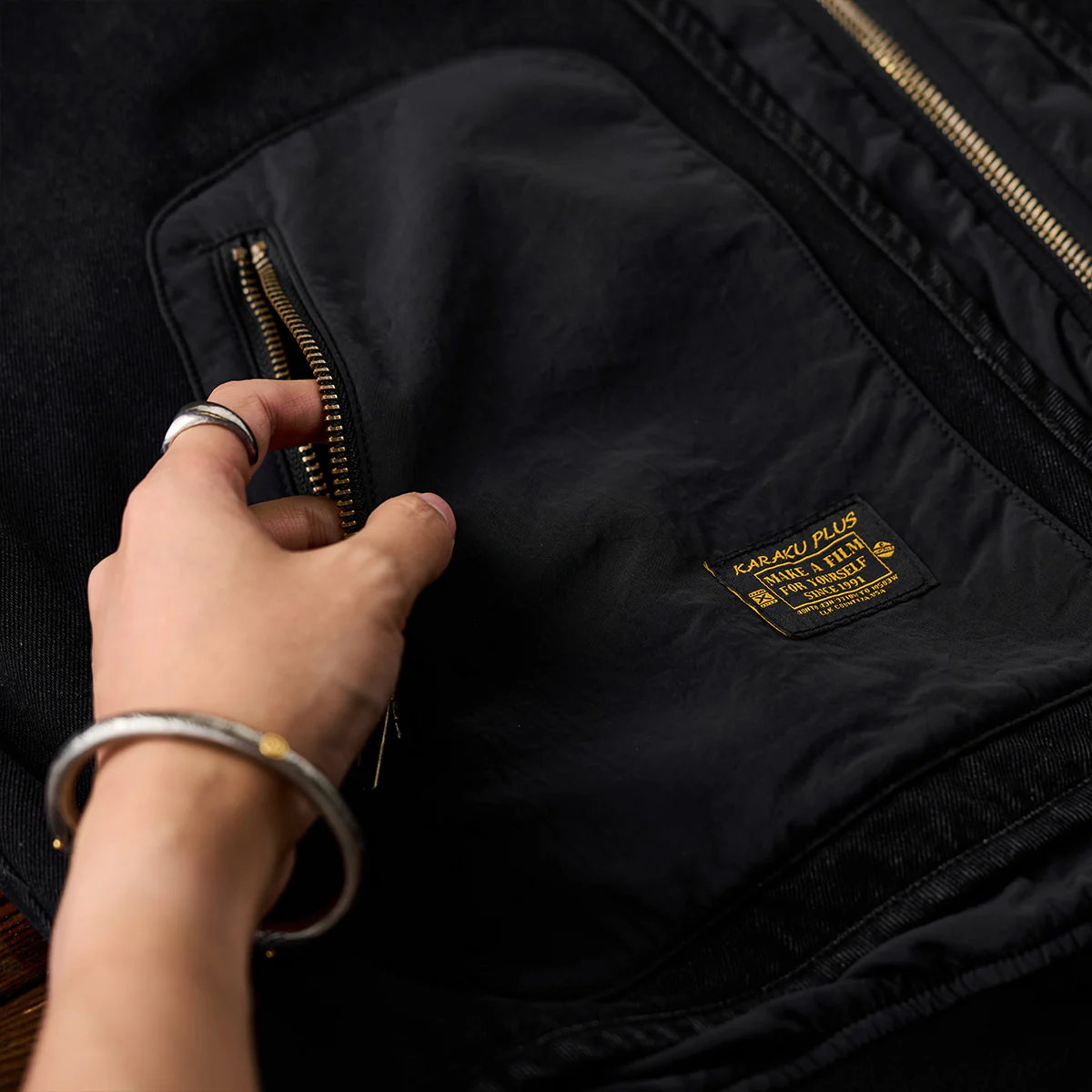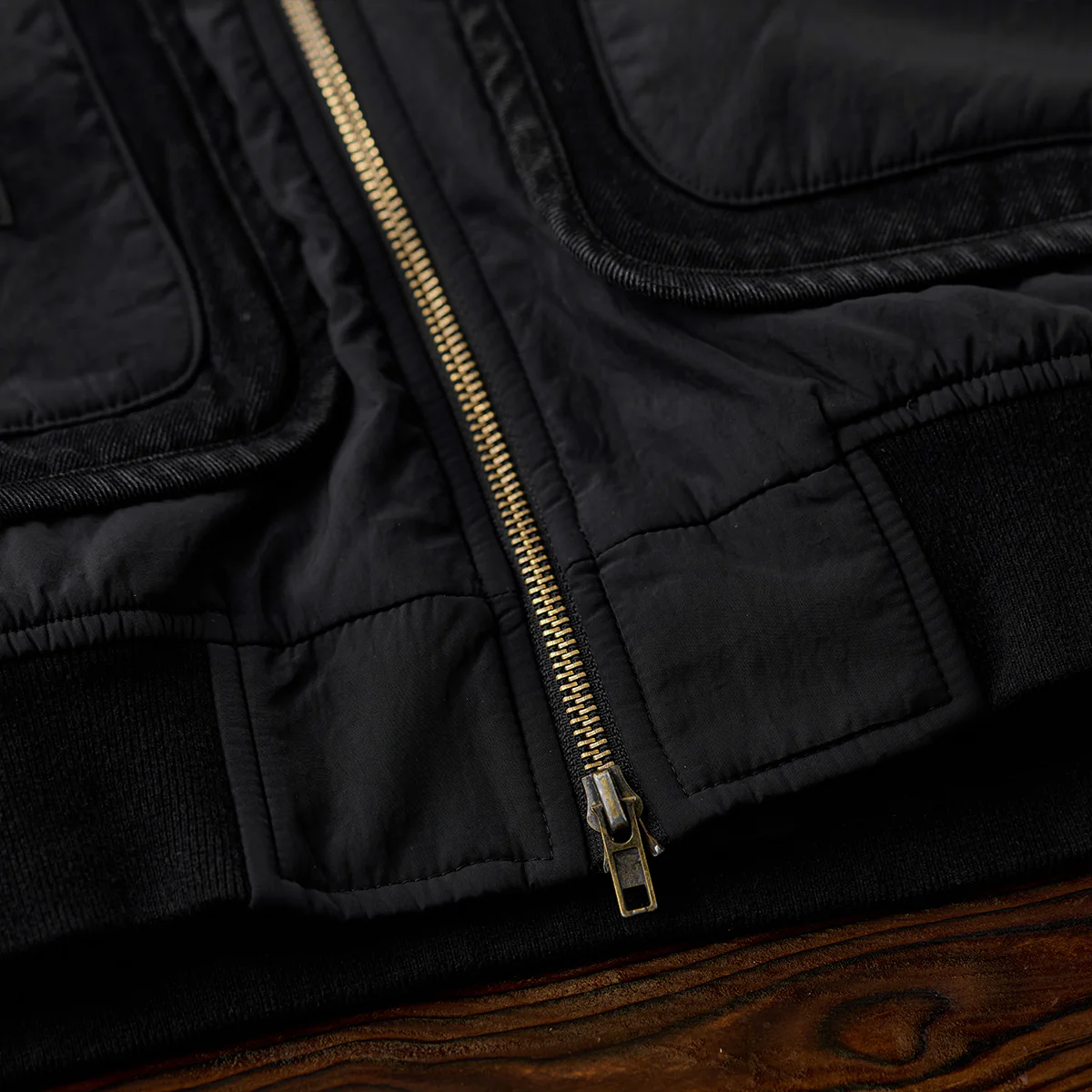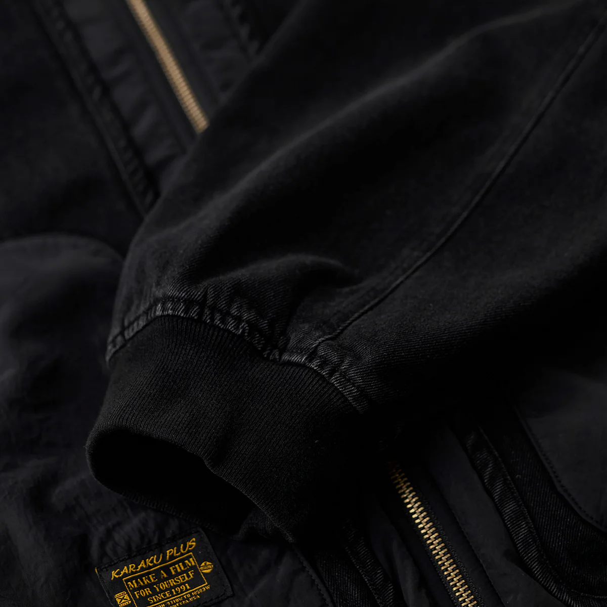 フロントジップとポケットジップにはゴールドカラーを使用して、ブラックの中でアクセントとなっています。ジップ自体もヴィンテージ風の加工が施され、高級感を感じさせます。