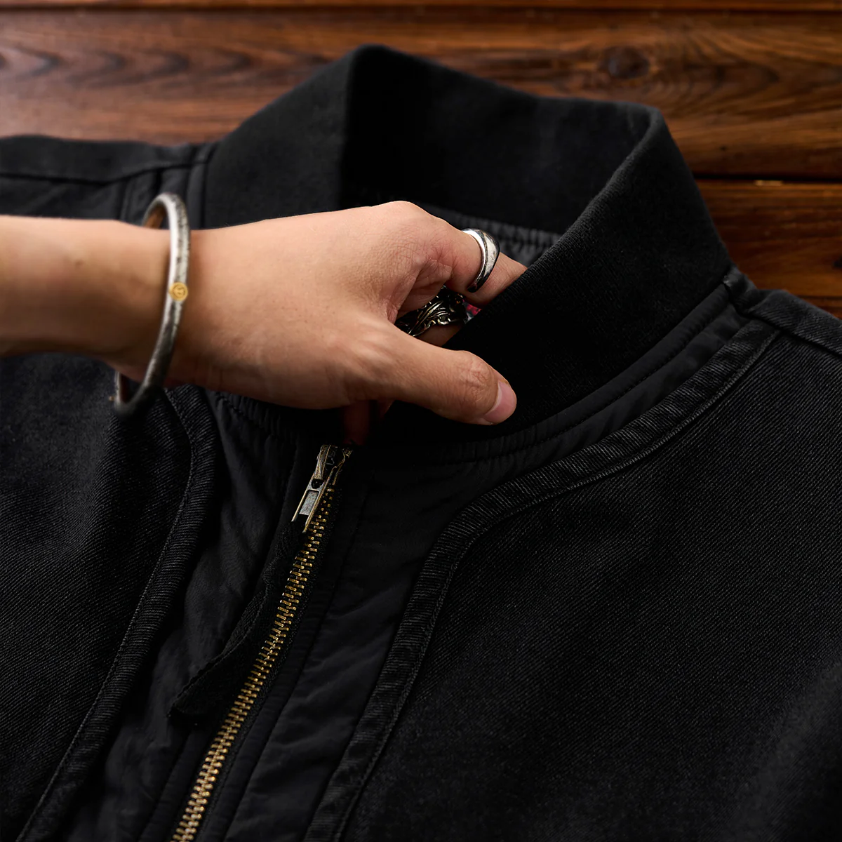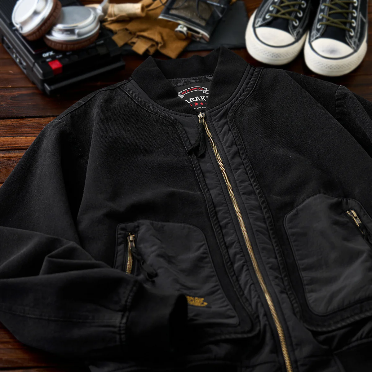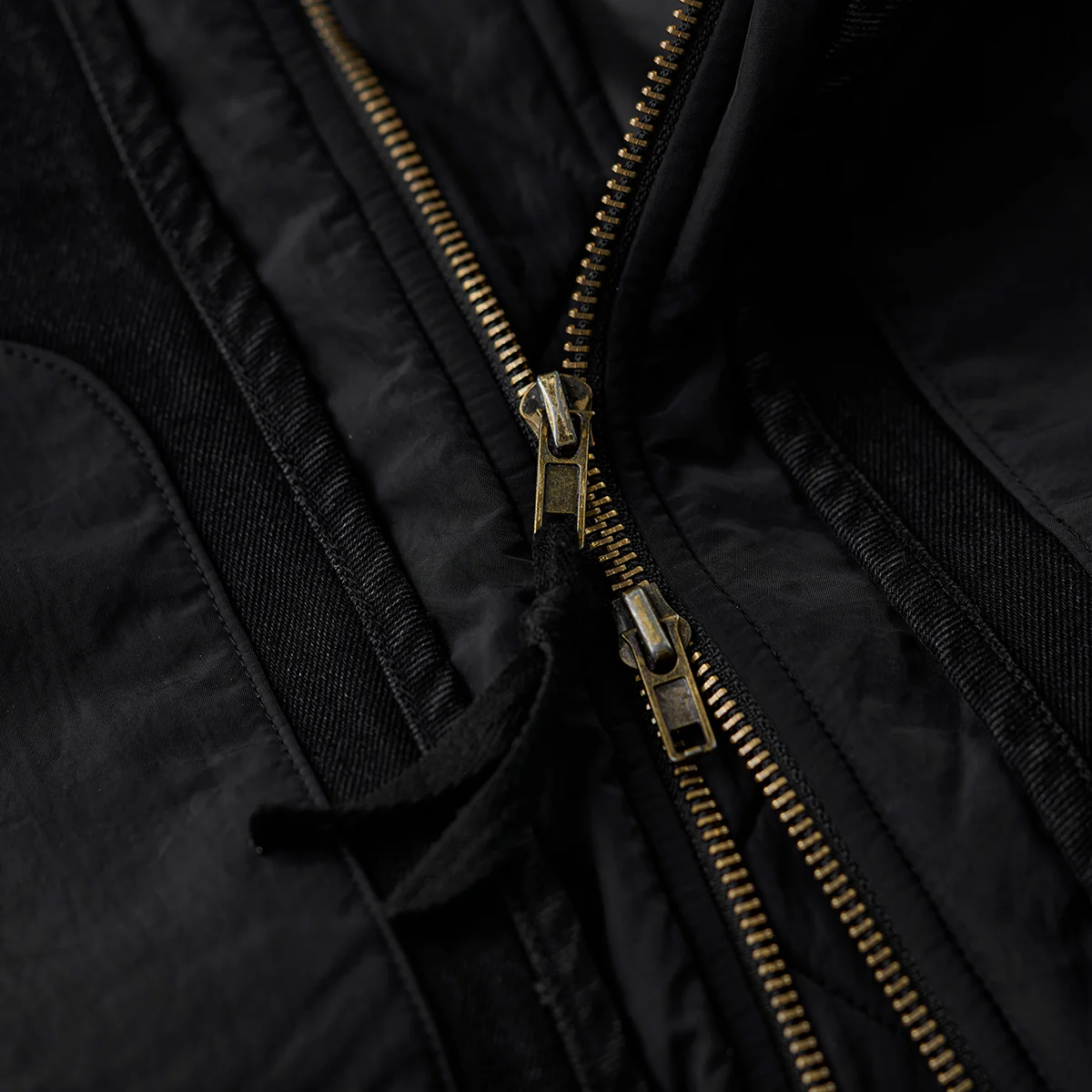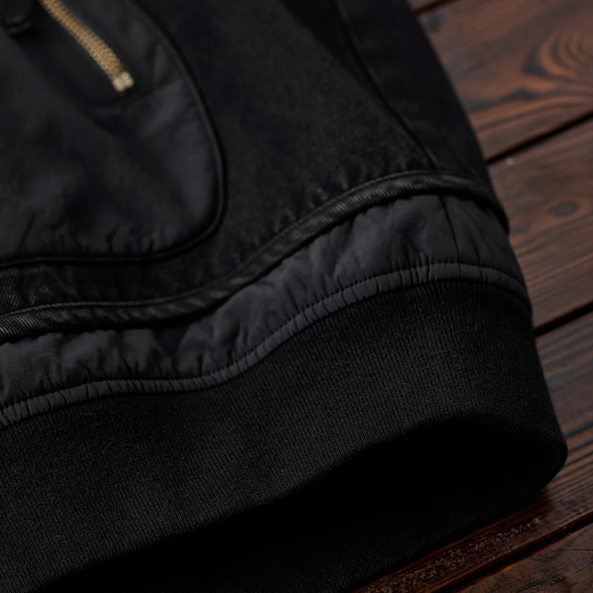 フロントジップとポケットジップにはゴールドカラーを使用して、ブラックの中でアクセントとなっています。ジップ自体もヴィンテージ風の加工が施され、高級感を感じさせます。