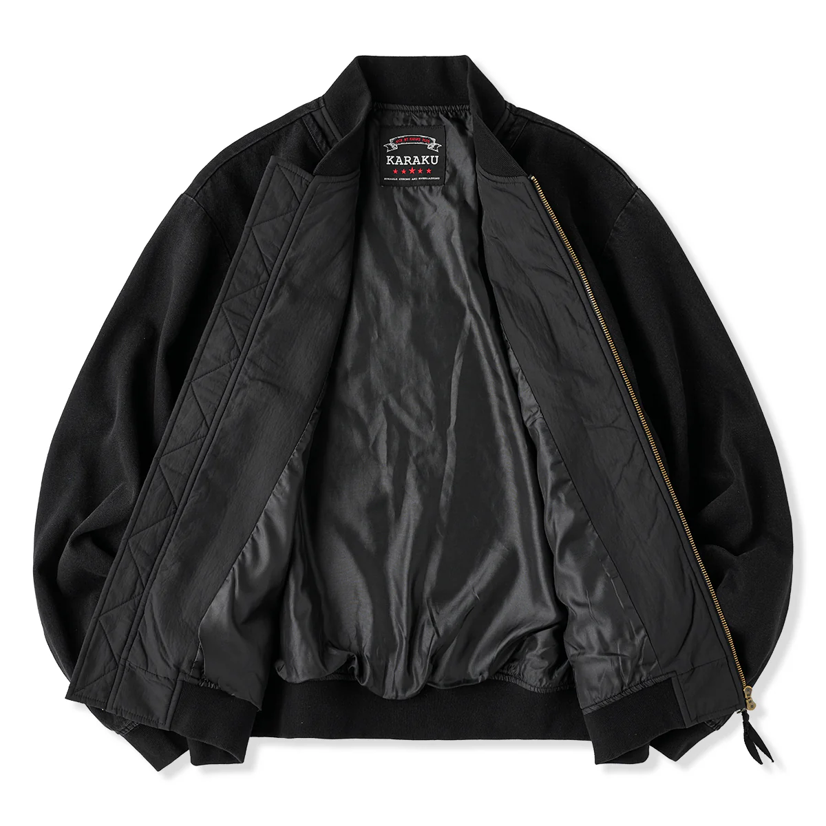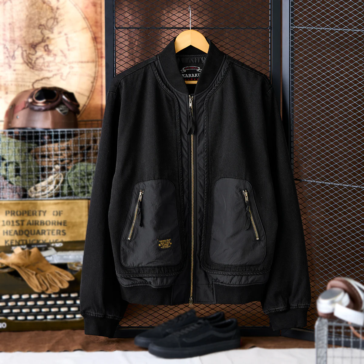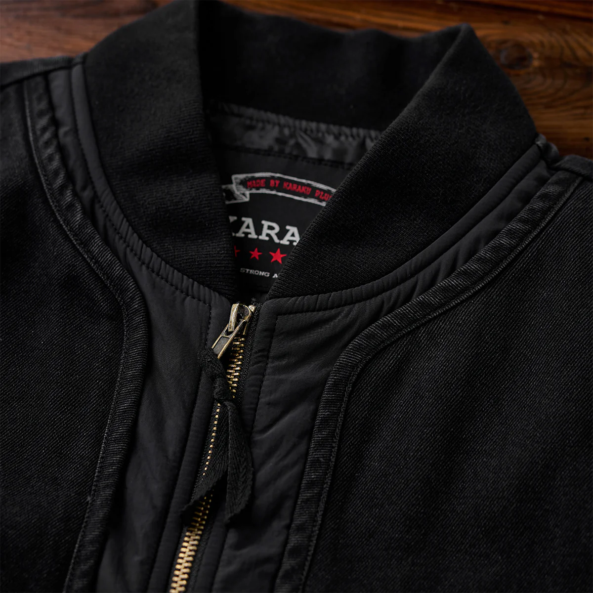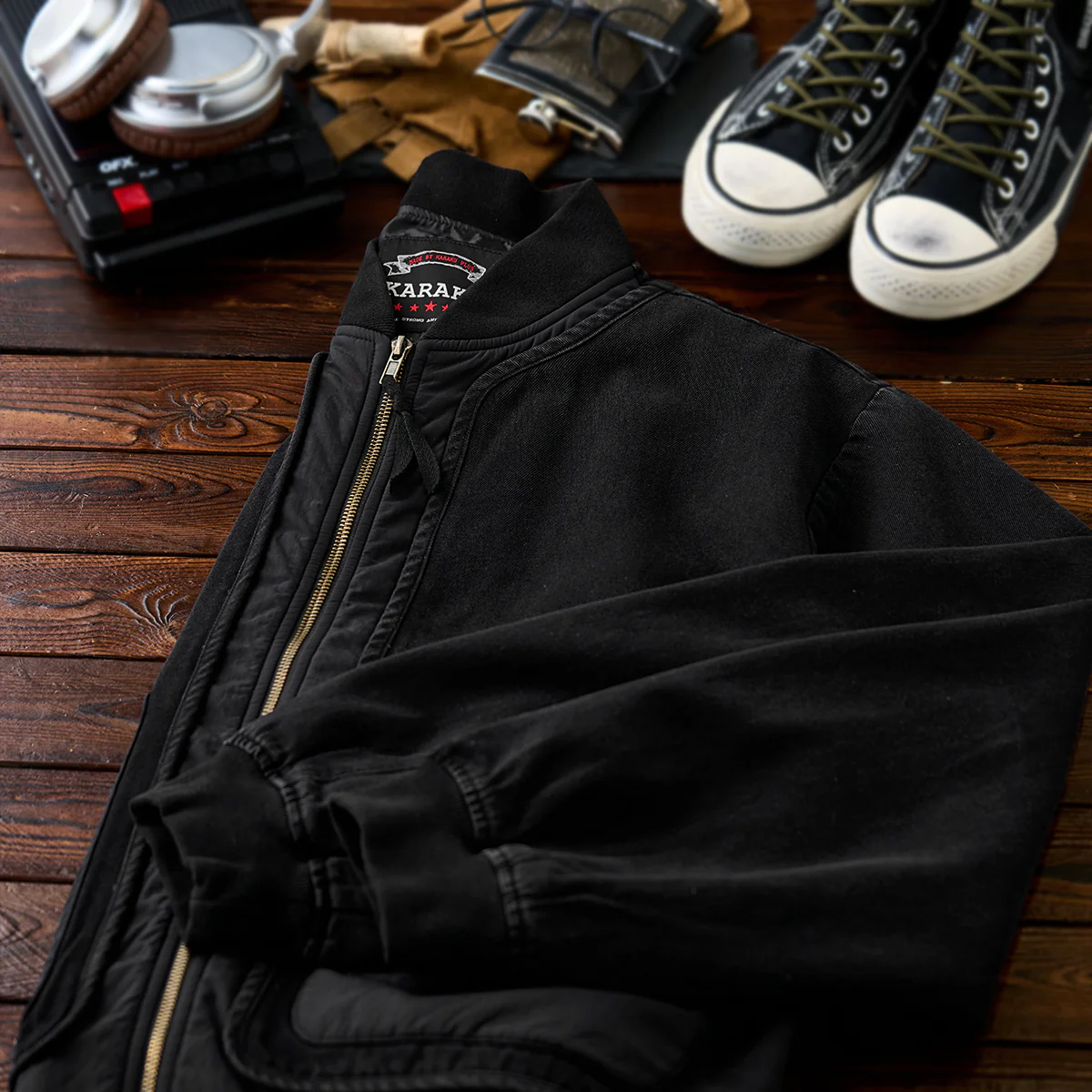 フロントジップとポケットジップにはゴールドカラーを使用して、ブラックの中でアクセントとなっています。ジップ自体もヴィンテージ風の加工が施され、高級感を感じさせます。