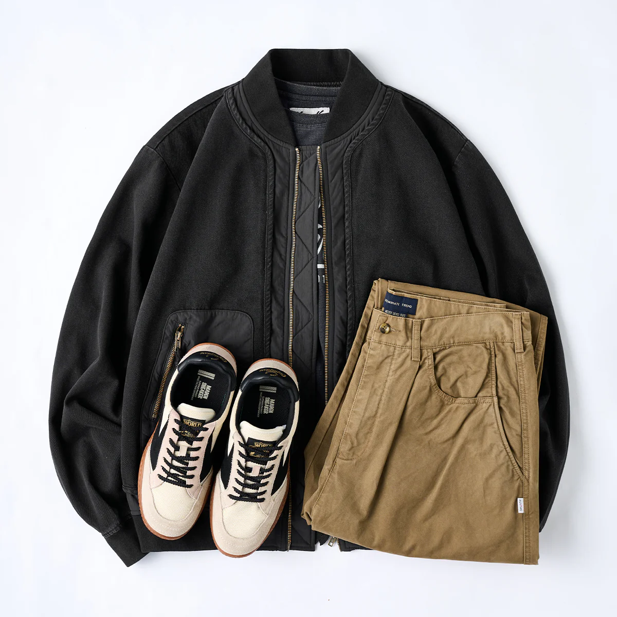 異素材を使用した大きめのポケットが配置されて、実用性とデザイン性を兼ね備えています。リブによる裾の絞りが全体のバランスを取り、ダボつきを防いでいます。