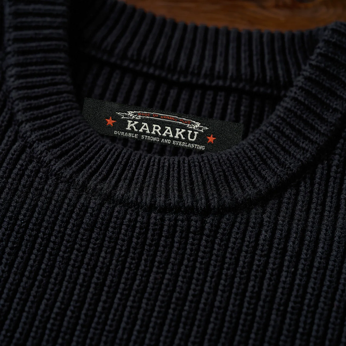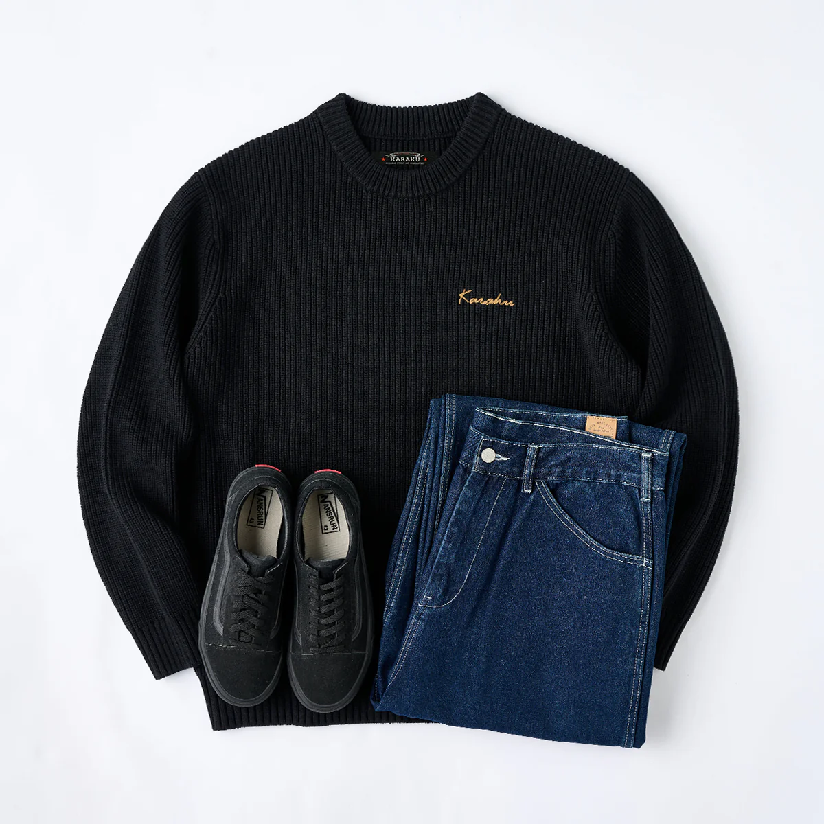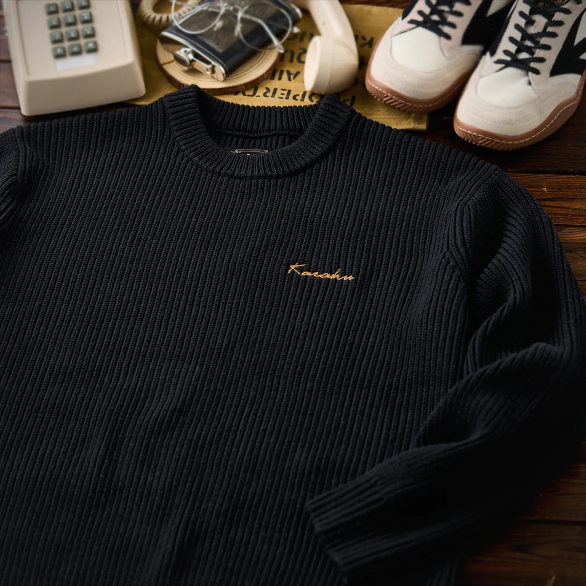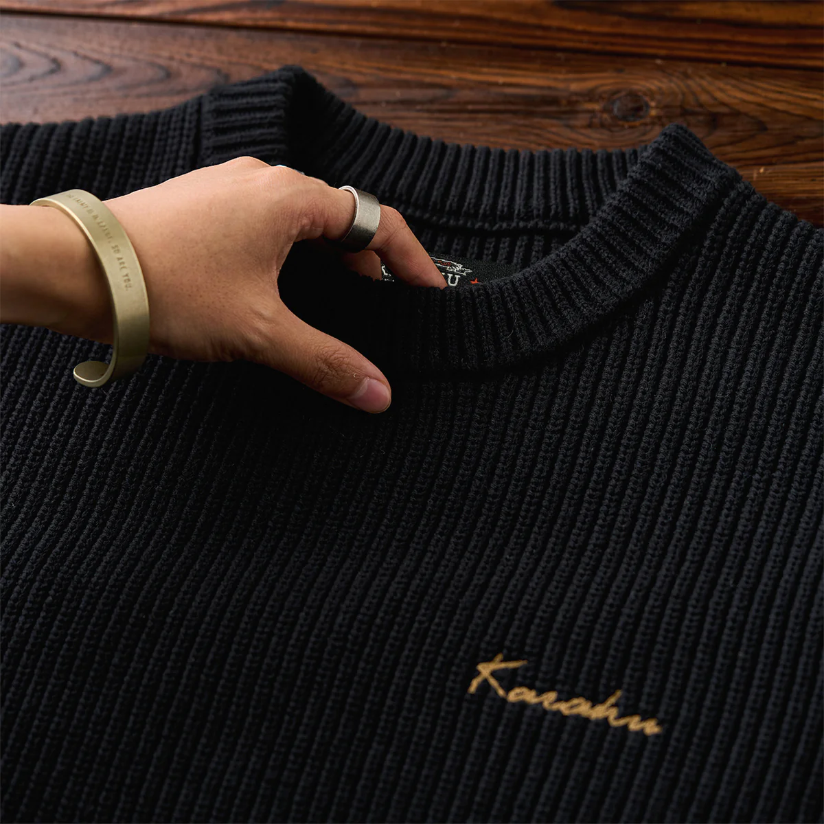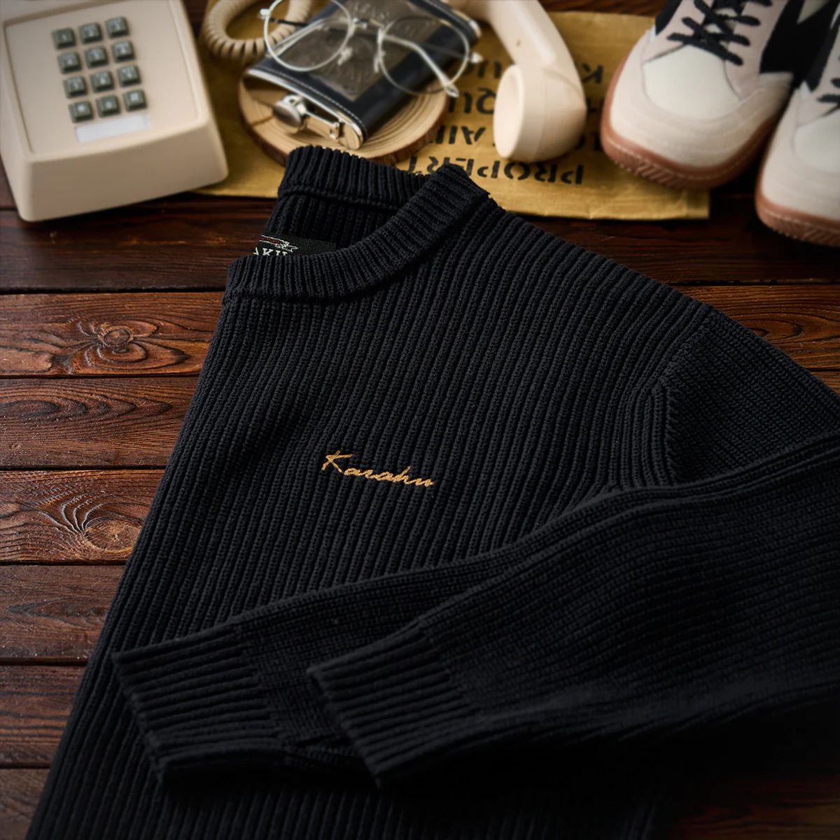 • 「Karaku」ロゴ刺繡入り オールブラックリブ編みニットセーター