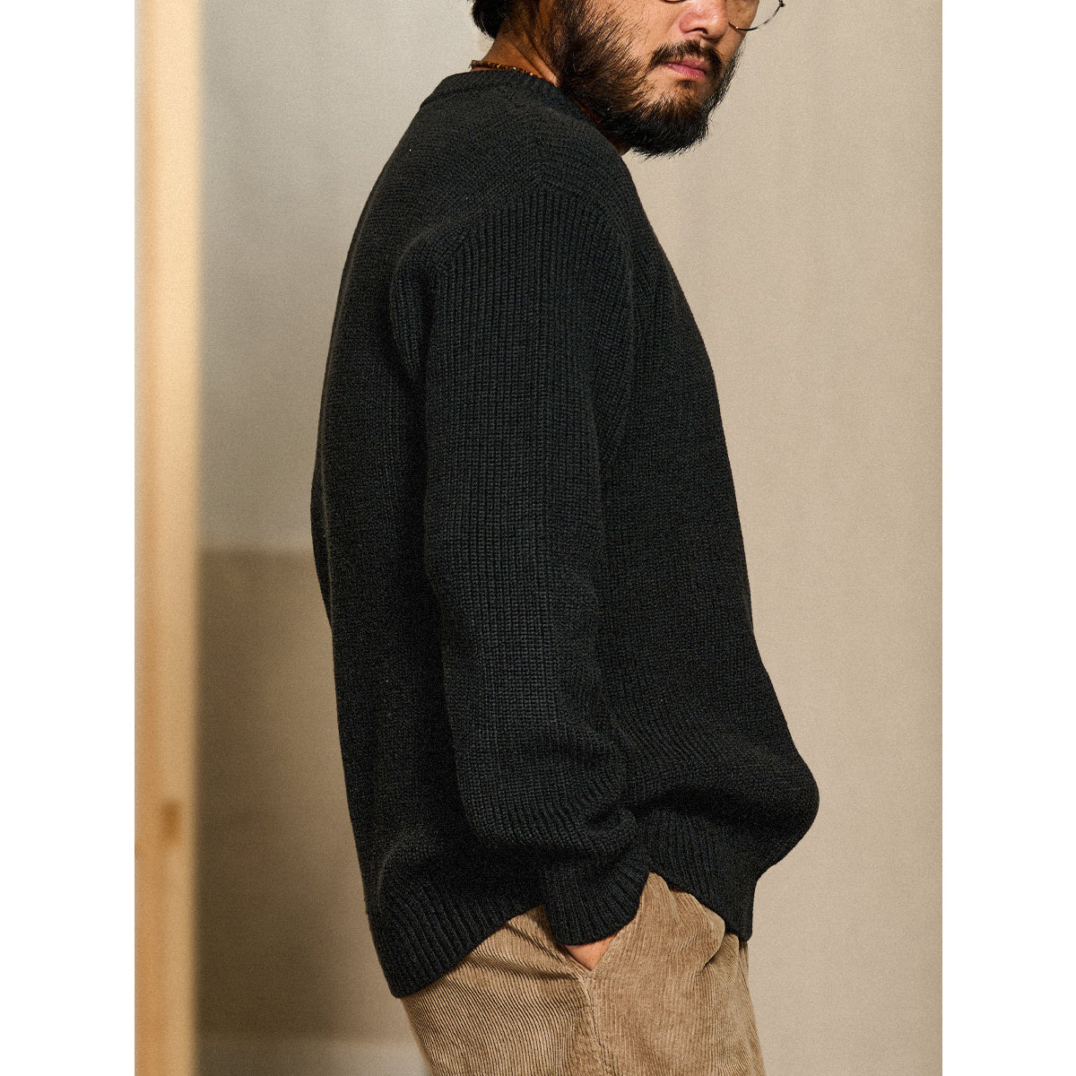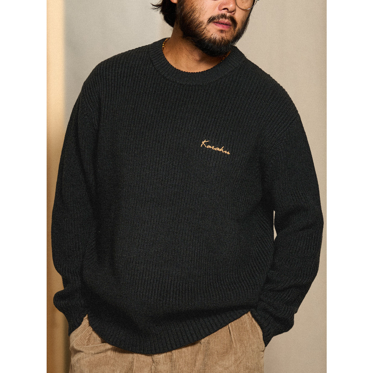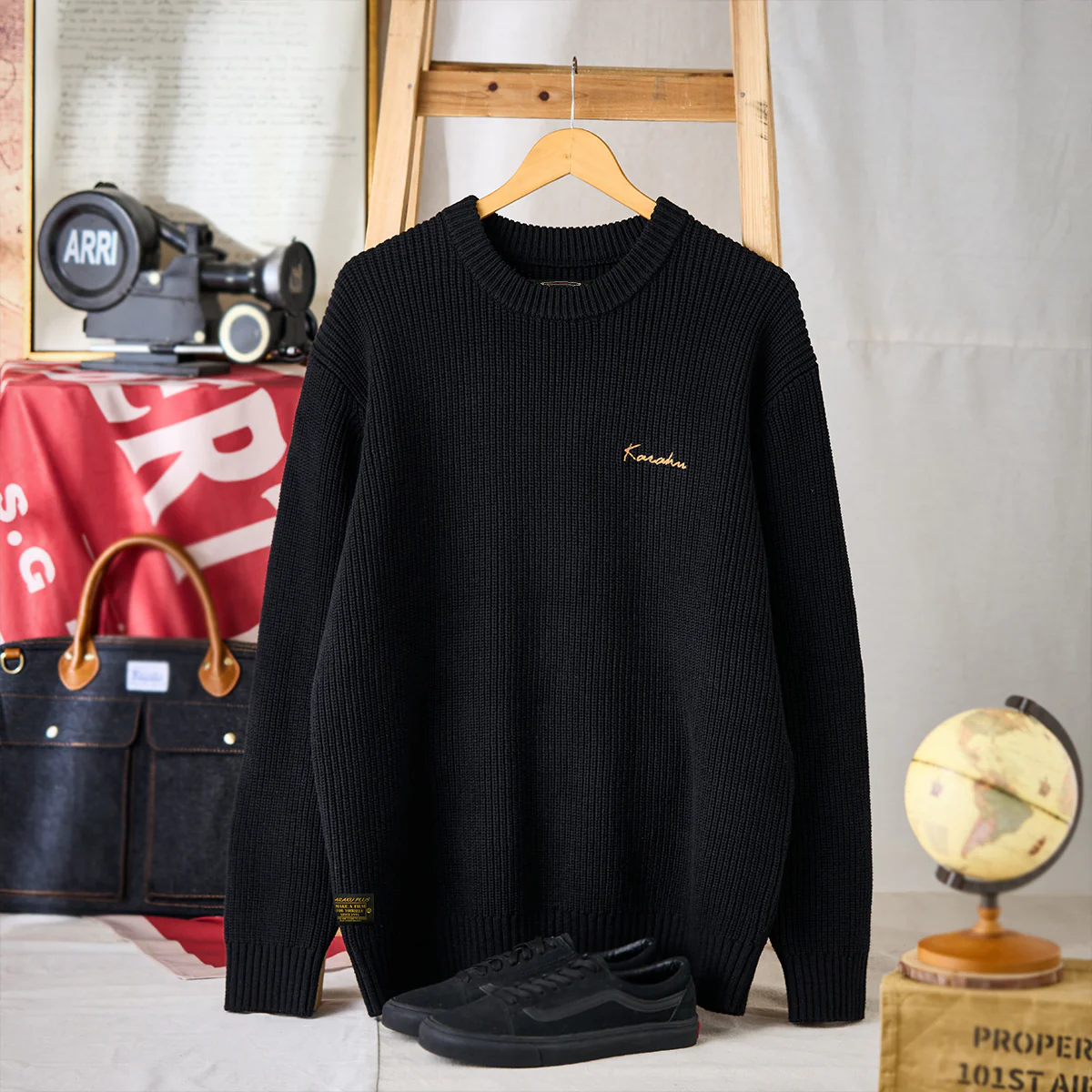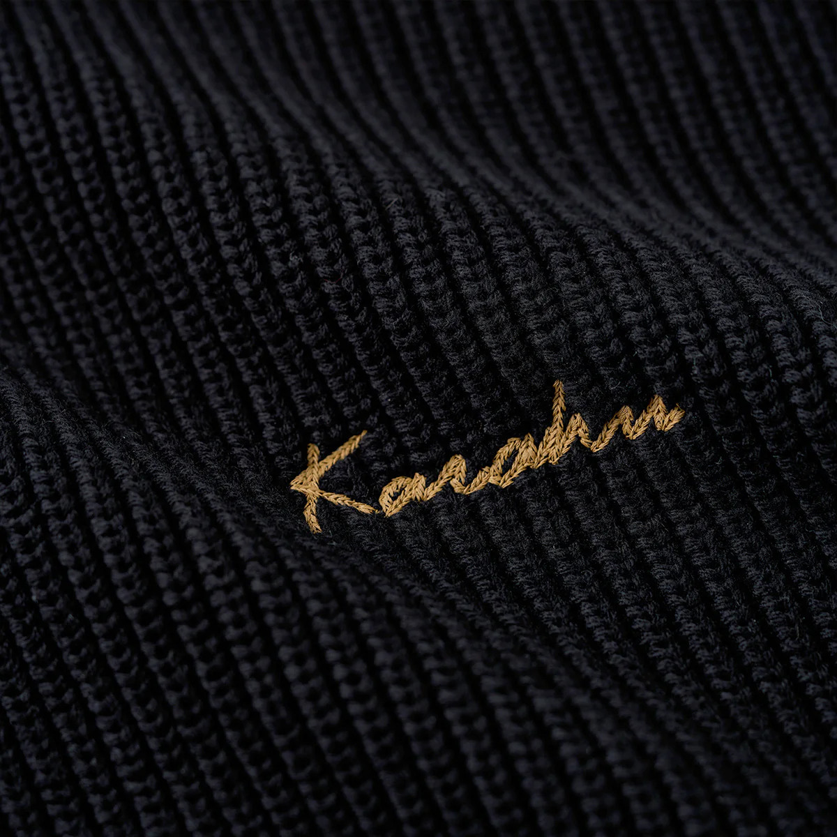 • 「Karaku」ロゴ刺繡入り オールブラックリブ編みニットセーター