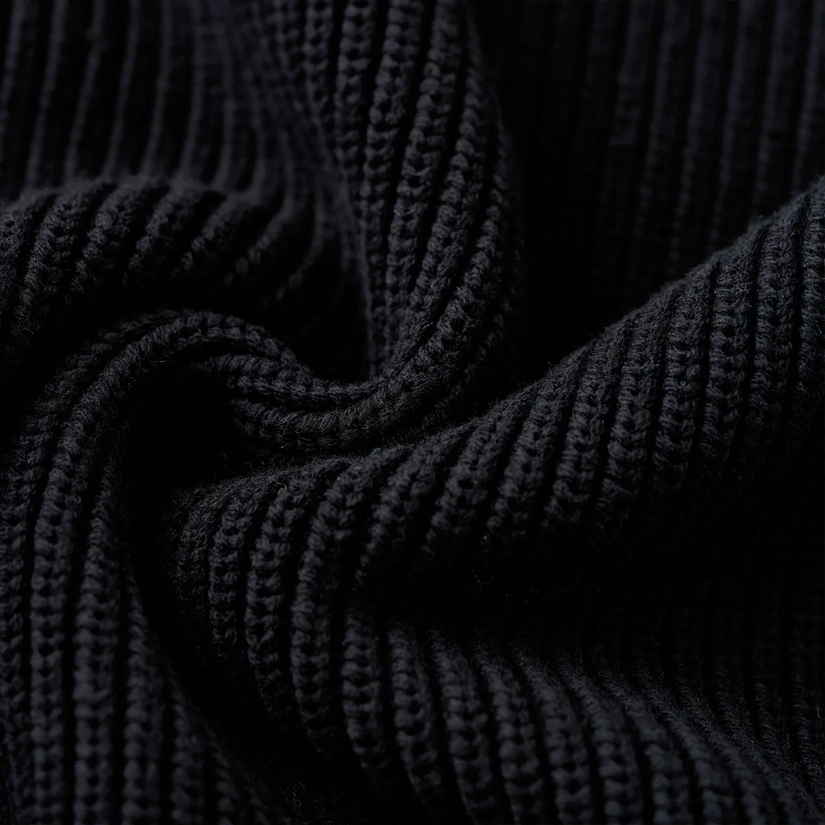ストライプの間に凹凸が生まれるような編み方が施され、デザインに奥行きを与えています。全体は落ち着いたブラックで統一され、シンプルかつ洗練された印象を与えます。ブラックはどんなスタイルにも合わせやすく、汎用性が高い。