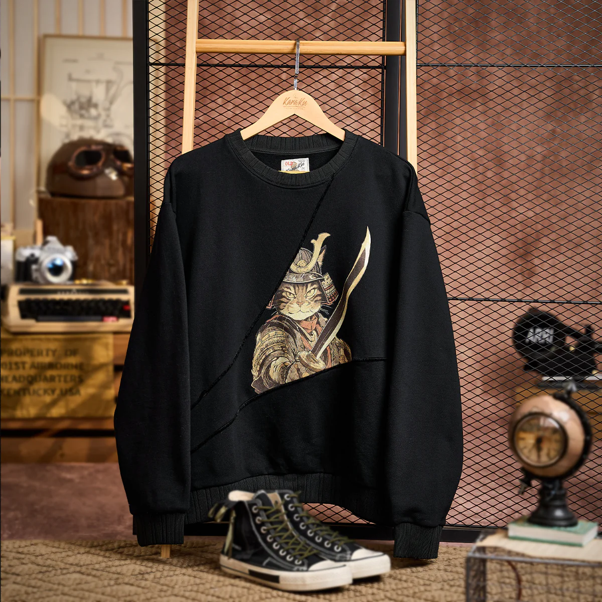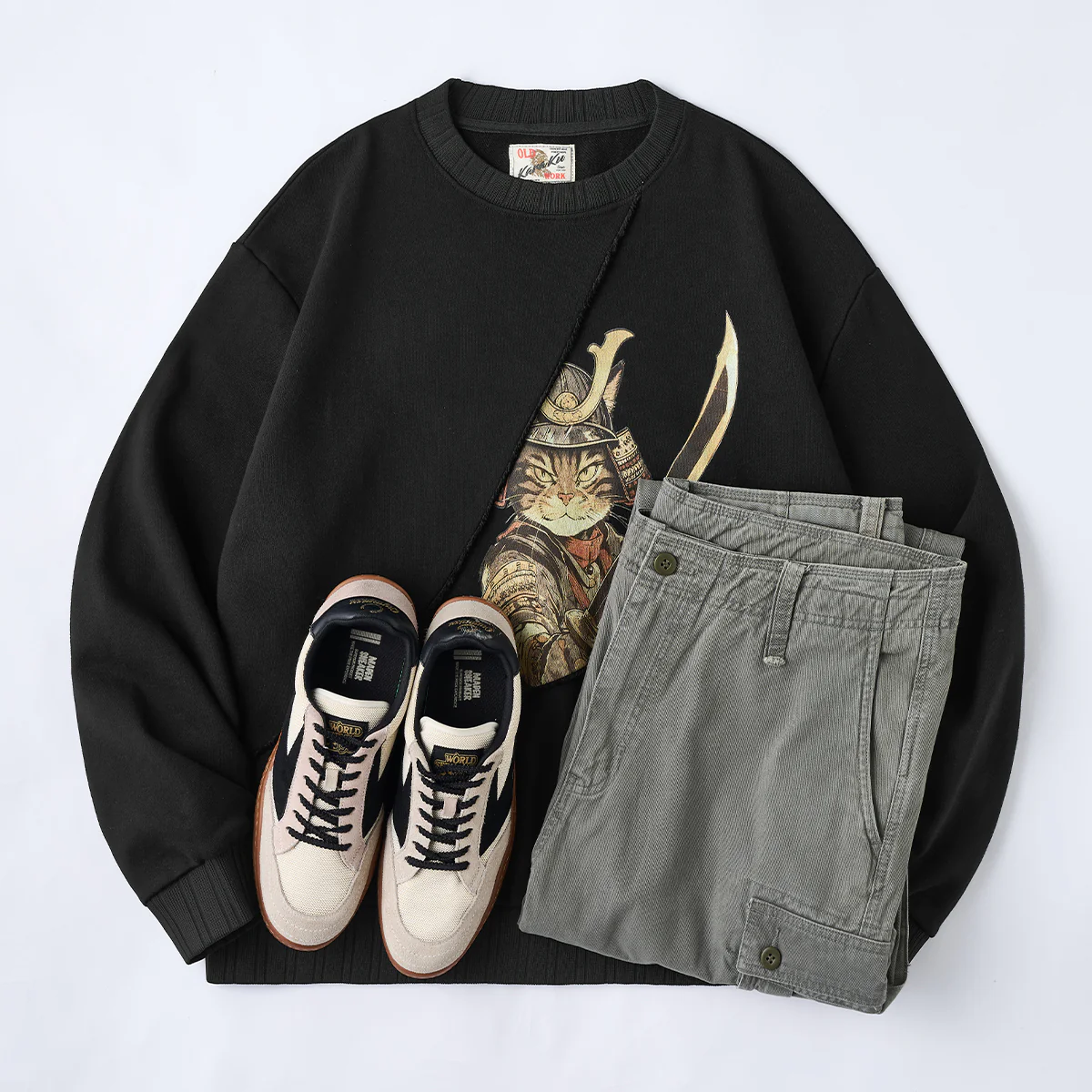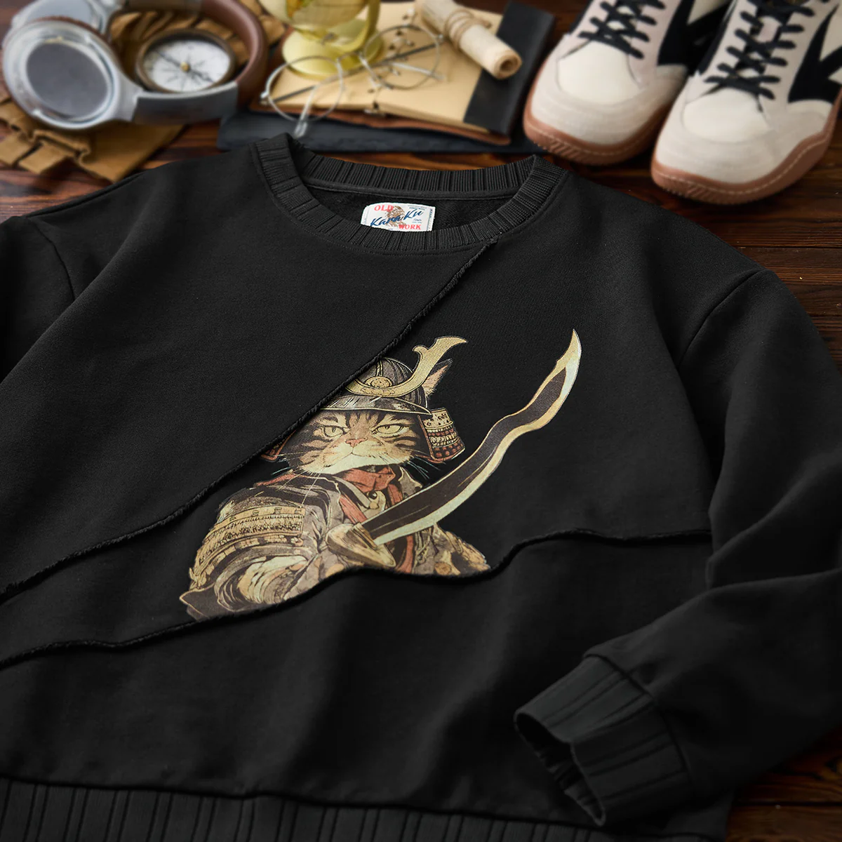 裏起毛のスウェットに、刀を振り下ろす“武士猫”の瞬間を切り取ったグラフィックをオン。ネックから裾へ、さらに左腰から右腰へと走るカットオフ風のフリンジ加工を施し、あえてプリントの一部を隠すことで、まるで武士猫が布地を斬り裂き、中から飛び出してくるようなダイナミックな演出を加えています。遊び心のあるデザインとストーリー性のあるビジュアルで、一枚で主役になる存在感を放つスウェットです。