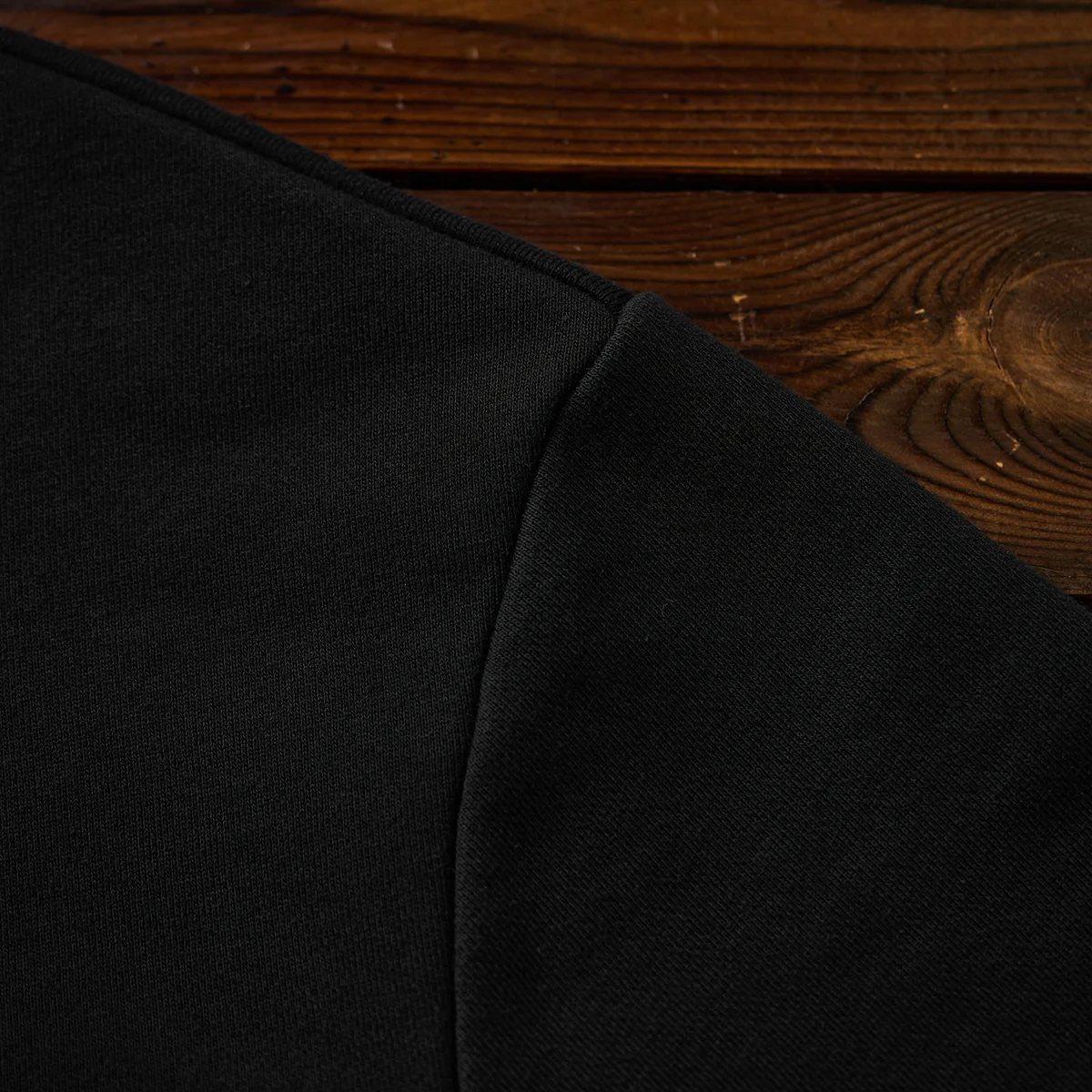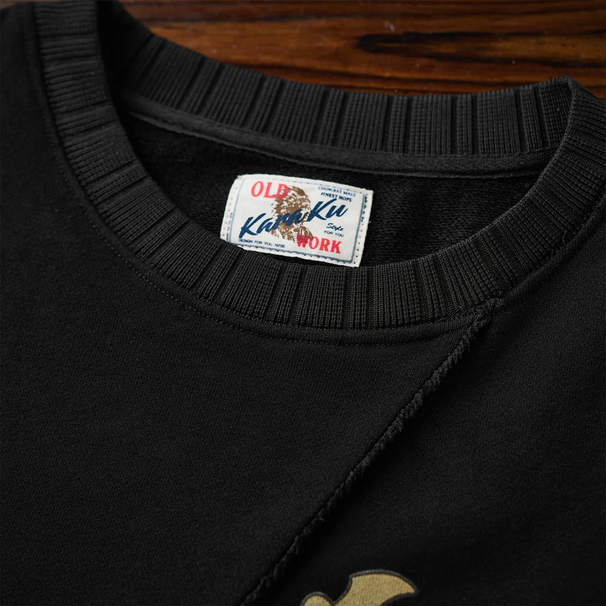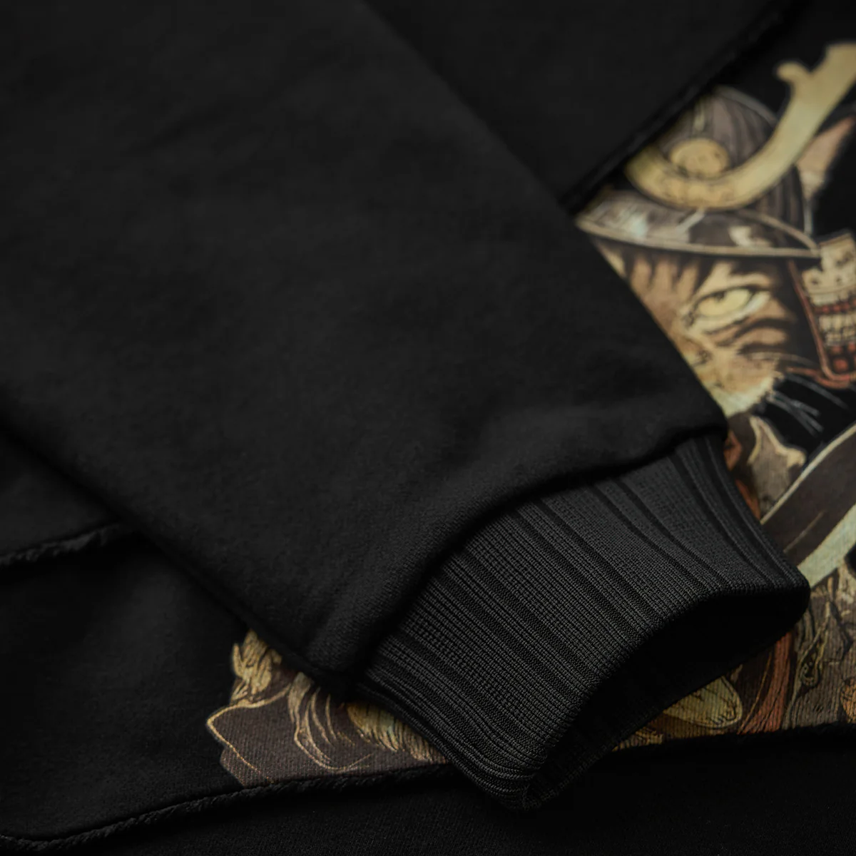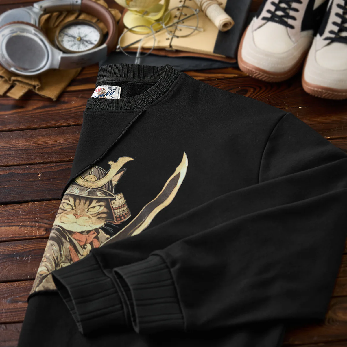 裏起毛のスウェットに、刀を振り下ろす“武士猫”の瞬間を切り取ったグラフィックをオン。ネックから裾へ、さらに左腰から右腰へと走るカットオフ風のフリンジ加工を施し、あえてプリントの一部を隠すことで、まるで武士猫が布地を斬り裂き、中から飛び出してくるようなダイナミックな演出を加えています。遊び心のあるデザインとストーリー性のあるビジュアルで、一枚で主役になる存在感を放つスウェットです。