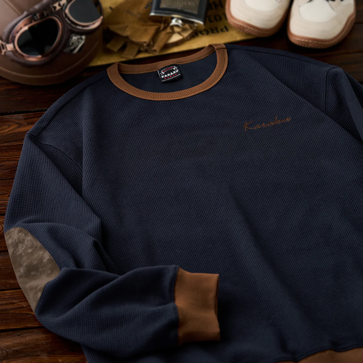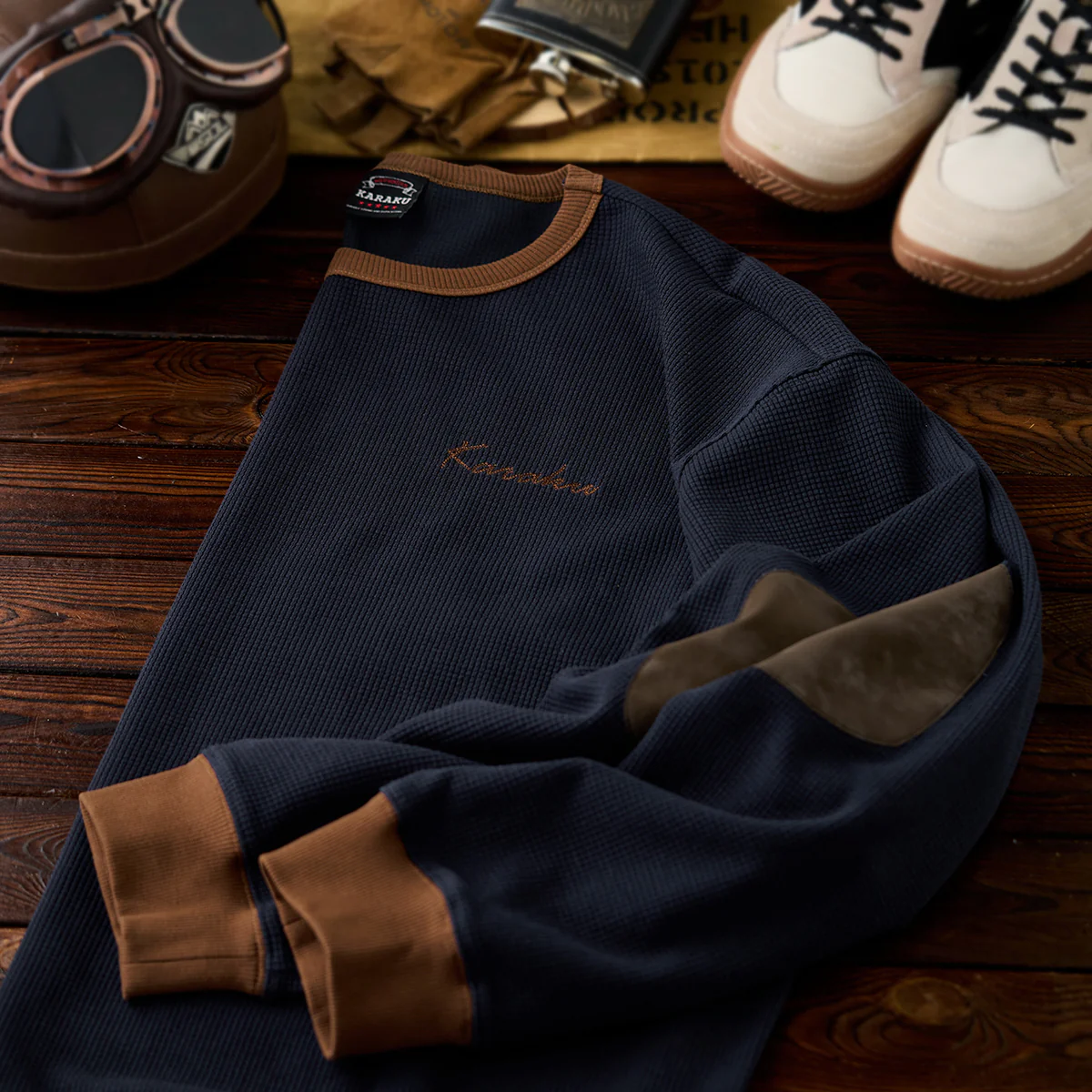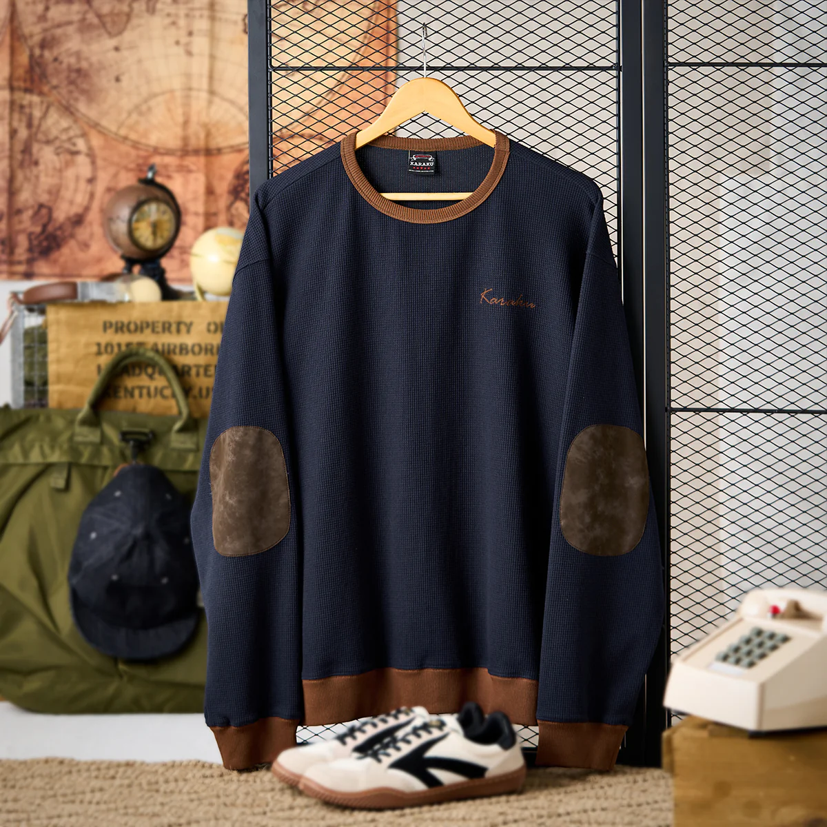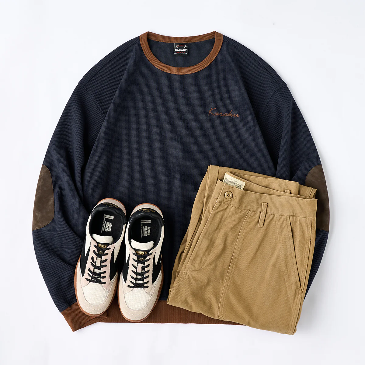 肘にスエードパッチを施し、程よいアクセントと耐久性を兼ね備えたプルオーバースウェット。ワッフル生地を採用し、空気を含んで暖かさを保ちながらも、蒸れにくく快適な着心地を実現しています。胸元には「KaraKu」の刺繡をあしらい、シンプルな中にブランドらしい存在感をプラス。ベーシックなシルエットでデイリーに使いやすく、1枚での着用はもちろん、シャツやアウターとのレイヤードでも活躍する万能アイテムです。