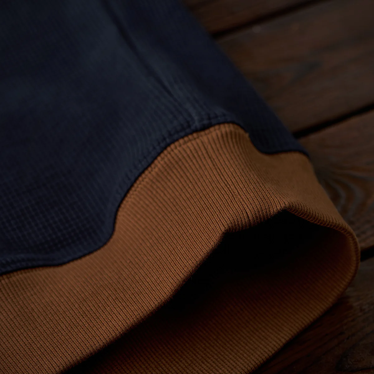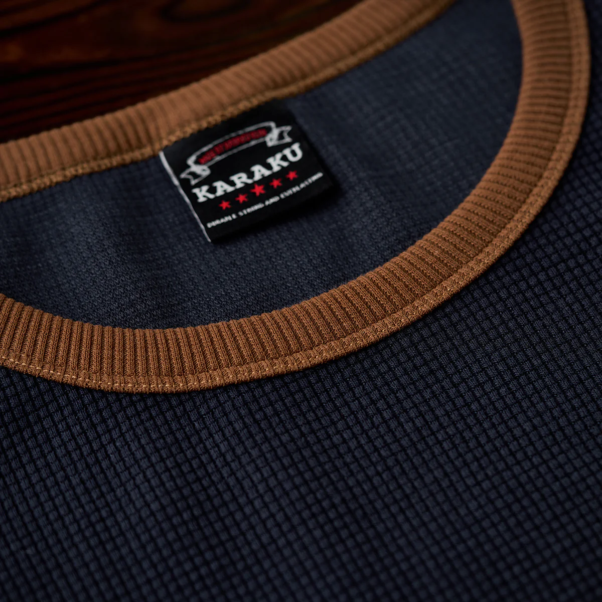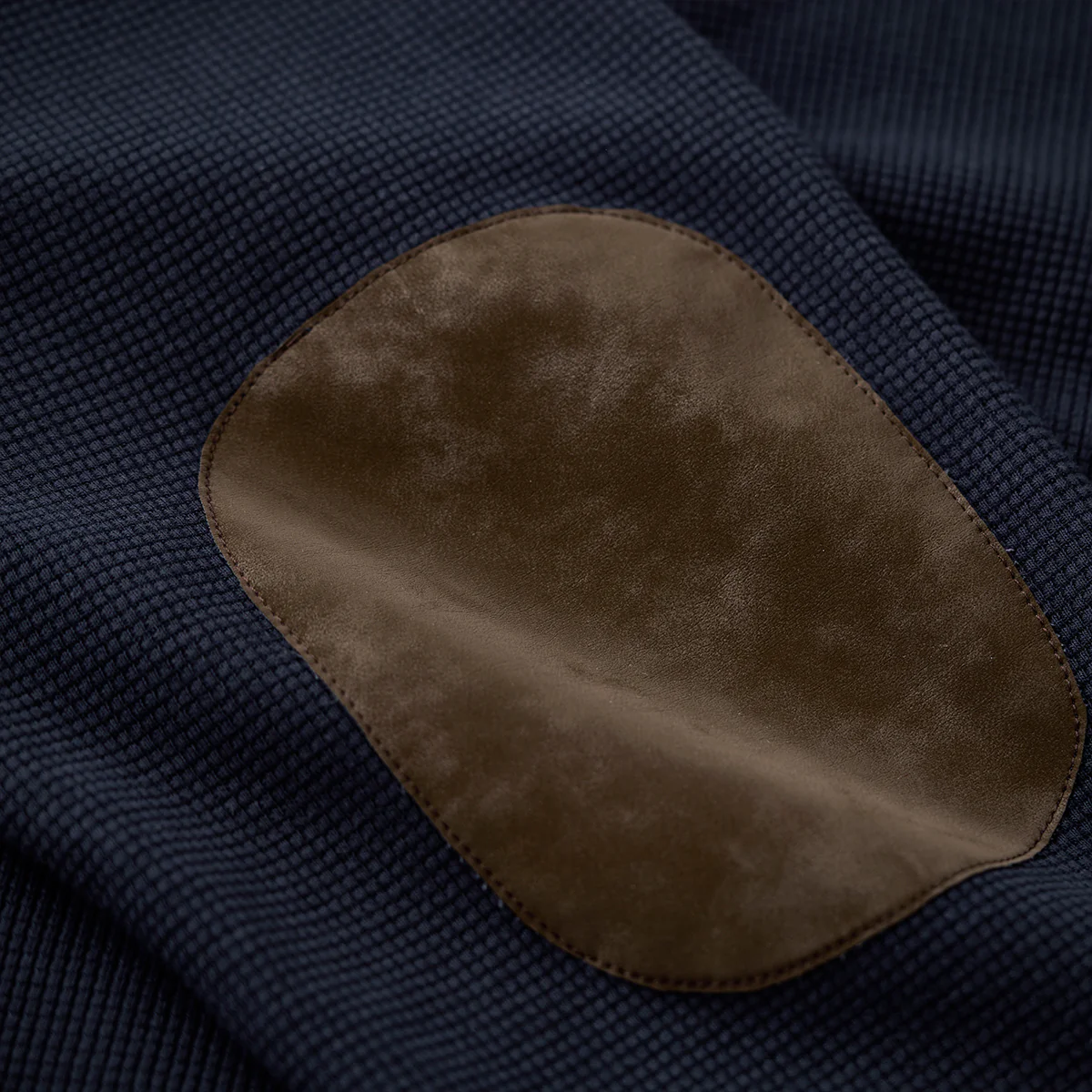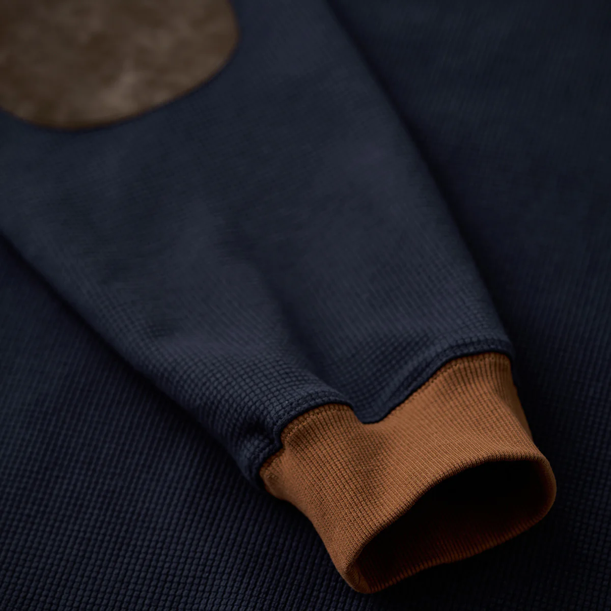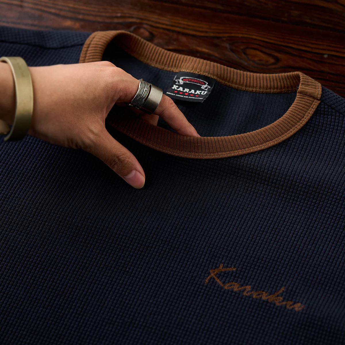 肘にスエードパッチを施し、程よいアクセントと耐久性を兼ね備えたプルオーバースウェット。ワッフル生地を採用し、空気を含んで暖かさを保ちながらも、蒸れにくく快適な着心地を実現しています。胸元には「KaraKu」の刺繡をあしらい、シンプルな中にブランドらしい存在感をプラス。ベーシックなシルエットでデイリーに使いやすく、1枚での着用はもちろん、シャツやアウターとのレイヤードでも活躍する万能アイテムです。