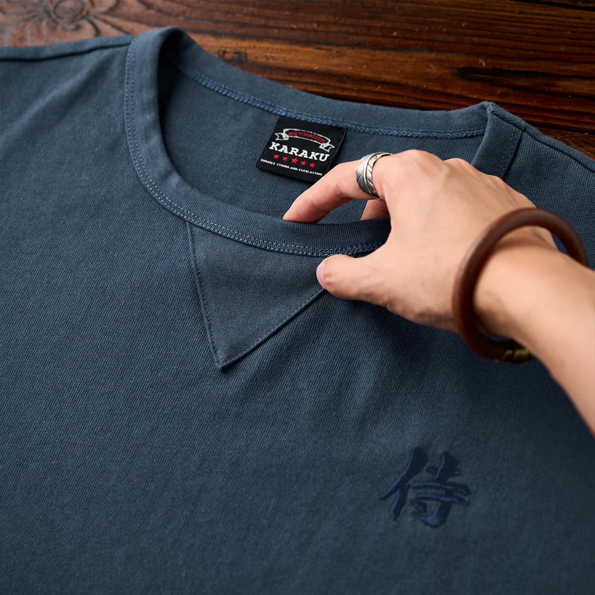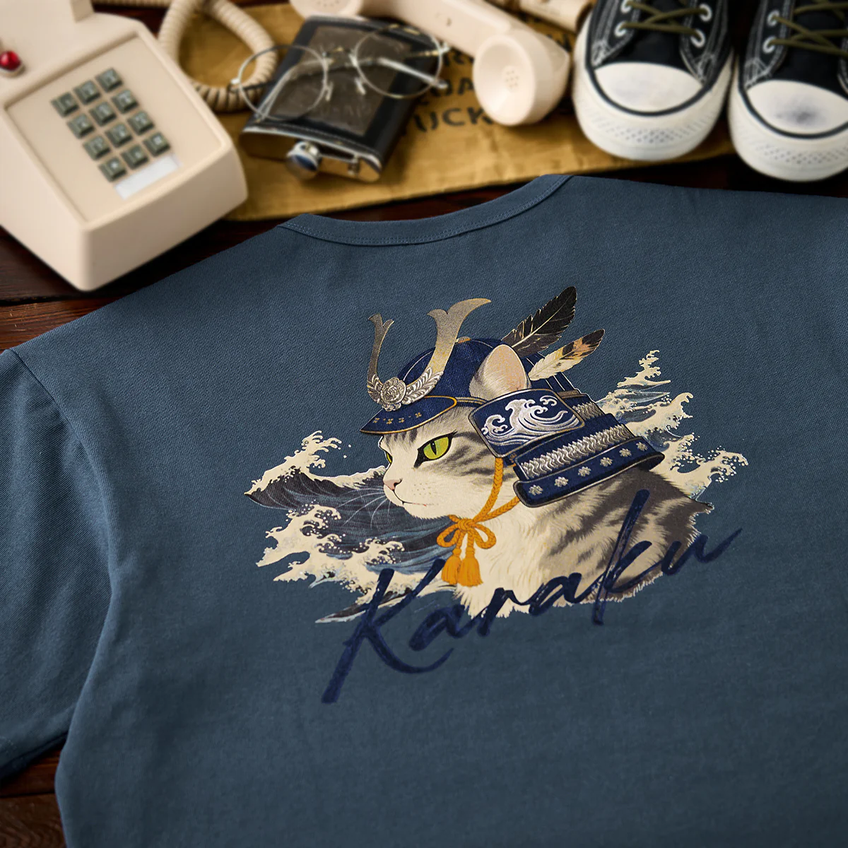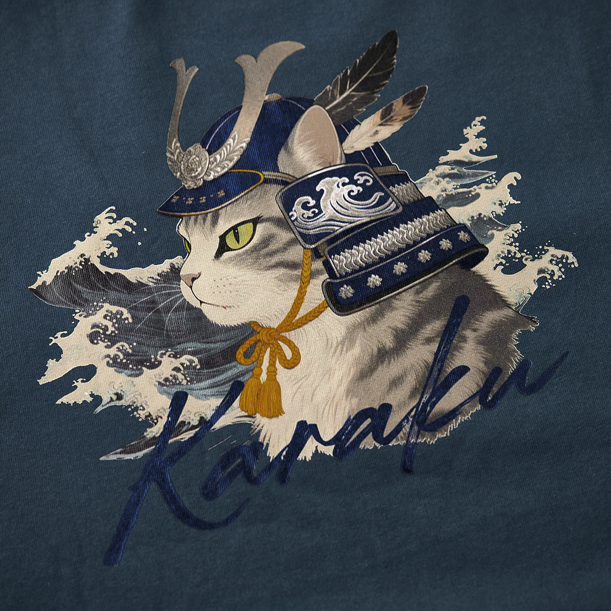 胸元に一文字、「侍」の刺繍。背中には、兜をかぶった猫が凛と立つ――荒れ狂う波を背にしながらも、鋭く前を見据えるその眼差しは、まさに武士の魂を宿す存在。本作は、柔らかなコットン素材をベースに、ユニークかつ重厚なグラフィックで“猫×侍”の世界観を表現した一枚。ボディは微ワイドシルエットで、リラックス感のある着心地。遊び心と静かな気迫が共存する、karakuならではのストーリーテリングTシャツです。