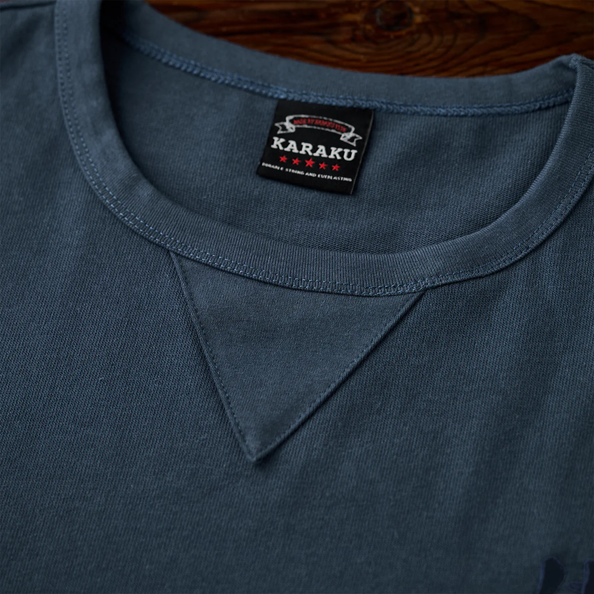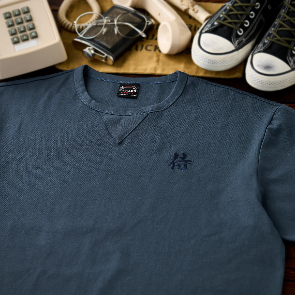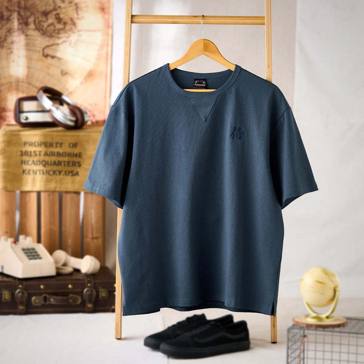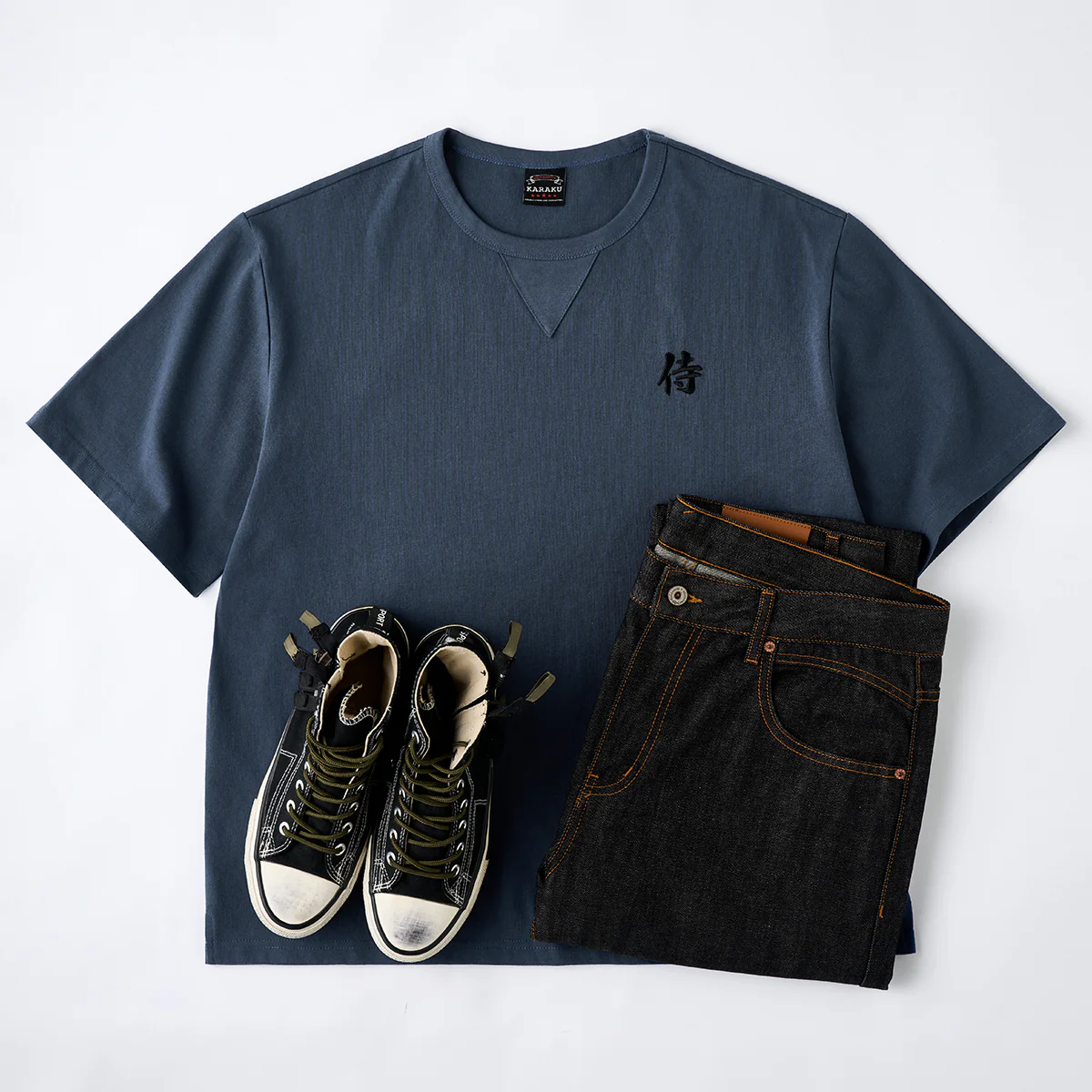 胸元に一文字、「侍」の刺繍。背中には、兜をかぶった猫が凛と立つ――荒れ狂う波を背にしながらも、鋭く前を見据えるその眼差しは、まさに武士の魂を宿す存在。本作は、柔らかなコットン素材をベースに、ユニークかつ重厚なグラフィックで“猫×侍”の世界観を表現した一枚。ボディは微ワイドシルエットで、リラックス感のある着心地。遊び心と静かな気迫が共存する、karakuならではのストーリーテリングTシャツです。