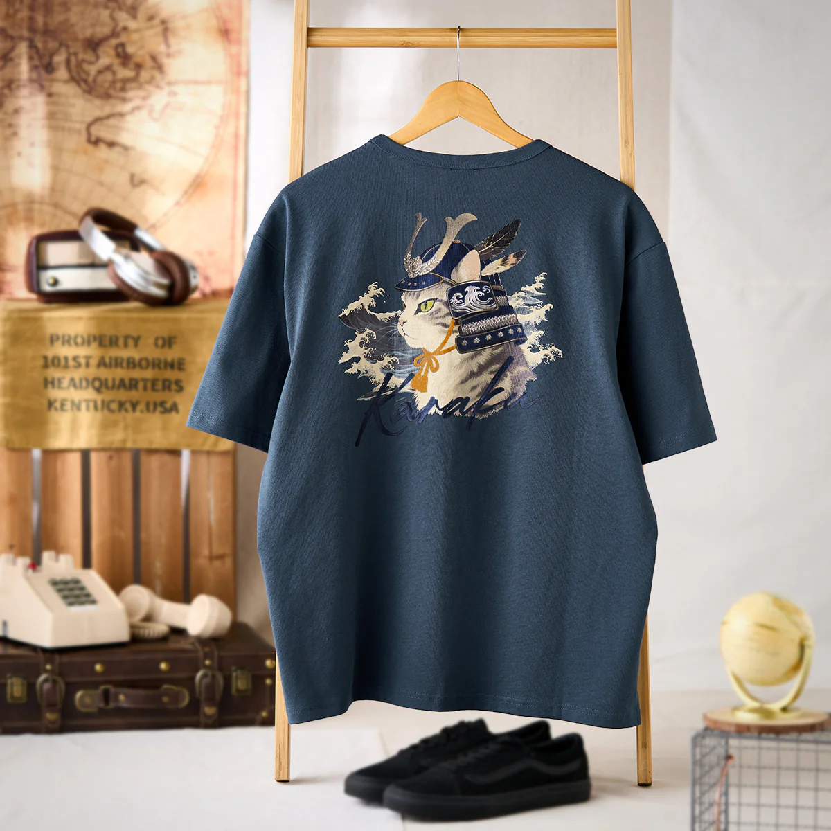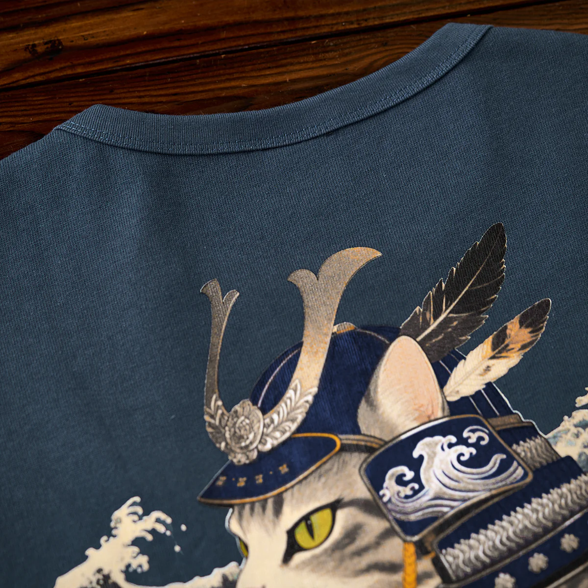 • ワンポイント刺繍「侍魂」武士猫バックプリントコットンTシャツ