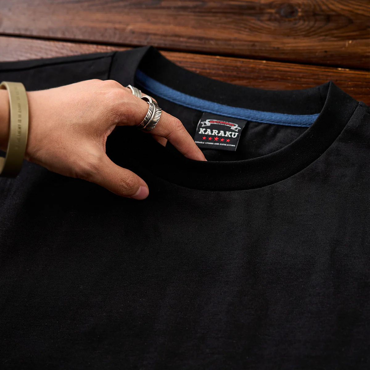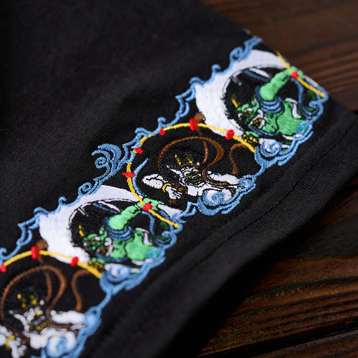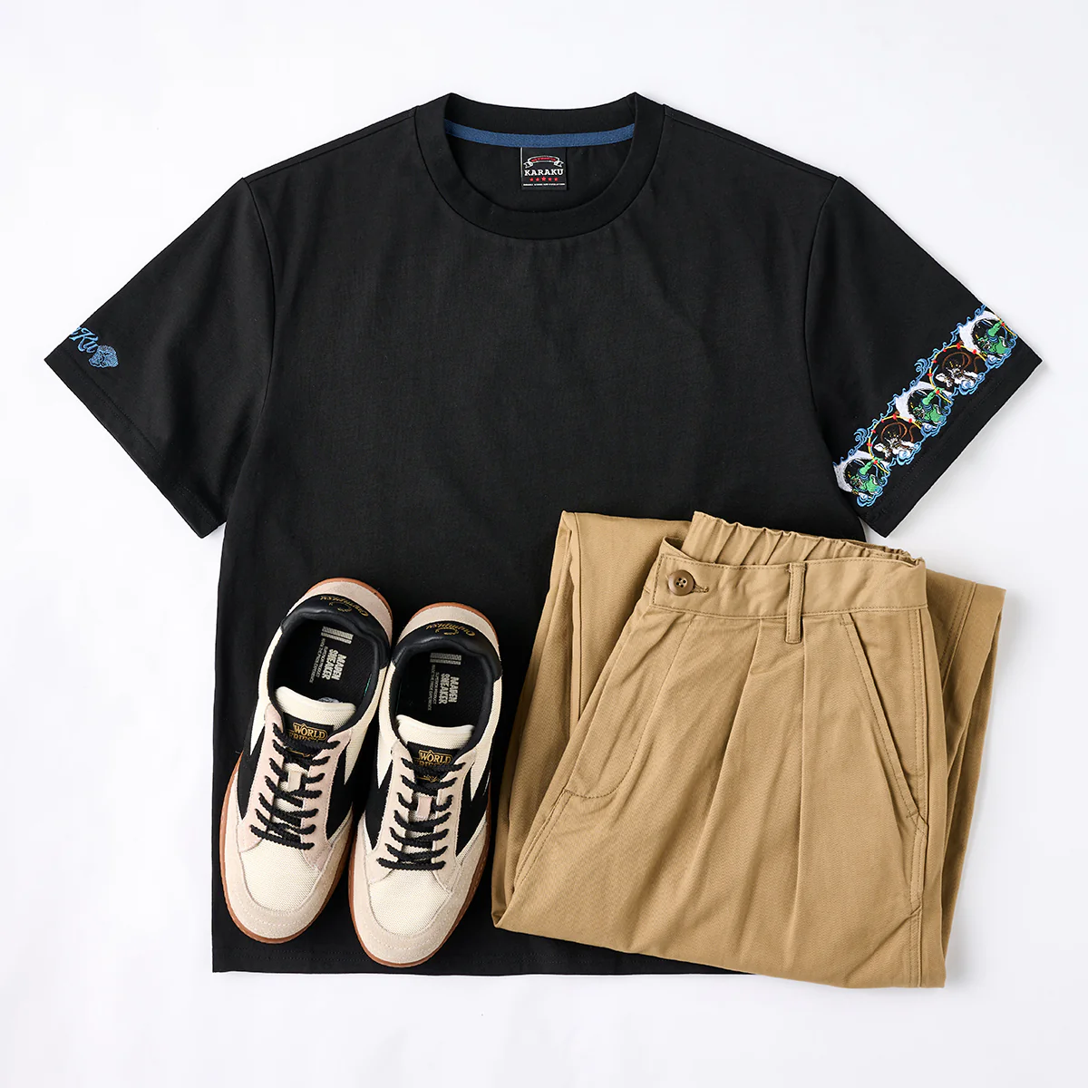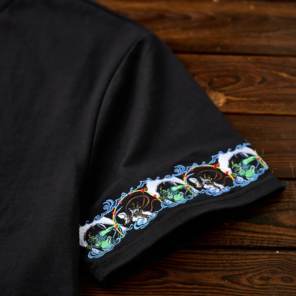 左袖には日本の伝統的なモチーフ「風神雷神」を大胆に刺繍で表現し、インパクトのある一着に仕上げました。右袖にはブランドロゴをさりげなく刺繍し、全体のバランスも絶妙。シンプルなボディに映える左右非対称の刺繍デザインが、個性を引き立てつつも派手すぎず、普段使いからイベントシーンまで幅広く活躍します。一枚で主役級の存在感を放つ、和とストリートが融合した粋な一着。
