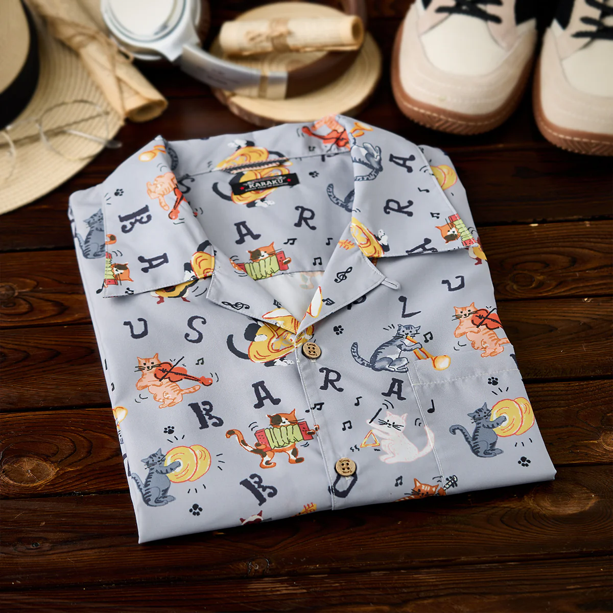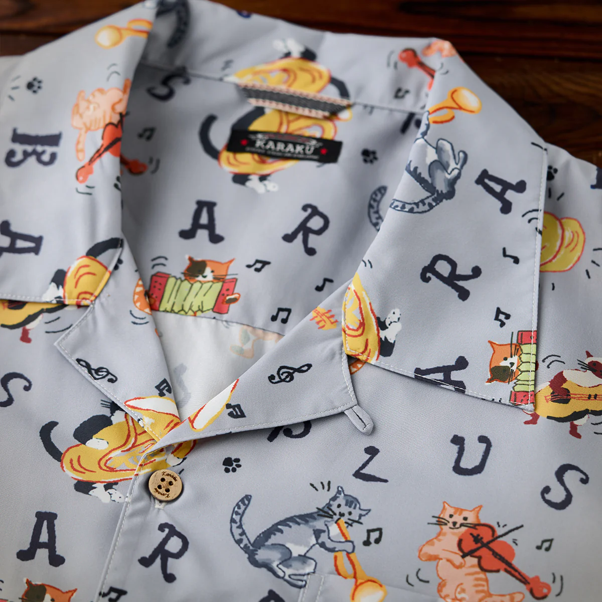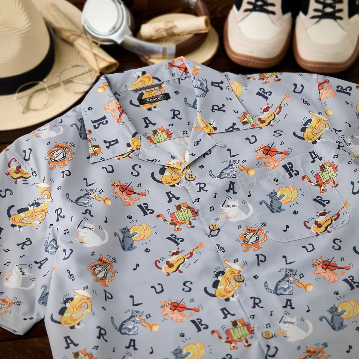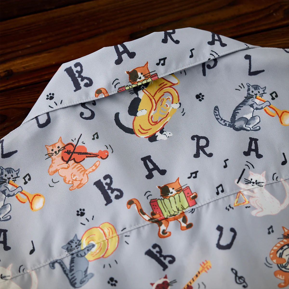 • 「猫ミュージシャンの演奏会」総柄オープンカラーシャツ